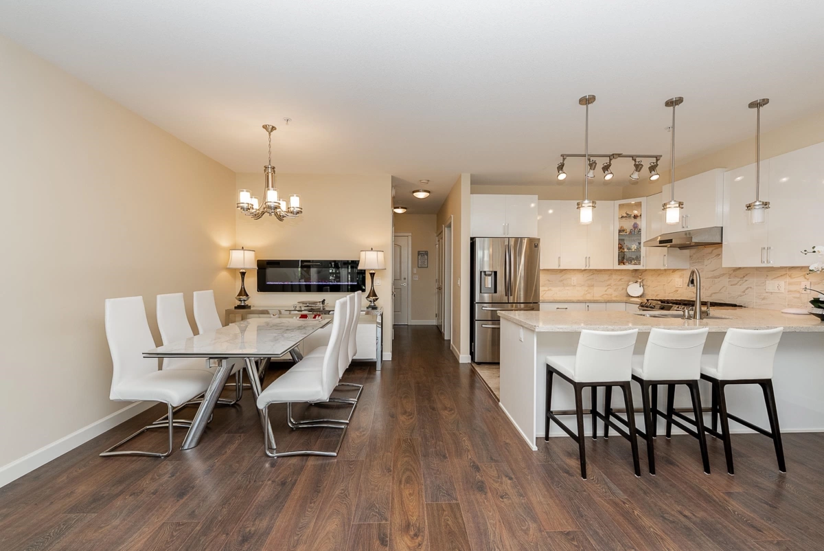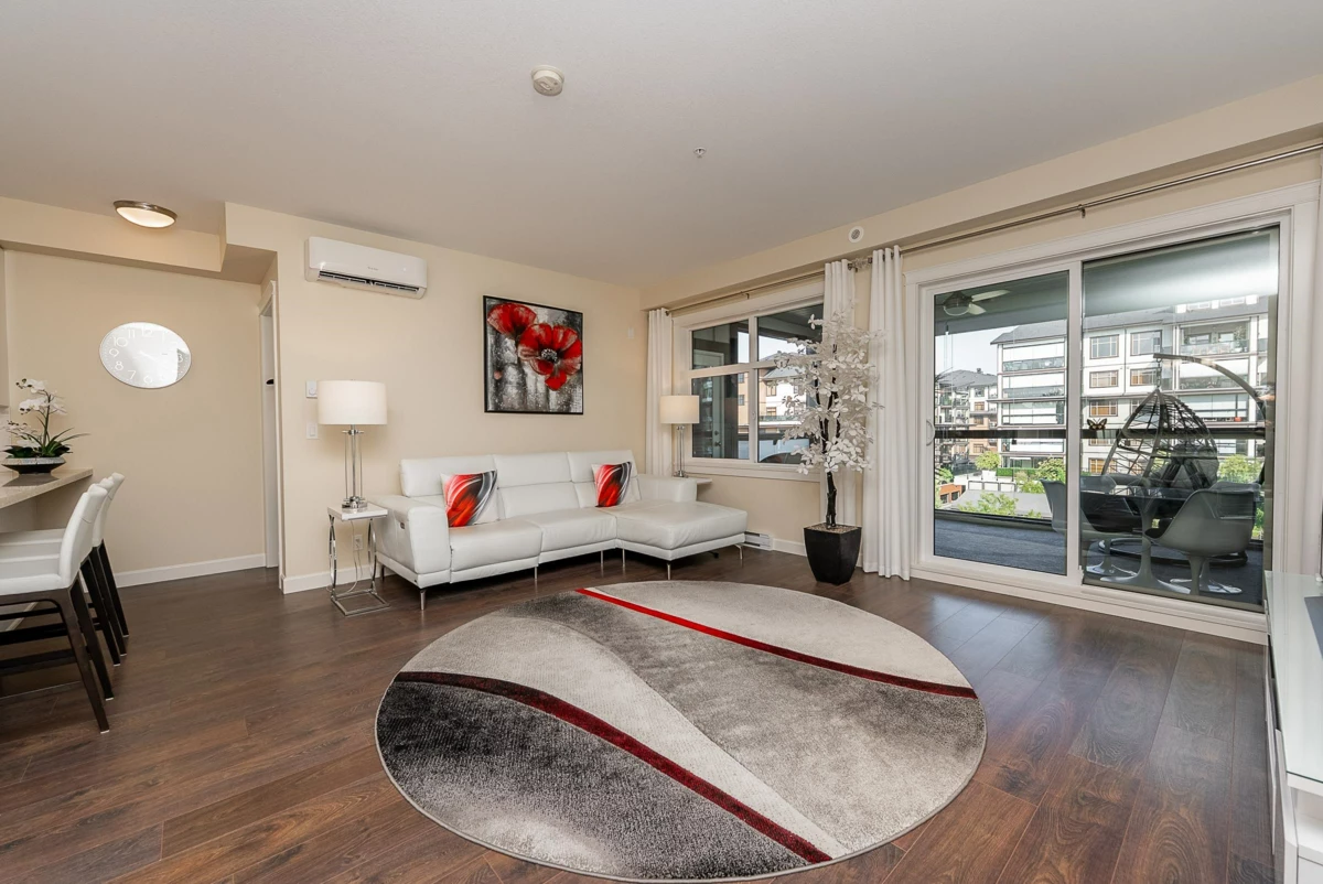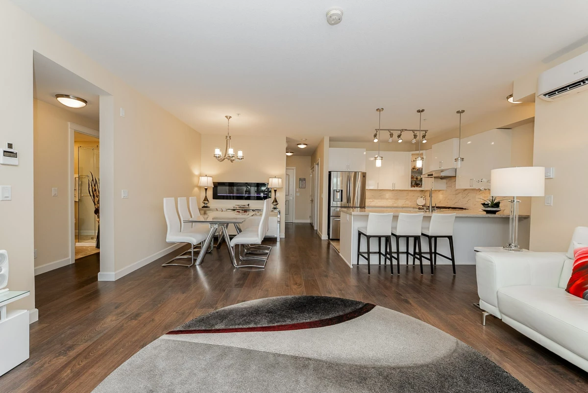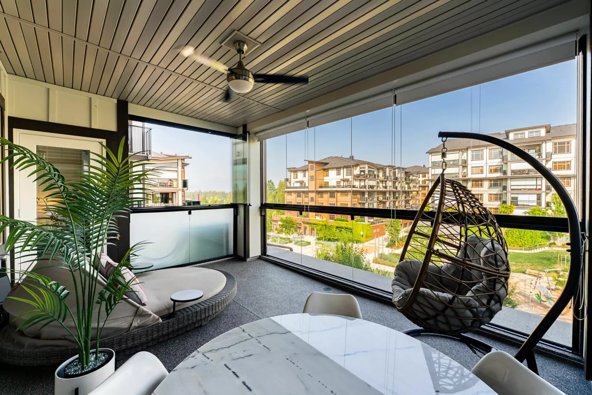 Immaculate and spacious East-facing 3 bedroom + den at sought-after Yorkson Park! Offering 1,583 sq ft of bright and air conditioned living space, plus a 225 sq ft solarium/balcony with retractable glass panels and courtyard views. The gourmet kitchen features a peninsula with seating, gas range and sleek cabinetry, seamlessly connecting to the dining and living area. Designed for year-round enjoyment, the solarium expands your living space. Generous bedrooms include two with luxurious ensuites, double vanities, frameless glass showers, walk-in closets, and access to the solarium. Added features include an energy-efficient heat pump with A/C, gas BBQ hookup, 2 parking stalls, and a storage locker. Conveniently located near Carvolth Exchange, shopping, restaurants, and quick highway access.