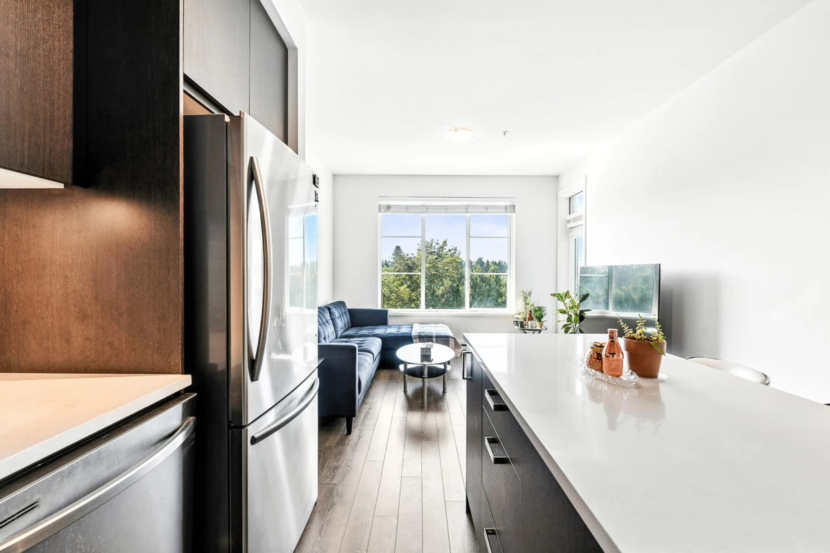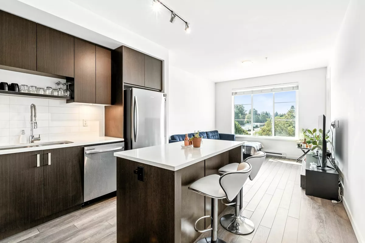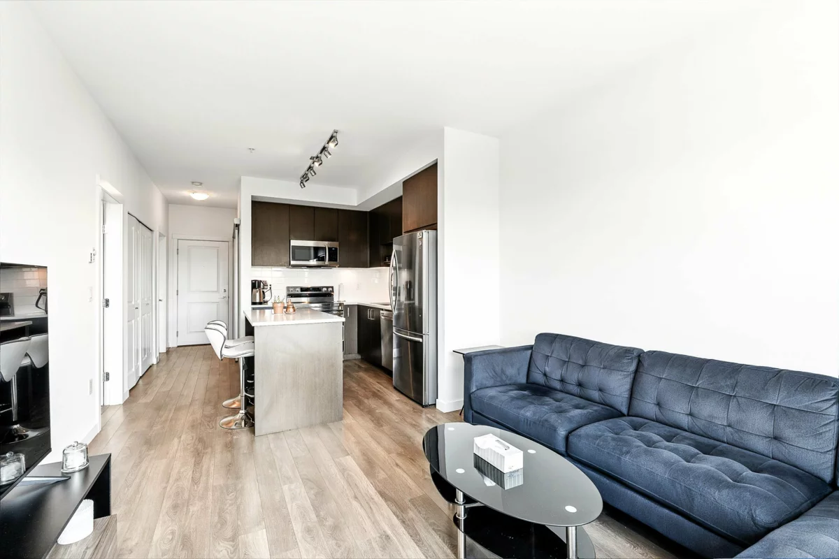 Welcome to Kings Landing II by Dawson + Sawyer! This bright 1 Bed + Den (Jr. Bed) home offers a functional layout with upgraded sliding door for added privacy in the den—perfect for a 2nd bed or home office. The kitchen has been enhanced with a custom island upgrade, stainless steel appliances, and quartz counters. Enjoy a spacious living area that opens to a west-facing balcony with beautiful northwest mountain views, perfect for sunsets! Comes with 1 parking & 1 storage locker. Building amenities include a gym, social lounge, bike room & outdoor garden. Ideally located near Bear Creek Park, Costco, Superstore, restaurants, SFU, and the future UBC Surrey campus. Pet & rental friendly, ideal for first-time buyers or investors!