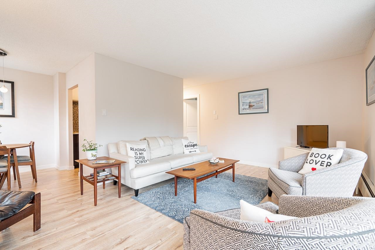 Set within the Woodcroft Hollyburn community, this bright and quiet southeast-facing corner suite is surrounded by 13 acres of beautifully maintained green space in North Vancouver’s Lower Capilano neighbourhood. The home offers a spacious, open layout with a large living and dining area, two generous bedrooms, and a versatile den. Updates include laminate flooring, modern lighting, granite countertops, stainless steel appliances, and a refreshed bathroom vanity. Enjoy a private complex with an active security patrol and underground parking. Building amenities include an indoor pool, hot tub, sauna, fitness centre, bike room, and meeting room. Rentals permitted. Close to shops, transit, recreation, Park Royal, and Grouse Mountain. Open Houses: Both Sat 11 - 1 & Sun 2-4pm.