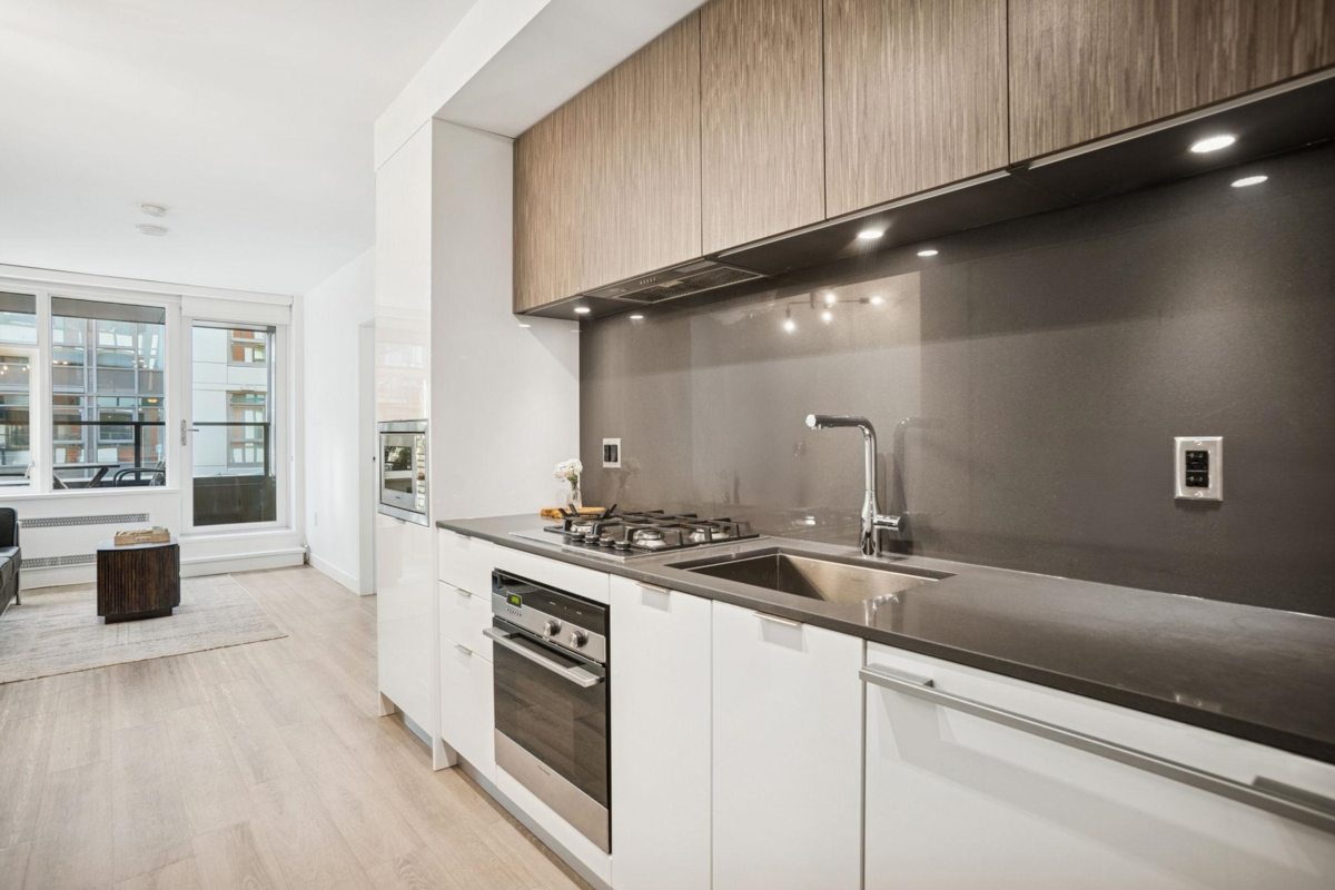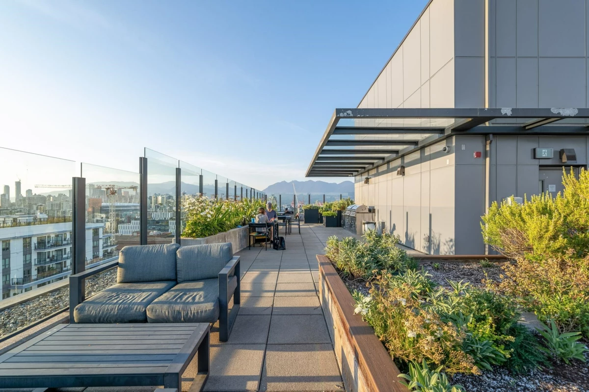 Welcome to ELLSWORTH! Efficiently designed 1 bed + den, 1 bath home offering 570 sq ft of well-planned living space in a LEED-certified concrete building is a show stopper! LOCATED ON THE QUIET SIDE OF THE BUILDING features include integrated appliances, quartz countertops, marble accents, a walk-in closet, convenient side-by-side laundry & a 36 sq ft patio. Versatile den perfect for a home office or extra storage (ALSO A STORAGE LOCKER). Exceptional building amenities include a rooftop terrace with panoramic city views, outdoor BBQ with fire pit lounge & a kids’ play area. Located in the heart of Mount Pleasant with a Walk Score of 100, breweries, cafés, restaurants, shops & transit are right outside your door. This is urban living at its best! OPEN SAT, JAN 31, 2-4PM
