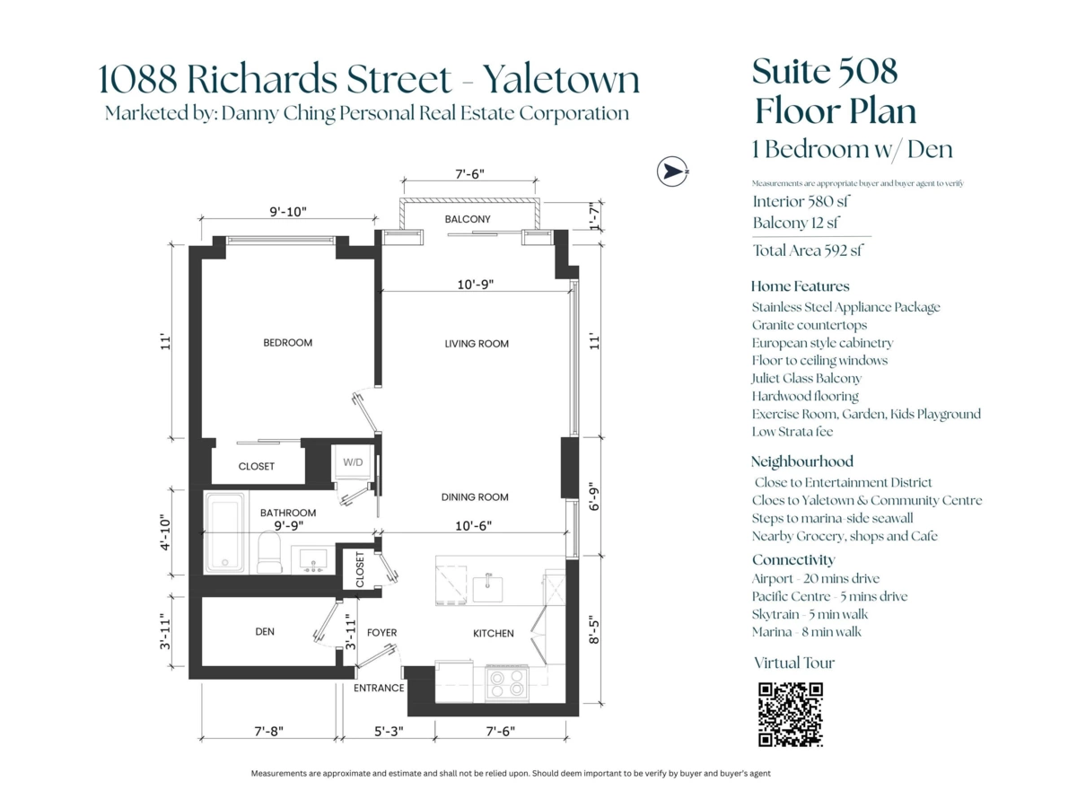 Welcome to Richards Living, one of Vancouver's newest contemporary buildings in the heart of Yaletown. This bright 1 bedroom + den home features an efficient open-concept layout with no wasted space, floor-to-ceiling windows, and a balcony. The chef-inspired kitchen offers stainless steel appliances and granite countertops, with matching granite in the bathroom. The den is ideal for a home office or extra storage. Enjoy great amenities including a rooftop garden, fitness room, bike room, and visitor parking. Includes 1 parking stall. Perfectly positioned on a quiet, residential block with no retail below, yet steps to restaurants, transit, Emery Barnes Park, shops/services, and the Seawall. One of Yaletown's most sought-after buildings. Call your Realtor for a private showing