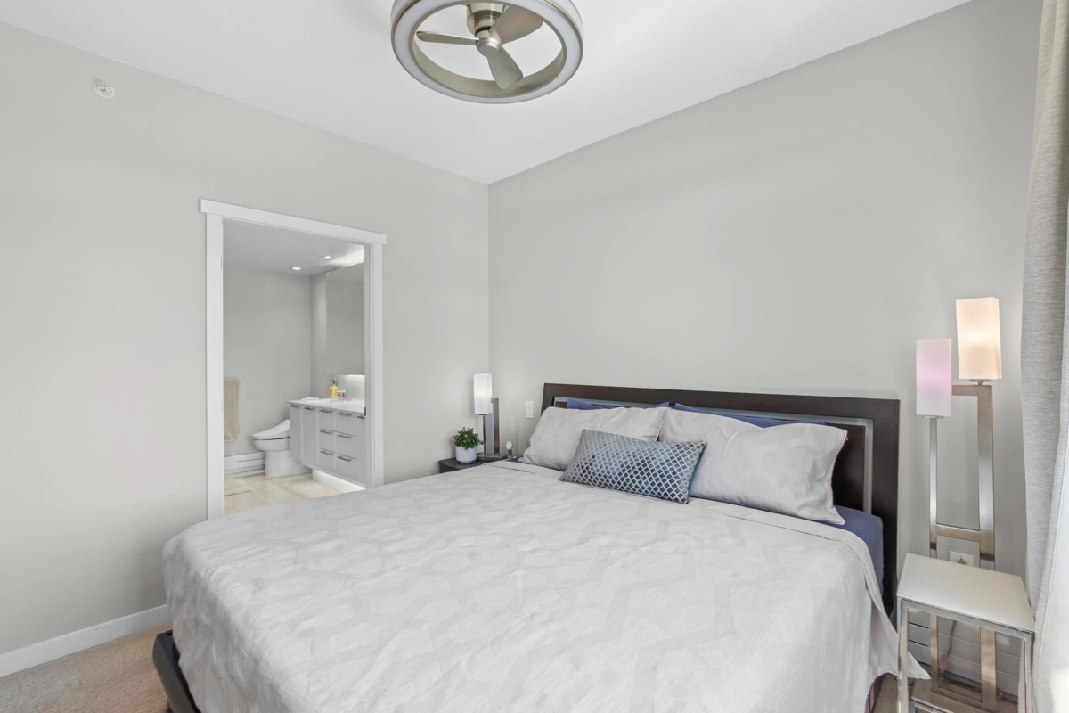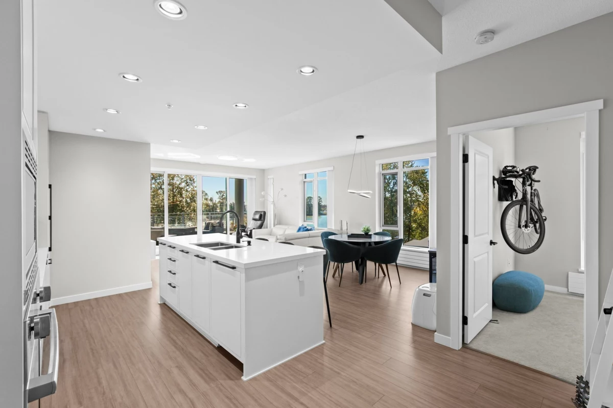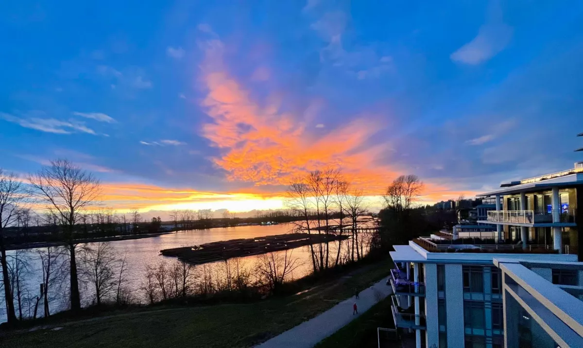 Indulge in breathtaking 180° water views from this pristine corner home, w/ a perfect vantage to revel in the outlook of the Fraser River from every room. Spanning a generous 1,138 sqft, discover 2 bedrooms, 2 full baths, & a dedicated office. Relish in the chef-inspired kitchen showcasing a gas stove, high-end Bosch appliances, & a vast island - perfect for entertaining. The primary suite promises relaxation w/ its walk-in closet & resort-style ensuite. Admire the architectural beauty of over-height ceilings & an open, airy design. Embrace outdoor living w/ a 200 sqft South-facing balcony. Enjoy unmatched conveniences: an exclusive storage room on your floor & 2 parking spaces (1 EV). Walk the waterfront trails & enjoy the nearby shops & restaurants.