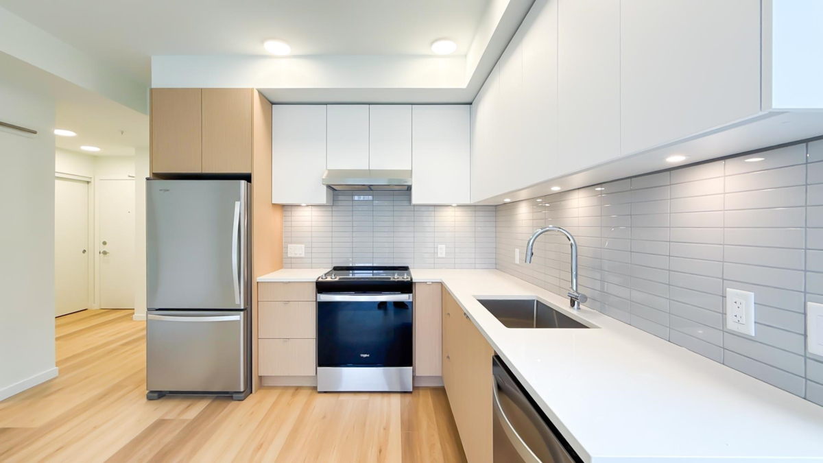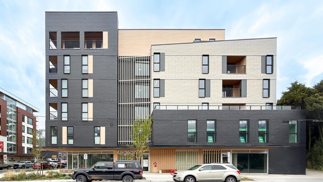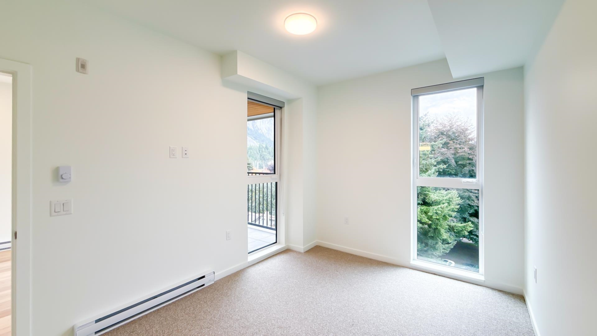 Welcome to The Aegean — a contemporary building in the heart of Downtown Squamish. This NEW bright CORNER 2-bedroom, 2-bath residence features an open-concept living area with floor-to-ceiling windows framing sweeping mountain views. The kitchen boasts quartz counters and full-size stainless steel appliances. Enjoy a private balcony, separated bedrooms for added privacy, and an ensuite bathroom with a frameless glass shower. The spacious den with a barn-door enclosure is perfect for the home office or an extra bedroom. Residents benefit from an open amenity room, secure underground parking and bike storage. Steps to shops, cafes, transit, and trails - perfect for active, connected mountain living. Some images virtually staged.