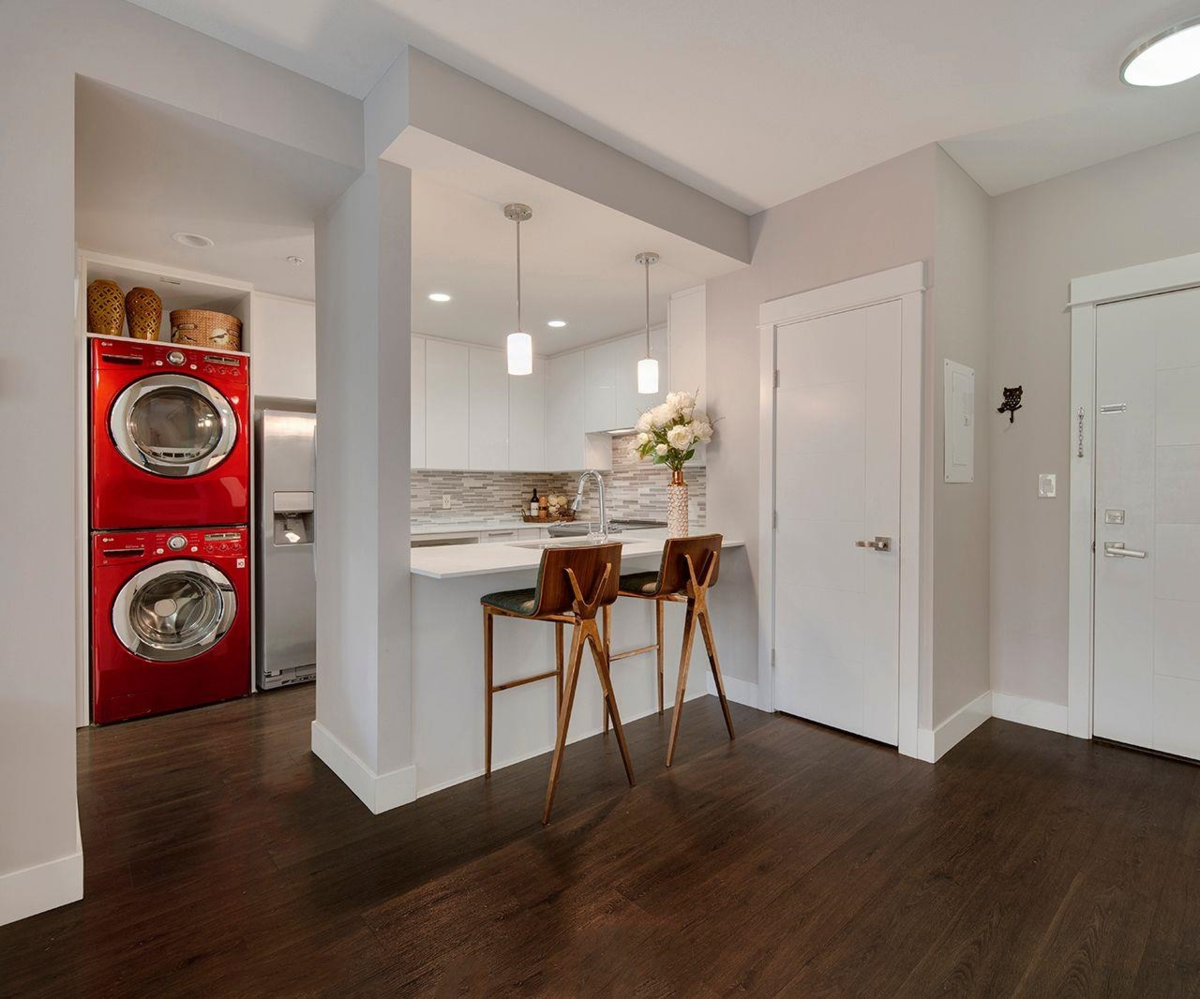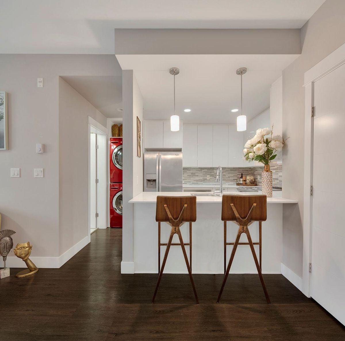 This bright 5th-floor A Plan home offers a stylish breakfast bar, cheater ensuite, and a convenient walk-through closet. Enjoy quartz countertops, stainless steel appliances, laminate flooring, and open-concept living - all standard features in every residence. Perfectly positioned along Port Coquitlam 's scenic Traboulay PoCo Trail and Gates Park, Riverside brings nature right to your doorstep. Take a leisurely walk to historic downtown PoCo and explore its charming cafes, boutiques, restaurants, and vibrant nightlife.