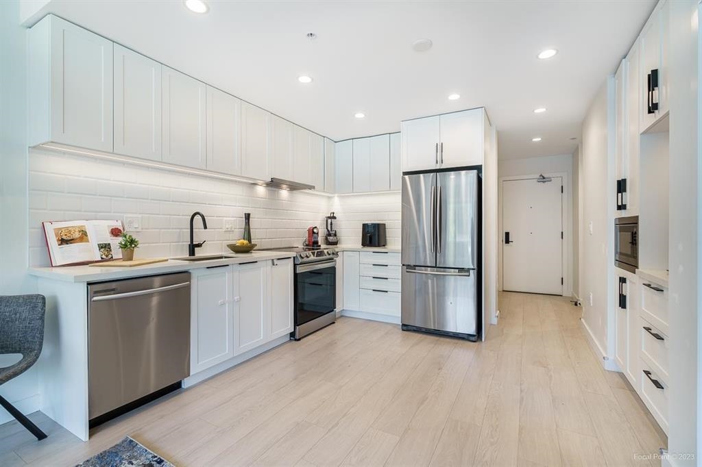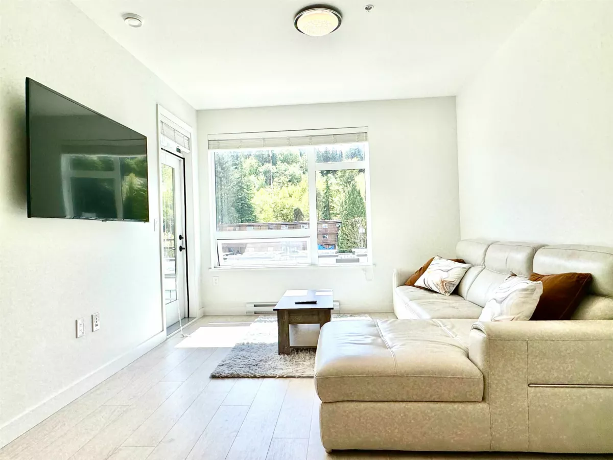 Beautiful South-facing 1-bedroom + den in the heart of Port Moody. This bright home features an open-concept kitchen, dining , living area with large windows and balcony facing open view to the North with plenty of trees. Finishing includes great size kitchen with full size appliances, stone countertop in kitchen & bathroom, laminate flooring throughout , and a built-in wall safe in the closet. Amenities include lounge, courtyard with BBQ & firepit, kids area , bike room, workshop, pet wash and car wash. Step from Moody Centre Skytrain, West Coast Express, Rocky Point Park's trails, Ecole Moody Middle School and Port Moody Secondary. Shop and dine at Suter Brook, New Port Village or Brewery's Row. Includes 1 parking, 1 locker & access to EV charging. Pets & rental friendly.