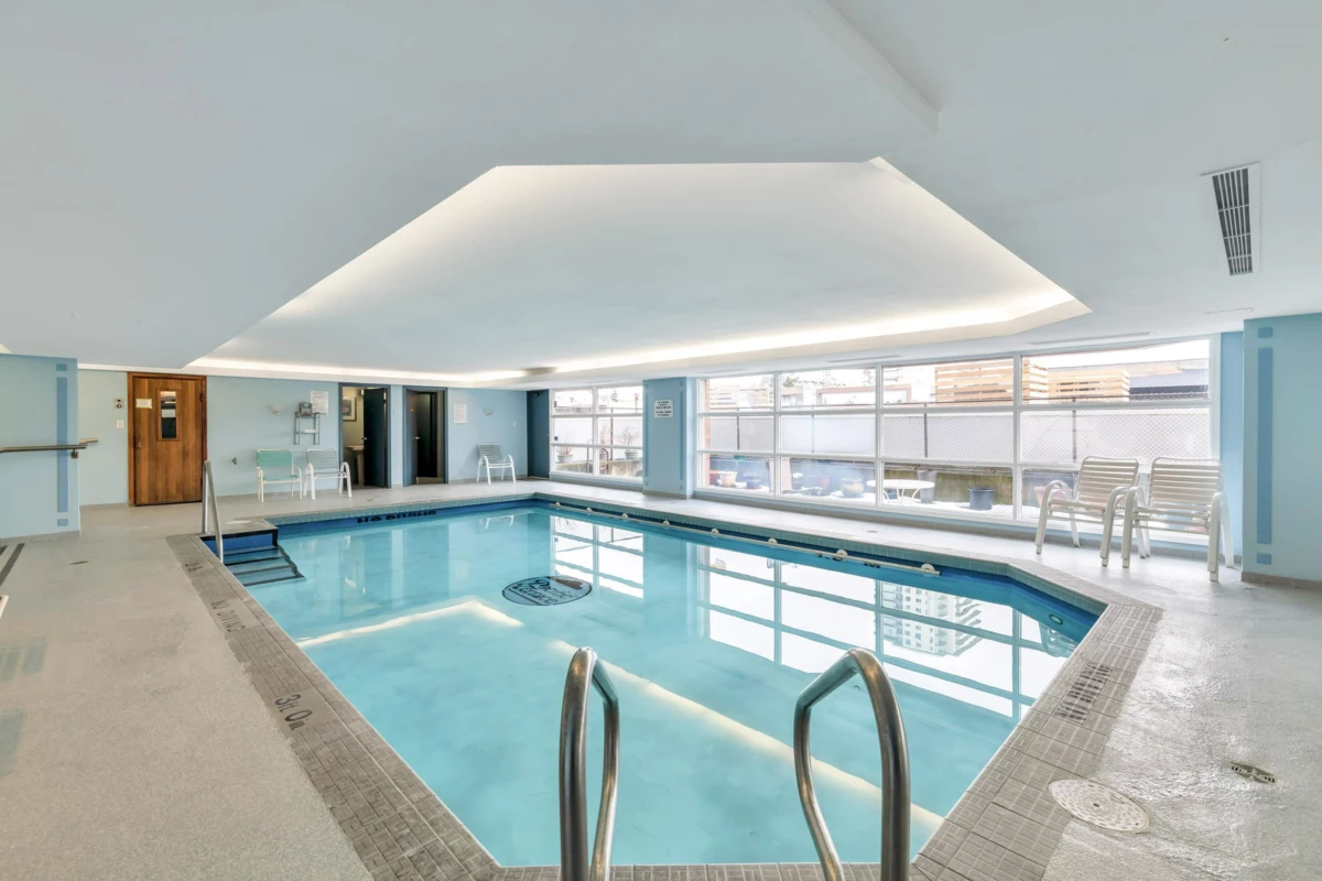 Pacific Terrace is the premier concrete building with heated indoor pool, hot tub, sauna, rec room, guest suite, gym, roof top terrace, bike room, workshop, library, grand lobby with piano, caretaker and more. This one bedroom, one bath 743 sqft condo has loads of storage area, huge bedroom and living area, enclosed balcony for added year round space.