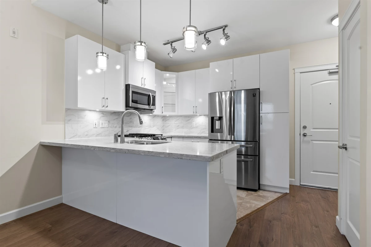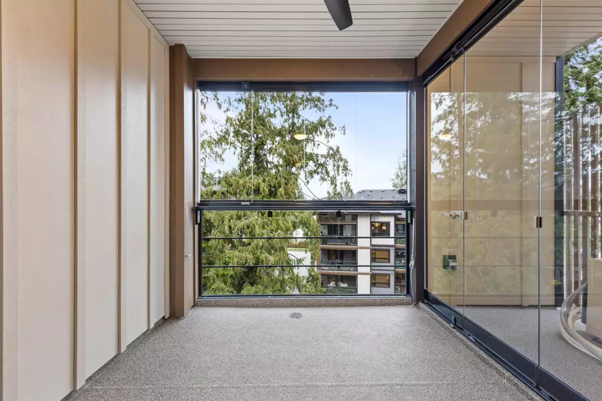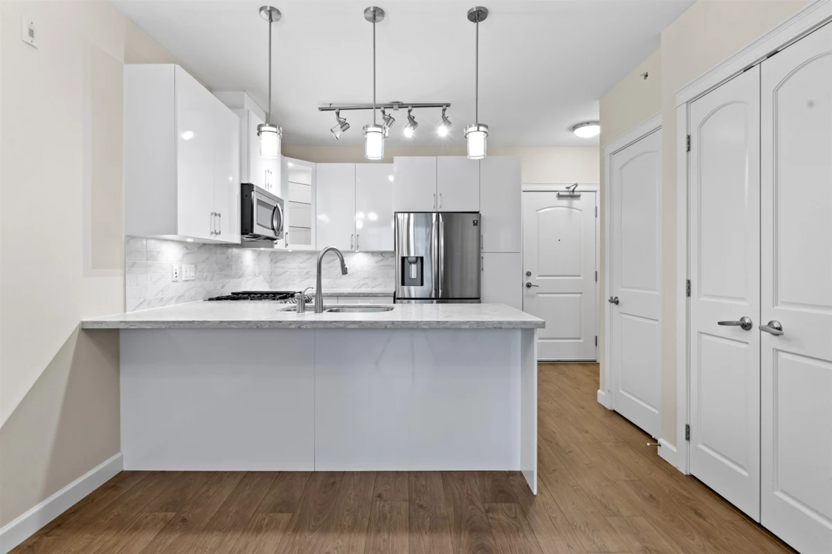 FOREST RIDGE by Quadra Homes. This stylish 1 bed, 1 bath condo includes a 134 sq. ft. solarium with retractable glass and BBQ gas hookup for year-round use. Features a gourmet kitchen with 5-burner gas range, double oven, quartz countertops, and white shaker cabinets, plus 12ft high ceilings throughout. Extras include A/C, energy-efficient heat pump, heated bathroom floors, frameless glass shower, 2 underground parking stalls and a private roll up storage garage with electric outlet capable for electric car charging. Minutes to Crescent Beach, Hwy 99, King George Blvd, and shopping - perfect for comfortable coastal living with urban convenience.