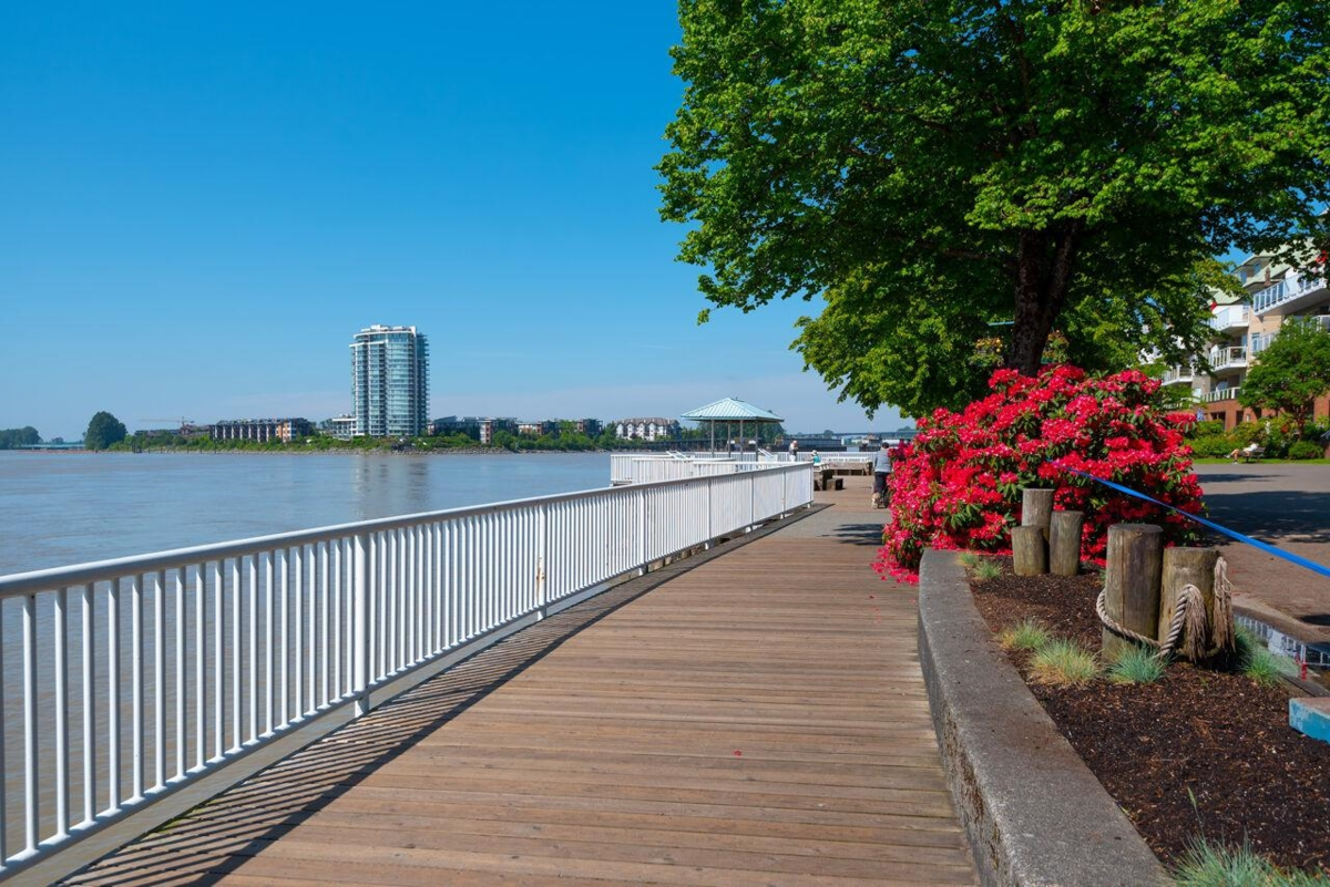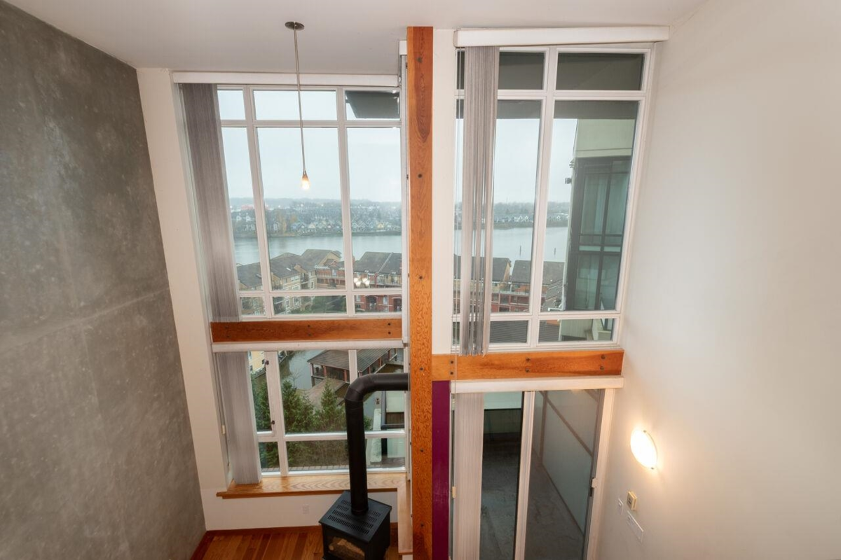 QUIET SIDE, VIEW UNIT in Murano Lofts! Enjoy spectacular sunsets and views of the Fraser River from inside & out! This 2 level home features 16' floor to ceiling windows, reclaimed fir floors, cozy gas fireplace, smart floor plan with great storage, nice balcony, 1.5 bathrooms & spacious kitchen featuring gas range & granite counters. The bedroom upstairs offers views, a walk-in closet, laundry & ensuite bathroom. One parking stall and insuite storage included. Quality concrete building with gym+ guest suite, 2 pets+ rentals allowed. Steps to the riverfront boardwalk, Quayside dog park, River Market, shops, restaurants & Skytrain that will take you from Vancouver to Surrey. The Quay epitomizes relaxed urban convenience! Open House Sat/Sun 2-4pm.
