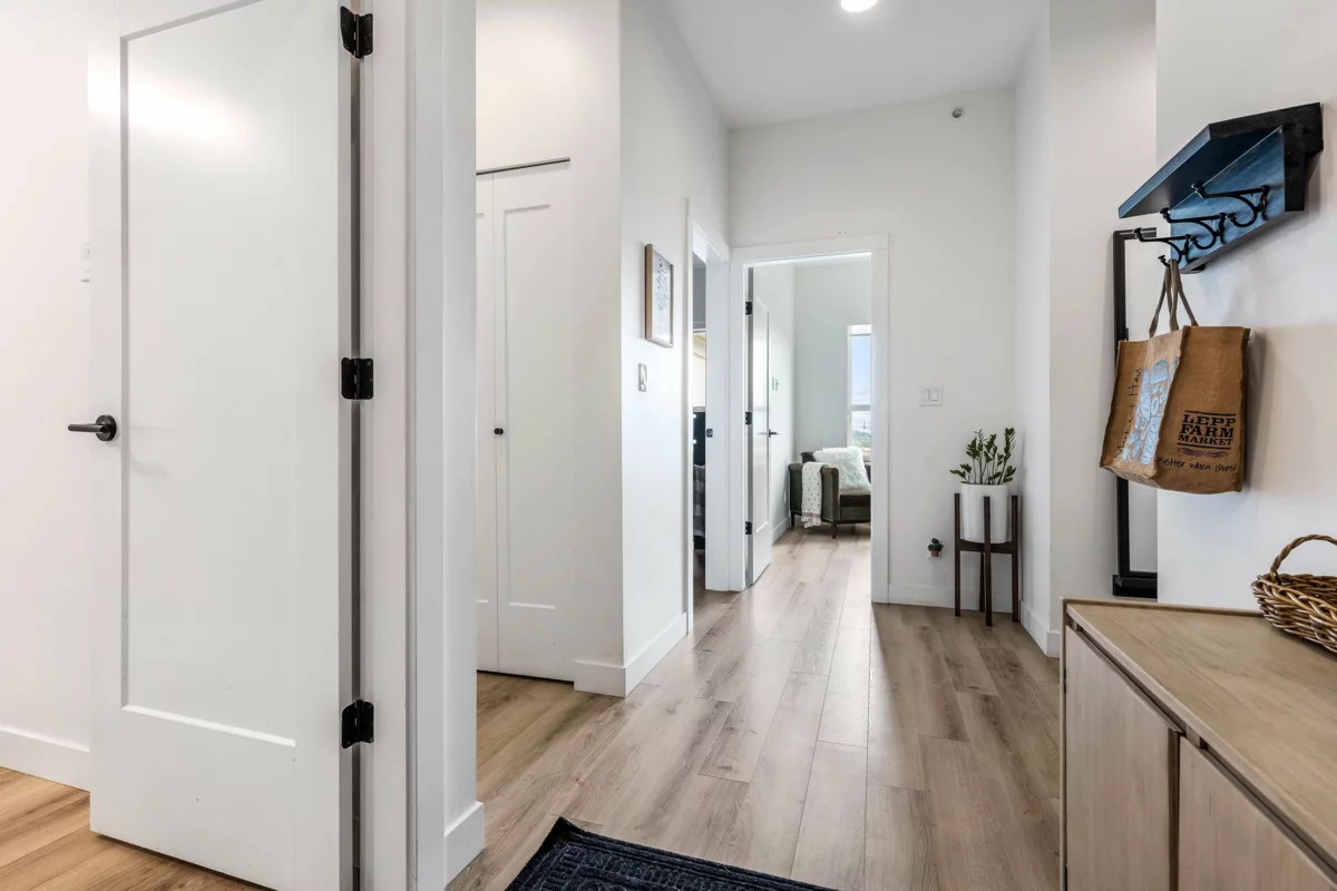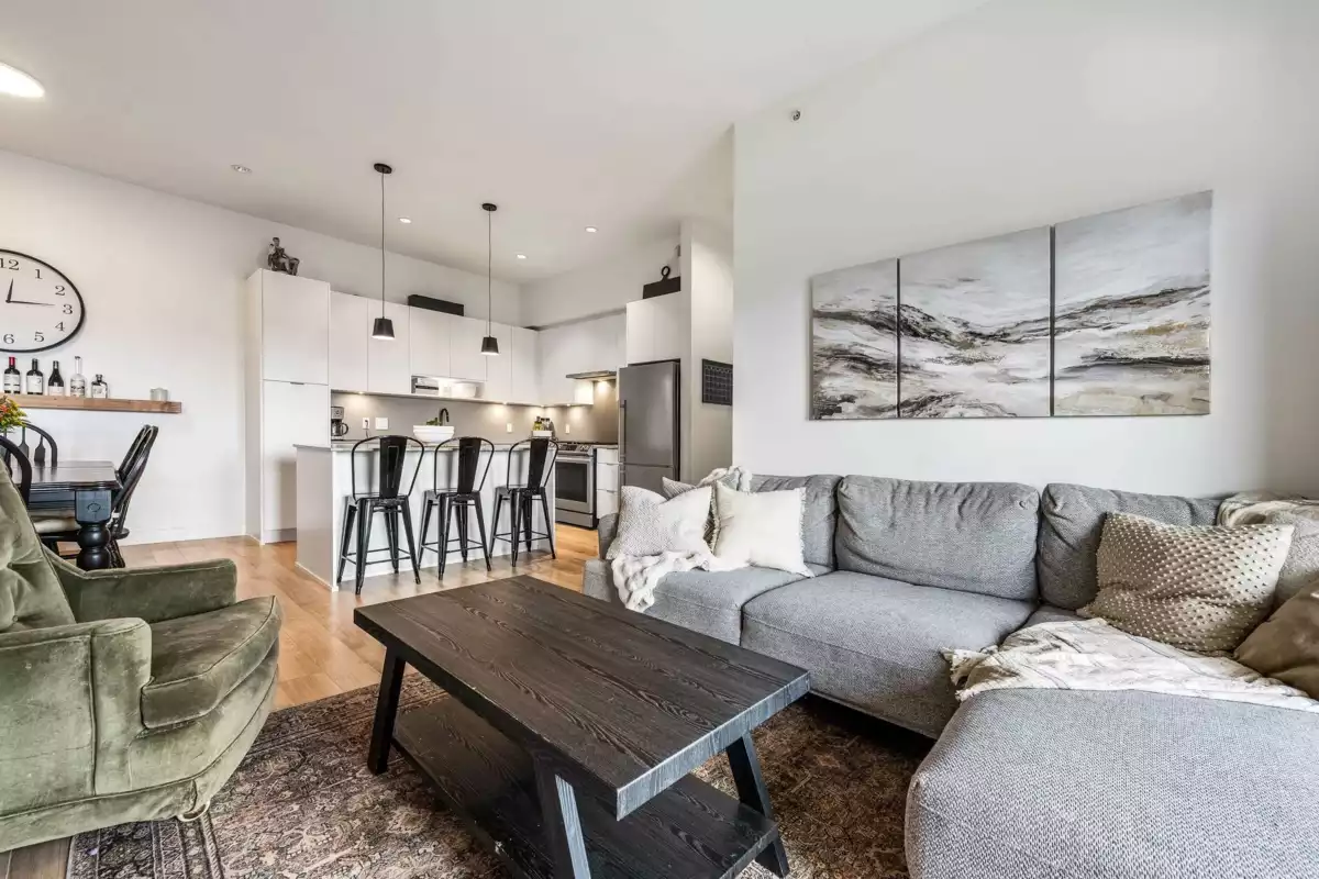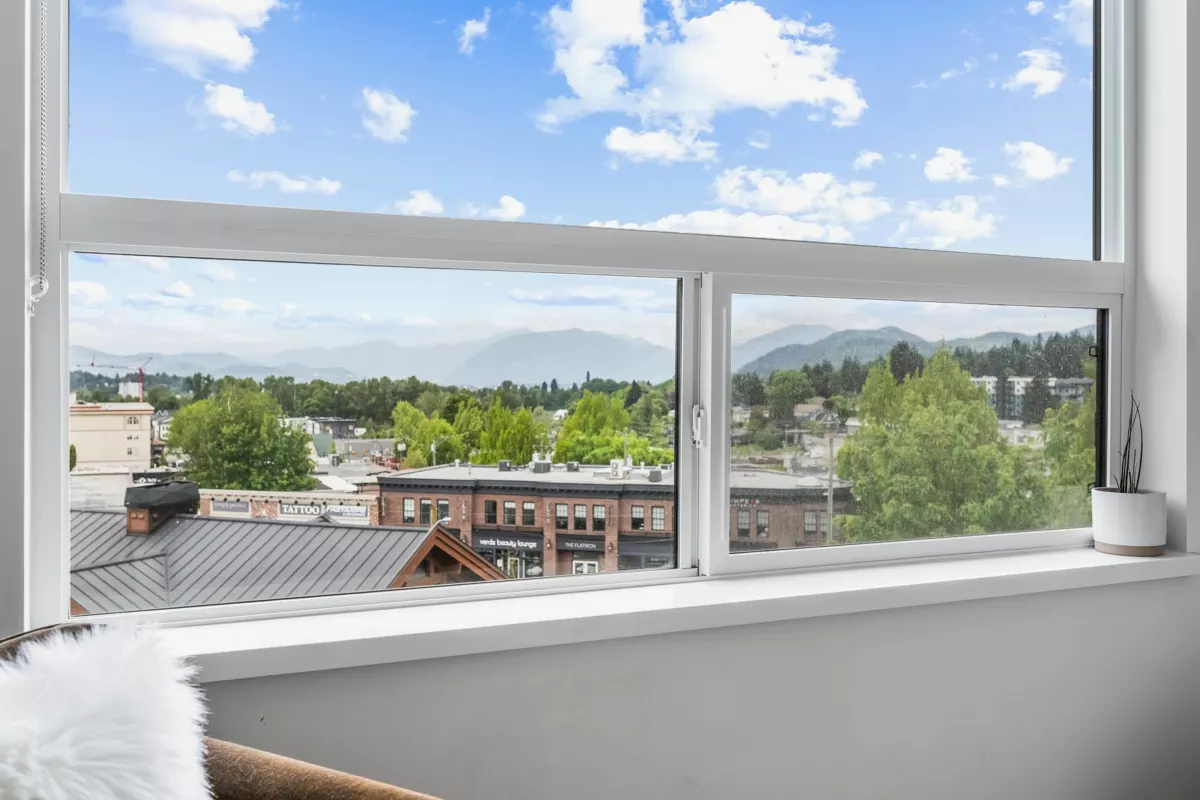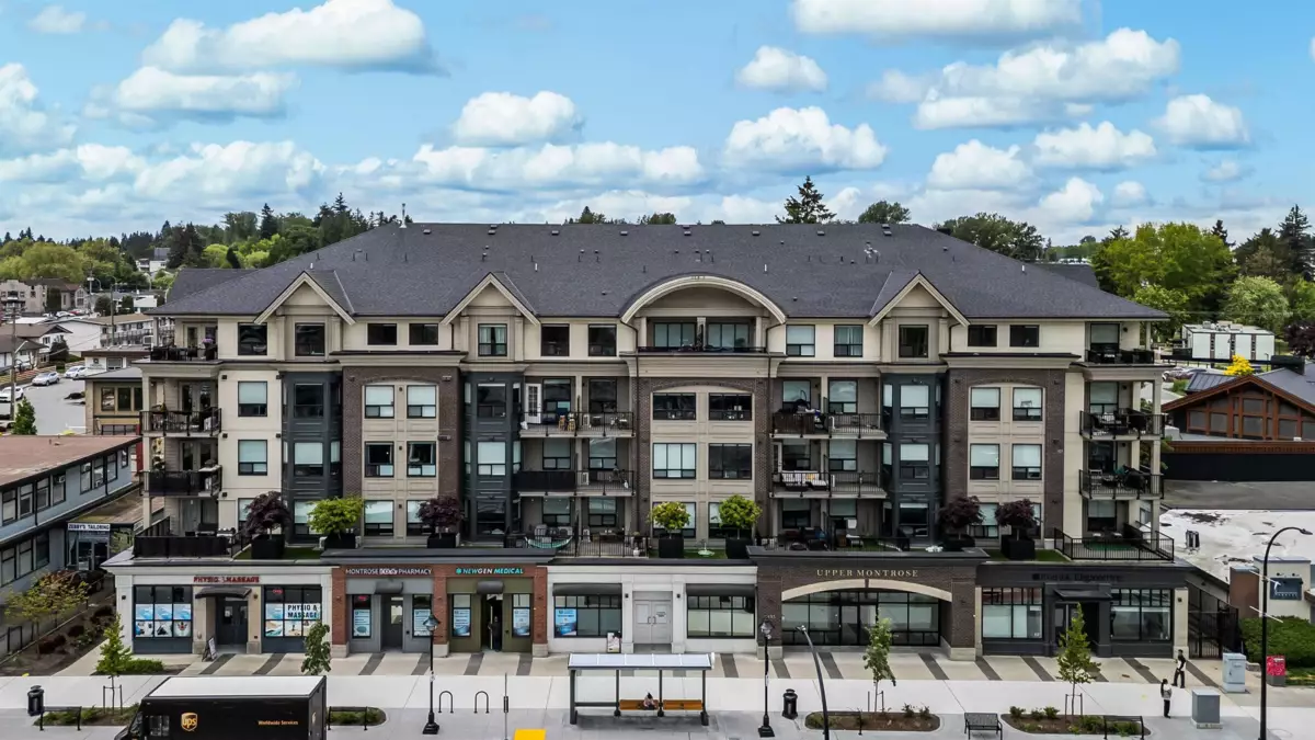 Welcome to Upper Montrose in the heart of downtown Abbotsford! This top-floor 3 bed + den, 2 bath home offers 1,225 sqft of open-concept living with stunning northern views. Features include A/C in the living room and primary bedroom, a gourmet kitchen with quartz counters, stainless appliances, large island, and gas BBQ hookup on the patio. The spacious primary suite boasts walk-through closets and a double-sink ensuite. The versatile den is perfect for a nursery, office, or extra storage. Enjoy 2 parking stalls, family-friendly amenities, and proximity to schools, shops, cafes, gyms, Old Yale Brewing, and the new transit loop.