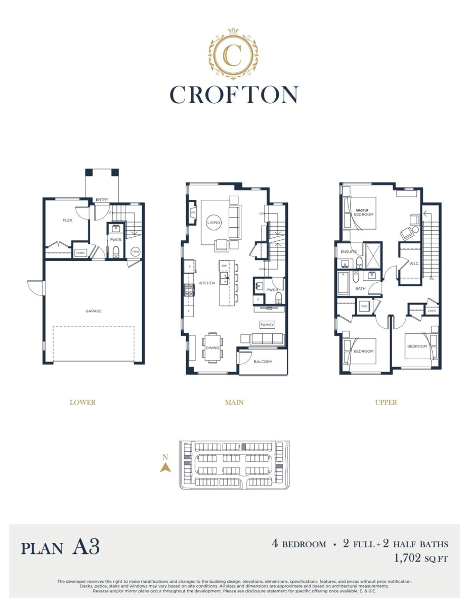 Welcome to CROFTON, the newly constructed final phase in Willoughby Heights by Atrium Developments. Offering some of the largest, move-in ready 3 and 4 bedroom townhomes on the market. Designed for modern families, these homes feature open-concept spacious layouts, bright and stylish interiors, and over-height double-car garages for added convenience. Gorgeous LG kitchen appliances with 5-burner gas range and A/C standard in all homes. Offering a prime location close to top-rated schools, parks, shopping, and transit. Crofton is Langley's BEST value offering the perfect blend space, comfort, and accessibility. Come and view our beautifully staged show homes. Sales Centre open Saturdays, 1–5 PM, or by appointment. Please enter through Home #67.