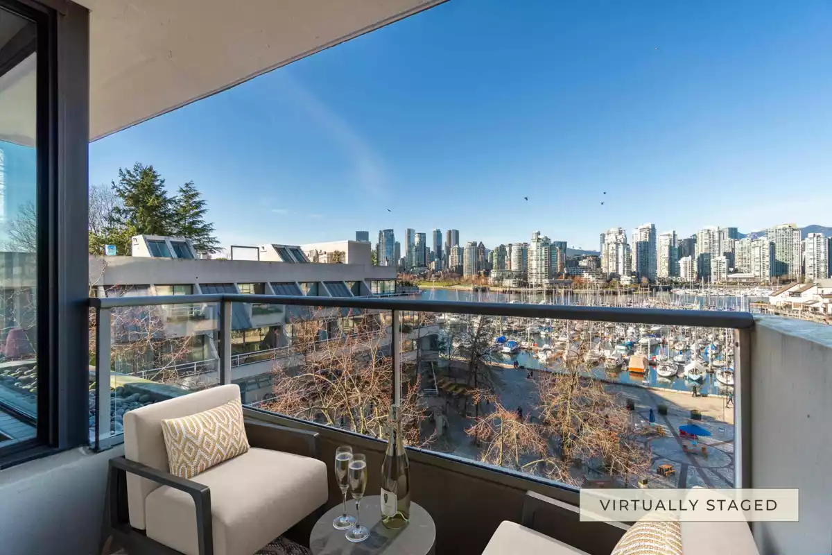 This immaculate waterfront, ocean view, 4-level split, townhouse-style condo is positioned on False Creek Seawall. The 2 bed + versatile den home offers a spacious, living area, enhanced by beautiful hdwd flrs & abundance of natural light. As an end unit, this home features a west-facing window with custom wooden shutters, capturing the evening glow. The wall of windows in the living area frames breathtaking, unobstructed views of the marina, city & mts. Kitchen features s/s appls & boasts a large open view to scenery. Step onto your private patio & soak in serene waterfront ambiance. Home offers roomie bdrms, ample closet & storage space. 1 pkg, pets & rental allowed. Enjoy dining, arts, ent, shopping, & transit at your doorstep.