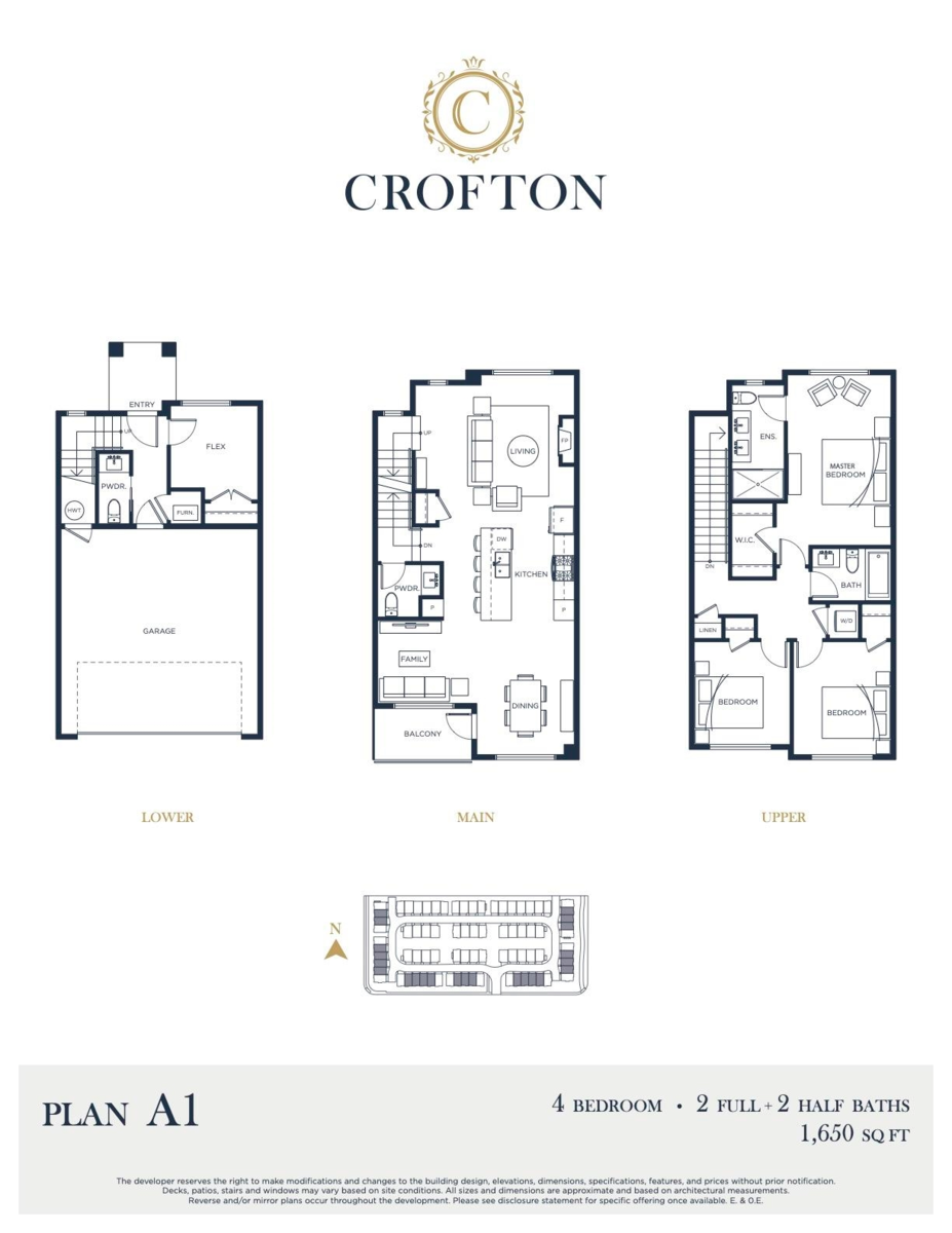 Welcome to CROFTON, the newly constructed final phase in Willoughby Heights by Atrium Developments. Offering some of the largest, move-in ready 3 and 4 bedroom townhomes on the market. Designed for modern families, these homes feature open-concept spacious layouts, bright and stylish interiors, and over-height double-car garages for added convenience. Gorgeous LG kitchen appliances with 5-burner gas range and A/C standard in all homes. Offering a prime location close to top-rated schools, parks, shopping, and transit. Crofton is Langley's BEST value offering the perfect blend space, comfort, and accessibility. Come and view our beautifully staged show homes. Sales Centre open Saturdays, 1–5 PM, or by appointment. Please enter through Home #67.
