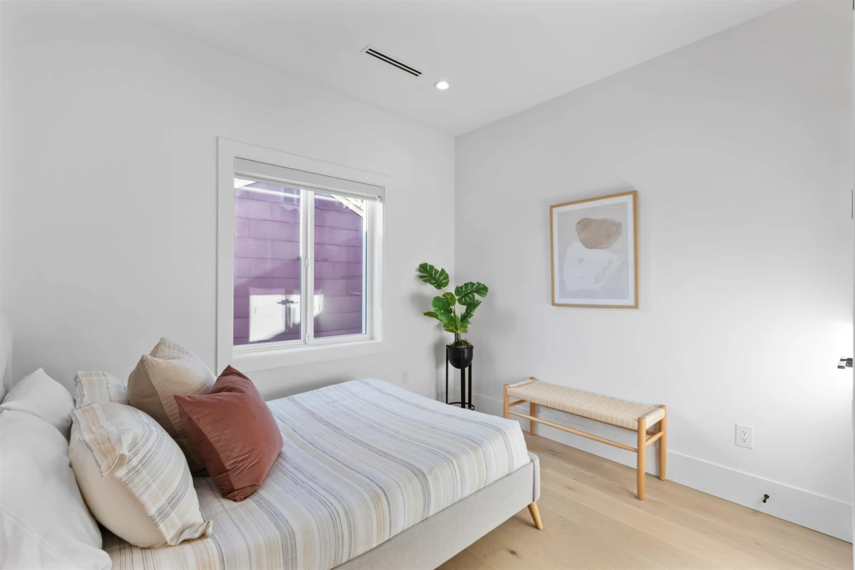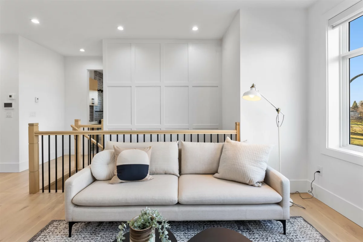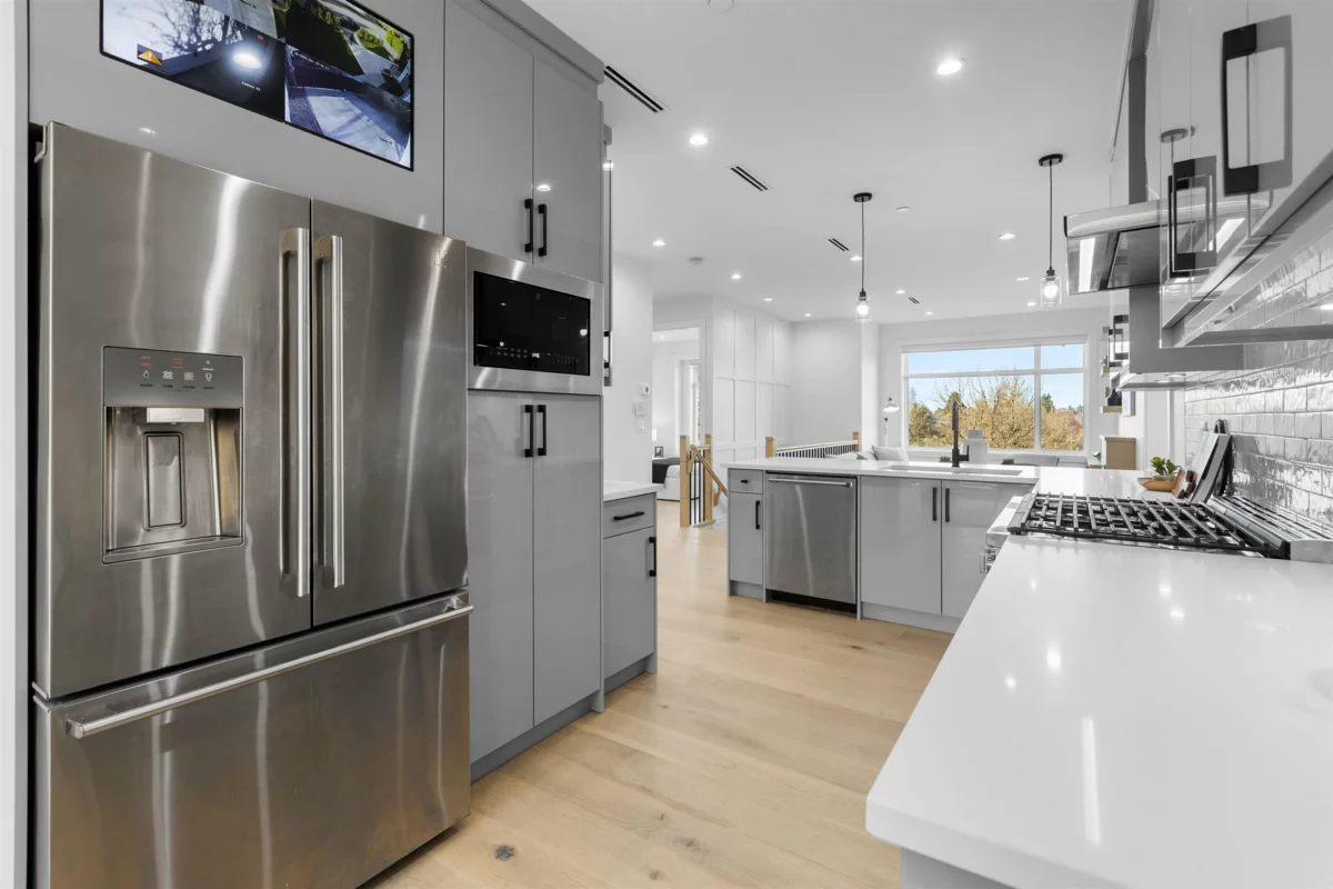 Custom built in 2023, this home offers exceptional quality throughout with Italian tile, radiant in-floor heating, Air Conditioning, and custom millwork. Large windows and a bright exposure fill the home with natural light across every level. The open-concept main floor features a gourmet kitchen that flows onto a 330 sq. ft. covered patio with North Shore mountain views, perfect for seamless indoor/outdoor living. This level also includes the primary bedroom, two additional bedrooms, and two full baths. The lower level offers versatility with a two-bedroom legal suite ideal for family, guests, or rental income. A fully fenced yard with an electric gate, concrete driveway, an attached two-car garage, and a full camera security system complete this well-built home.
