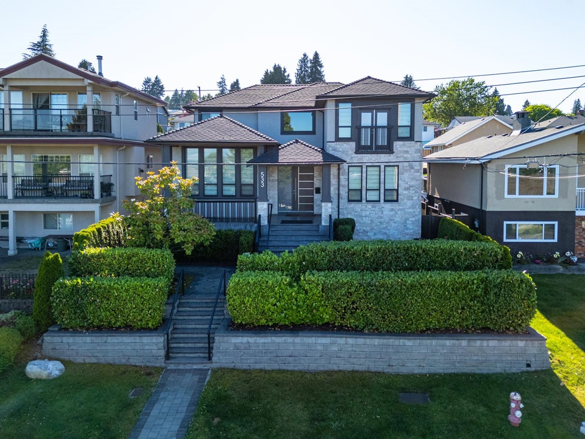 [[[ 3 LEVEL HOUSE WITH RENTAL SUITES & VIEWS ]]] Custom built modern craftsman, designed with practicality in mind. Stunning city, water and mountain views. 5 bed, 4 bath plus a large study. Highly desired Victory Heights neighborhood in New Westminster. Modern kitchen with Bosch appliances with and elegant Quartz Island and a large pantry. Upstairs features a spacious master bedroom with stunning views, large walking closet and an ensuite with Carrara marble. Homes has High Efficiency Heat Pump with AC. Two-bedroom legal suite in the basement, currently rented as a one-bedroom suite and the other room used as a home gym. Backyard is an entertainer’s delight. Two car garage and a carport at the rear with laneway access. Showing by appointment only.