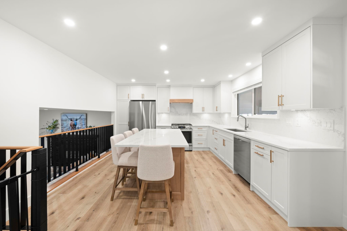 Stunningly updated 4 bed, 3 bth home offering 2805 sq ft of spacious stylish living on a private 9,139 sq ft SUNNY SOUTH LOT!! Brand new gourmet kitchen is a chef's dream, featuring modern finishes and overlooking the bright dining area and cozy living room with gas f/p. French doors lead to a secluded backyard oasis perfect for outdoor entertaining or peaceful relaxation. Separate family room ideal for gatherings, games/media room, endless possibilities. Bonus flex room/office or gym below. Upstairs is a luxurious primary suite and 3 beds plus a huge rec room. Updates- drainage, driveway, patio, fence, siding, windows, French doors, gym, lighting, main bath, kitchen and bar. Walk to schools, transit & town center. Highly ranked schools, beaches and min to border, ferries. Call today!