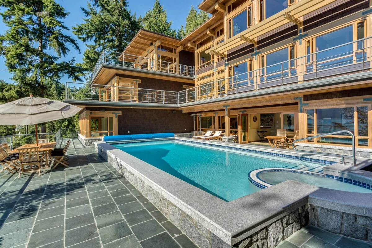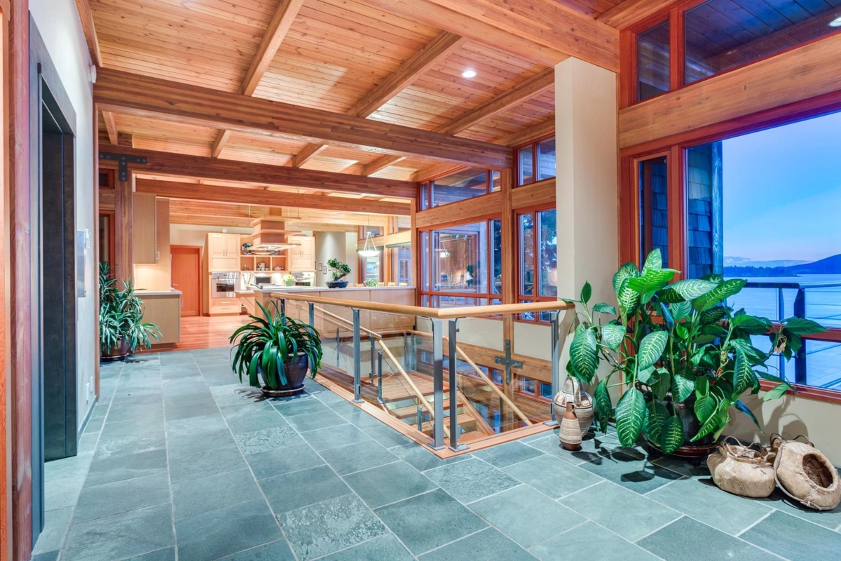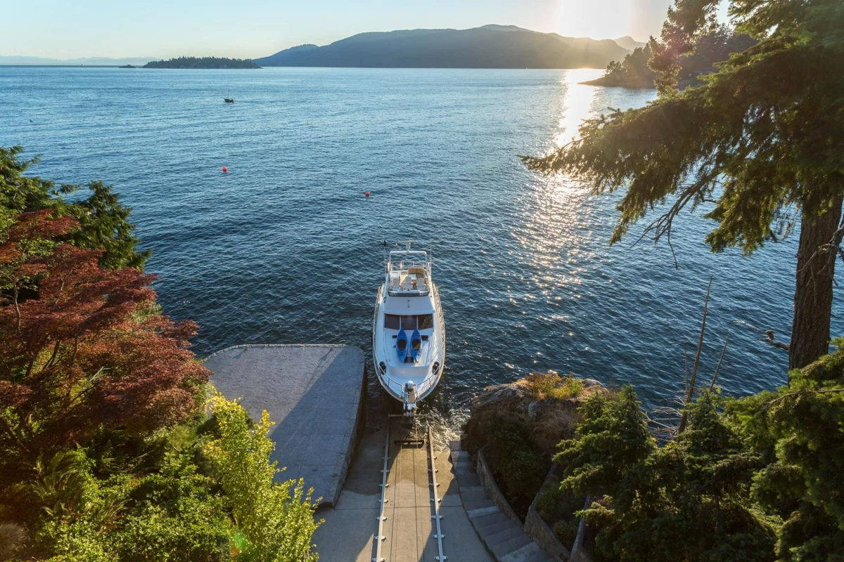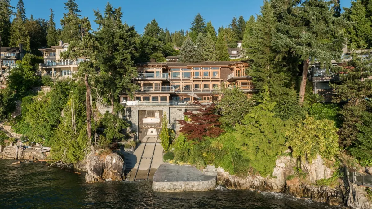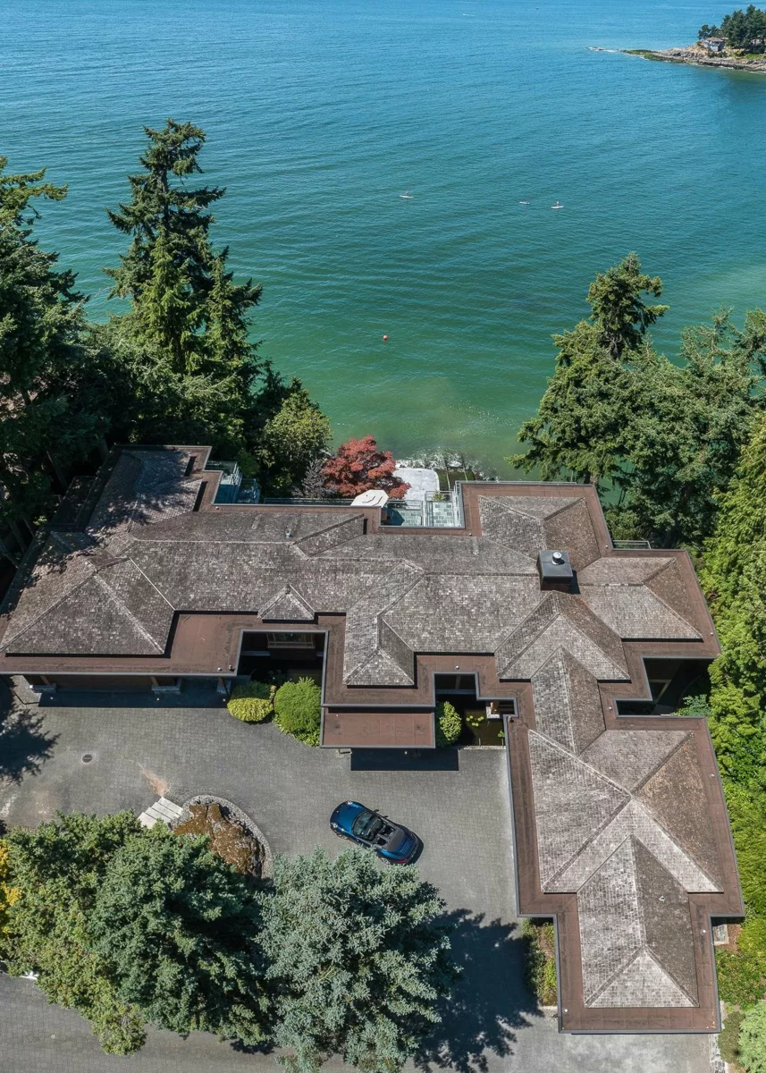 Exceptional West Coast post and beam west facing WATERFRONT ESTATE designed and custom built to perfection, this is a truly a one of a kind masterpiece! Offerring nearly 13000 SF with 3 levels of living space, 5 bedrooms, 7 baths, 4600 SF of terraced slate patios, outdoor pool/ hot tub, indoor pool/ hot tub, 4 level indoor elevator, geo thermal radiant heating, 8000 gl. front entry koi pond, 5 car heated garage, and an incredible 50 foot attached indoor private yacht garage with private elevator access believed to be the only of its kind in North America! Gourmet chefs kitchen and cabinetry by Redl Kitchens, Brazilian cherry floors and floor to ceiling glass! The 31600 SF West facing private estate and this home are truly World Class like no other! Amazing!!