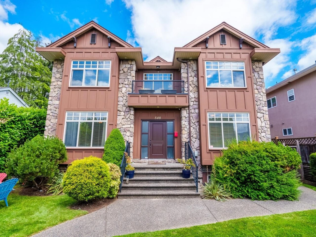 Welcome to this well-laid-out 7-bedroom, 6-bathroom executive home with significant mortgage helper potential. Situated on a serene street, just five blocks from Lower Lonsdale, you'll enjoy the tranquility of a quiet neighbourhood while enjoying city and mountain views. Upstairs, you'll find four spacious bedrooms, three with walk-in closets, and two ensuites. The main level features a gourmet kitchen with stainless steel appliances, a gas range, and granite countertops. This space flows into a large family room, a mudroom, and a covered patio overlooking the fenced backyard. The property includes a legal 2-bedroom suite and an additional non-registered nanny suite. The home also offers a triple garage and an oversized parking pad for ample vehicle space.