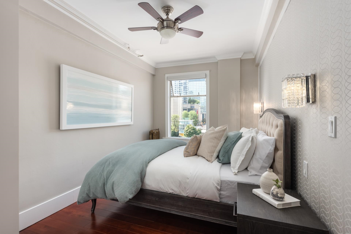 Step into a rare gem of Vancouver's history at 777 Burrard Street nestled within a beautifully preserved six-story 1914 heritage building. Lovely one bedroom suite blends the charm of yesteryear with modern elegance, offering a unique living experience in one of the city's most coveted locations. 9' ceilings immediately enhance the spaciousness of the open-plan kitchen and living area. A pretty kitchen features custom-designed cabinetry. Every detail has been meticulously crafted, from the sleek California Closets built-ins to the expansive marble bathroom. Large windows flood the spacious bedroom with natural light. Just steps from the best shops and restaurants, this well maintained, re-piped building offers the convenience of a live-in caretaker. Don't miss this exclusive chance.