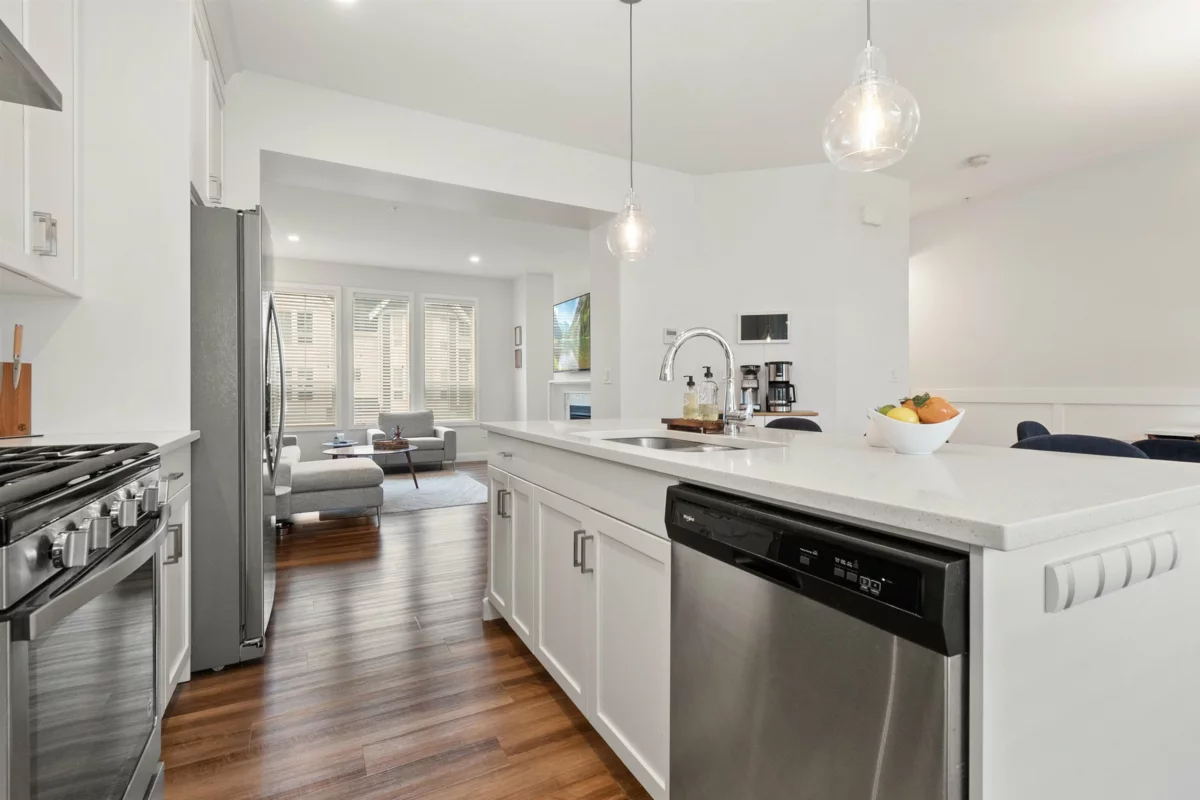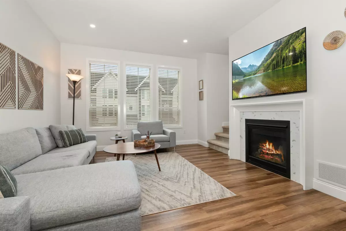 NON STRATA ROWHOME in beautiful Websters Landing is just steps to the river trails, schools, & parks. Inside, check out the views! You'll be impressed the moment you step into the heated tile foyer of this awesome 3 BED & DEN home. The open concept kitchen is great for entertaining w/ SS appliances, gas range, quartz counters, & shaker cabinets. Relax in the cozy living room with gas fireplace, built in book cases, & large southern exposed windows for tons of light. Upstairs, 3 generous bedrooms include a master retreat with vaulted ceiling, W/I closet & ensuite w/ dual quartz vanities, heated floors & oversized frameless glass shower! Large covered sundeck with gas BBQ hookup. Generously sized double garage, even a forced air heat pump system (A/C). Come see for yourself!