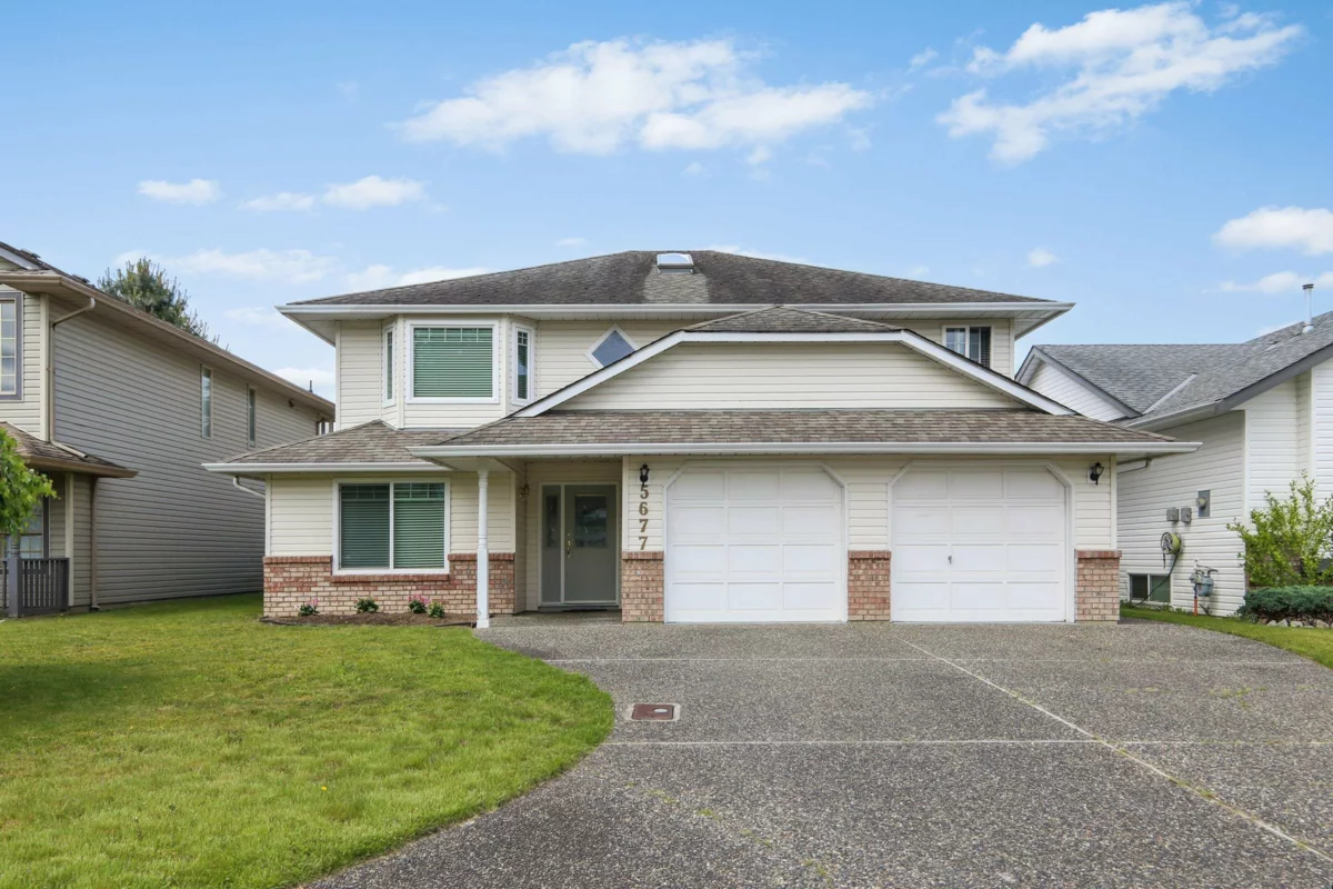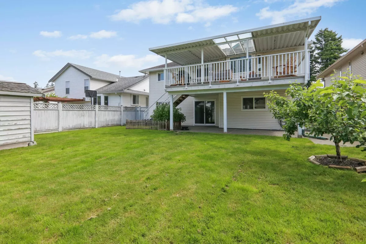 Super location in a great family neighbourhood close to schools and recreation amenities, just a few minutes walk to the Vedder River trails and parks, convenient to shopping and easy access to commuter routes. This five bedroom, 3 bath home is on a large flat fenced lot providing space for gardening, play and pets. The large double garage, and a storage shed/workshop are ideal for the hobbyist. Inside the home can accommodate a large, active family or could easily be suited for multi-generation living. Upstairs has 3 bedrooms including the primary featuring an ensuite with soaker tub and a large walk in closet and downstairs offers 2 more bedrooms plus a den and large family room with gas fireplace. Central A/C for your summer comfort. Come see!