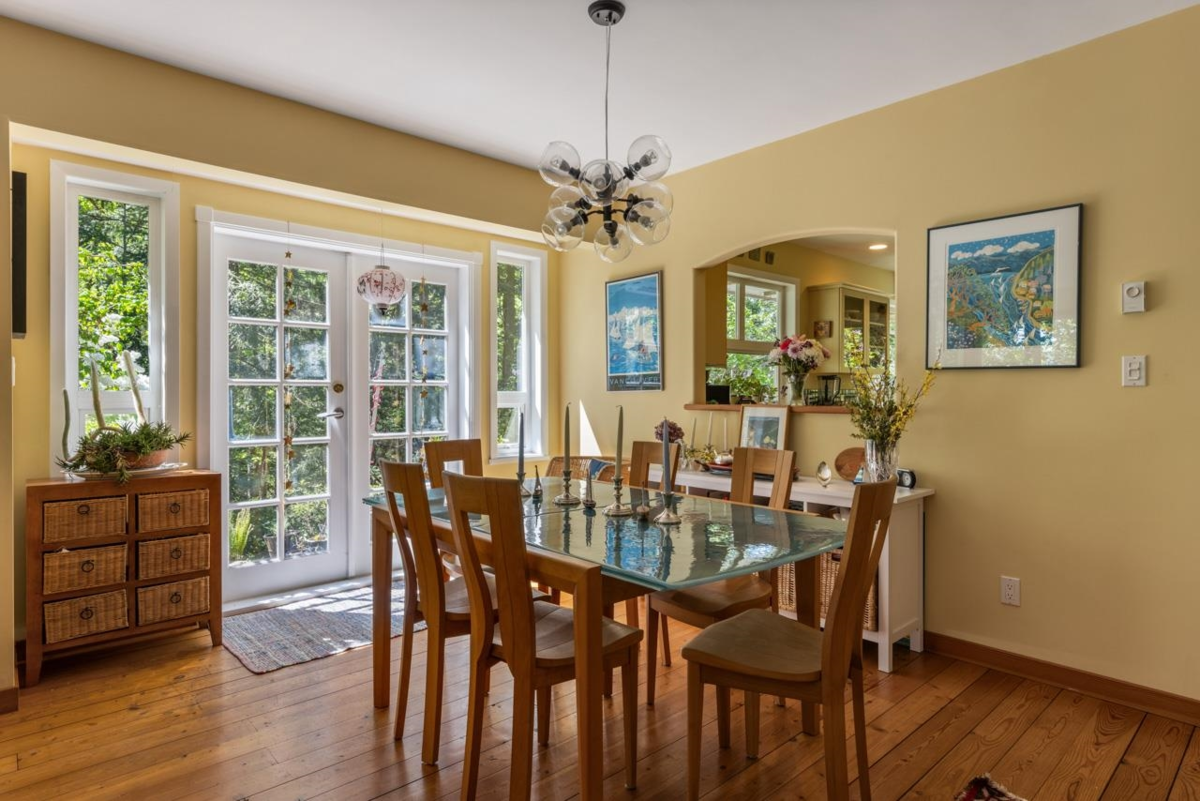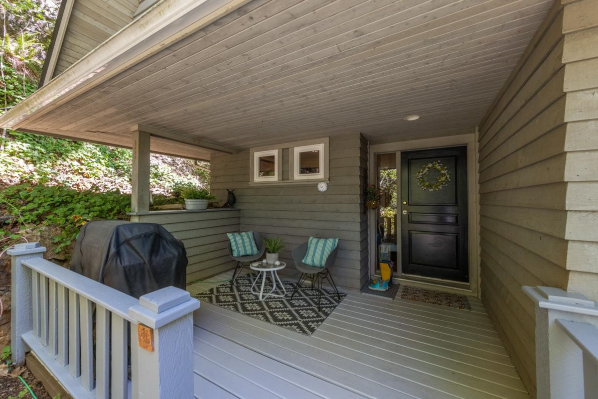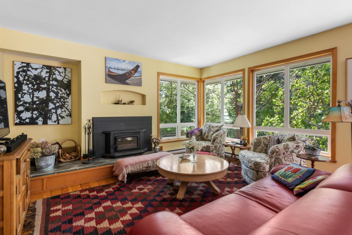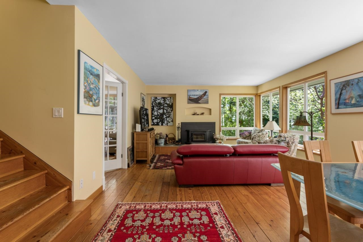Perched on picturesque Cates Hill, this beautifully secluded 3-bedroom home offers peace, privacy, and nearly an acre of lush grounds. Surrounded by greenery, this tranquil retreat invites you to relax and unwind. Inside, the bright and airy open-concept living and dining area is filled with natural light, featuring rich hardwood floors and a cozy wood-burning fireplace that adds charm and warmth. The upper level includes a generous primary suite with ensuite bath, while two additional bedrooms, a full bathroom, and a convenient main floor powder room complete the thoughtful layout. French doors off the dining room open to a sun-soaked patio, ideal for relaxing or entertaining in the garden setting. Bonus features include a private outdoor shower & covered secondary patio.