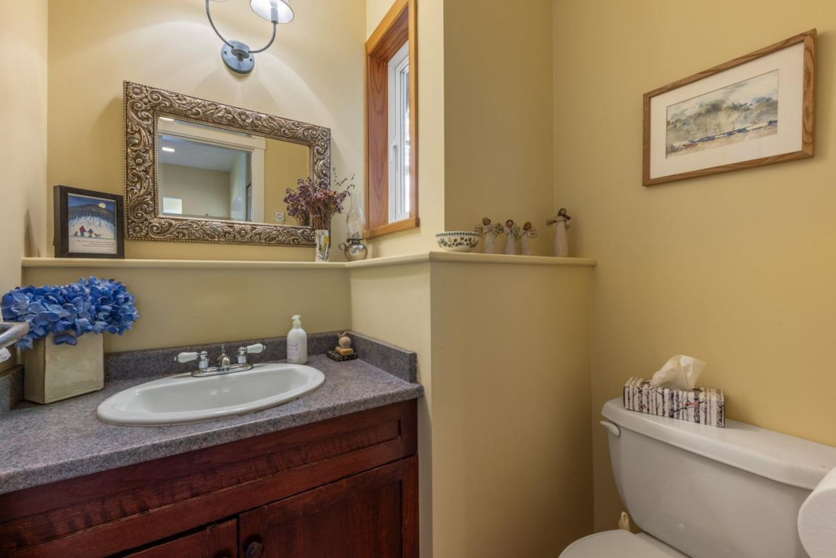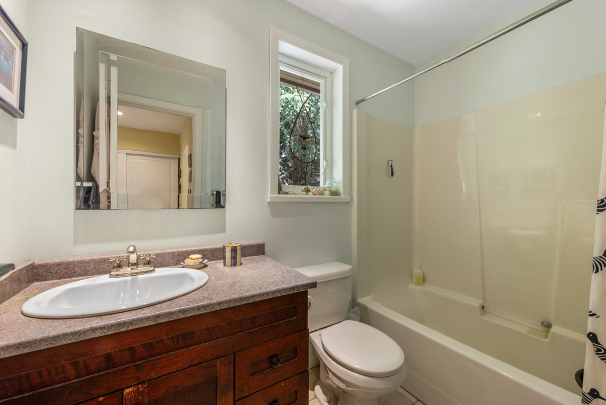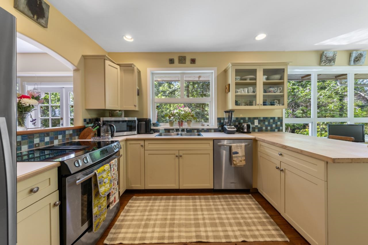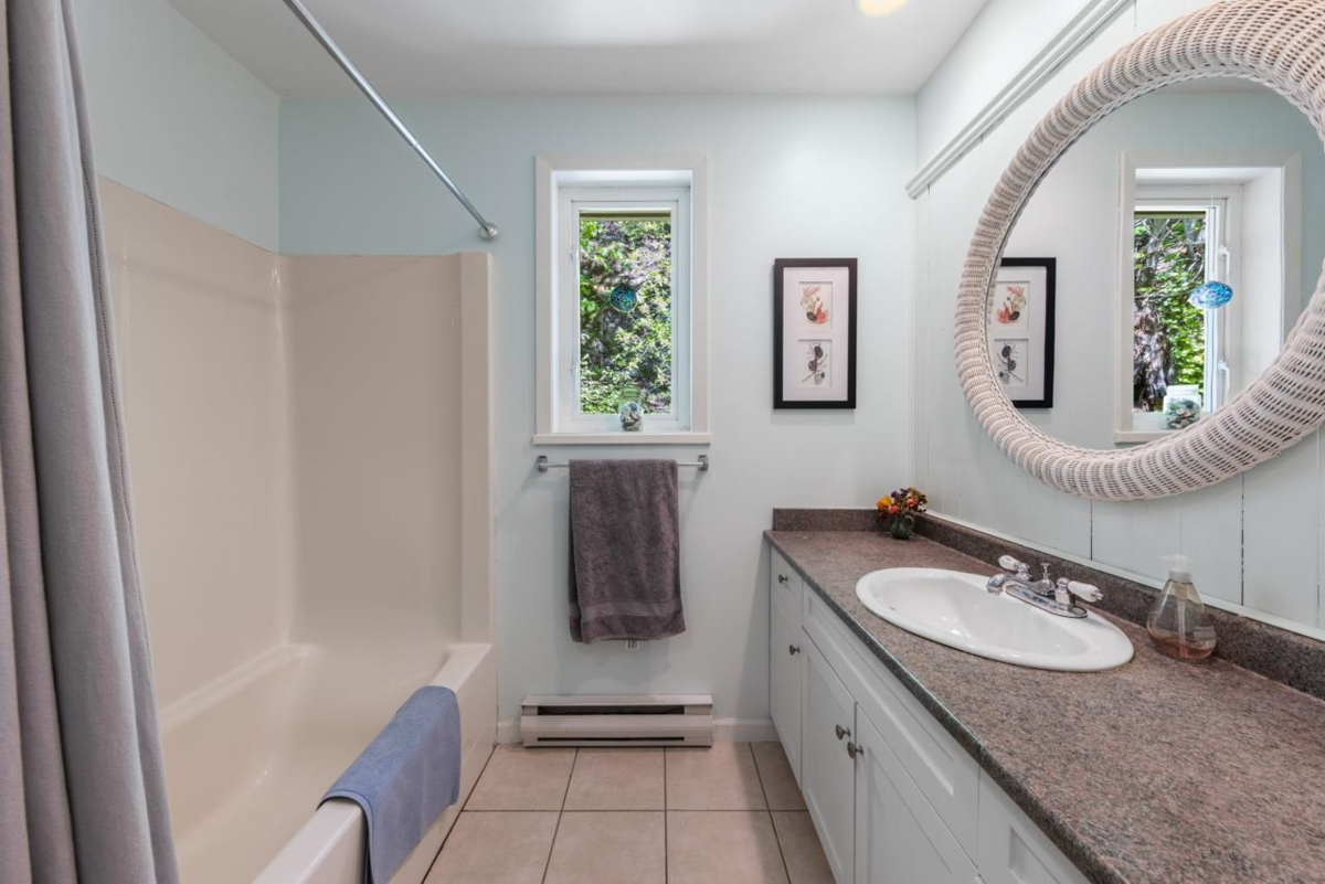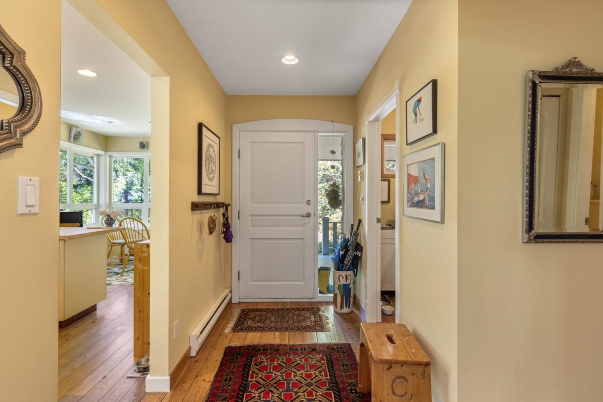 Perched on picturesque Cates Hill, this beautifully secluded 3-bedroom home offers peace, privacy, and nearly an acre of lush grounds. Surrounded by greenery, this tranquil retreat invites you to relax and unwind. Inside, the bright and airy open-concept living and dining area is filled with natural light, featuring rich hardwood floors and a cozy wood-burning fireplace that adds charm and warmth. The upper level includes a generous primary suite with ensuite bath, while two additional bedrooms, a full bathroom, and a convenient main floor powder room complete the thoughtful layout. French doors off the dining room open to a sun-soaked patio, ideal for relaxing or entertaining in the garden setting. Bonus features include a private outdoor shower & covered secondary patio.