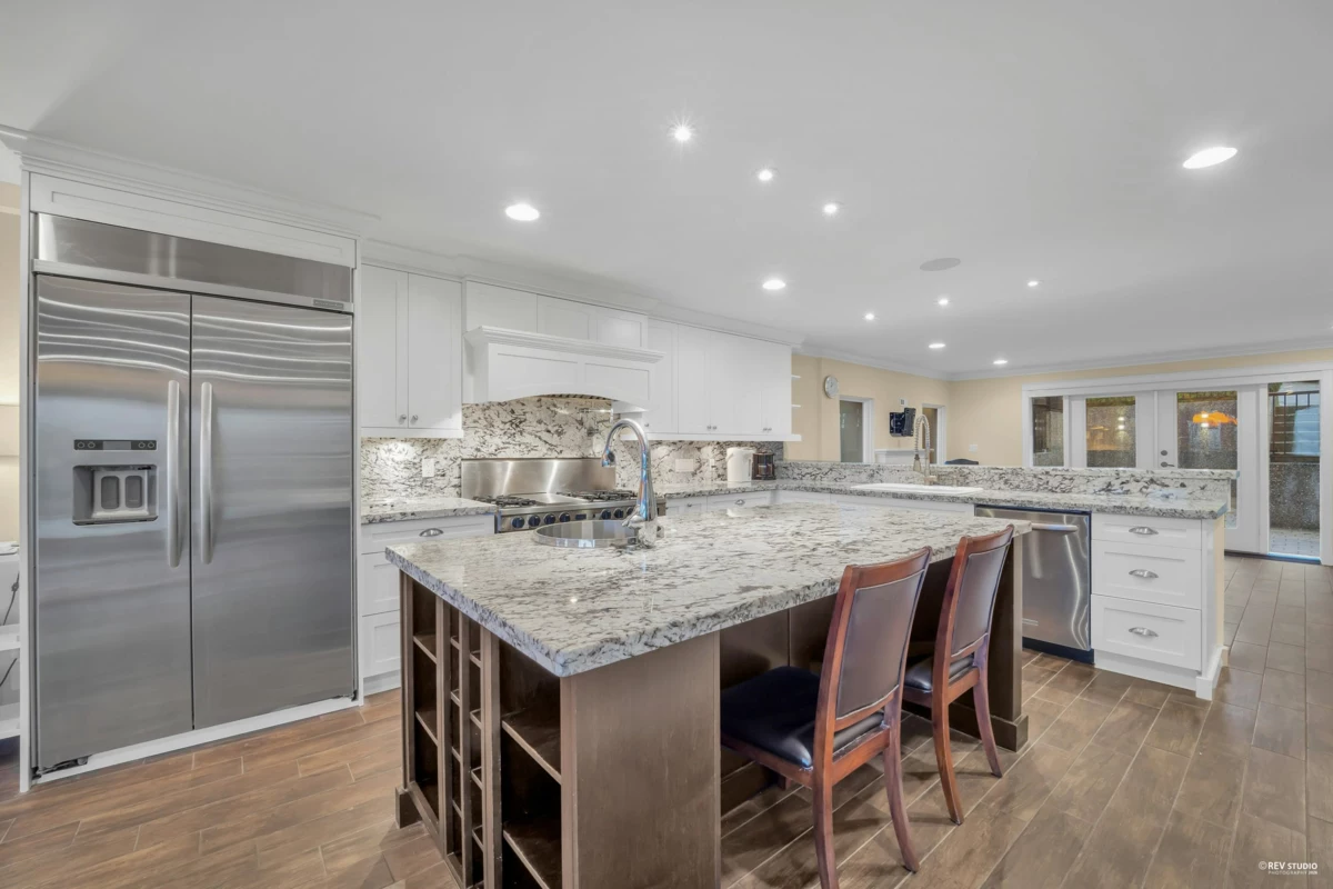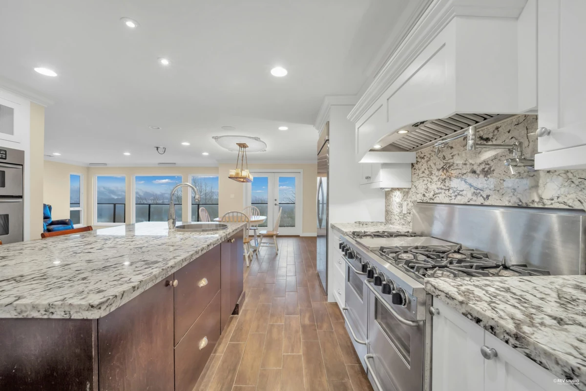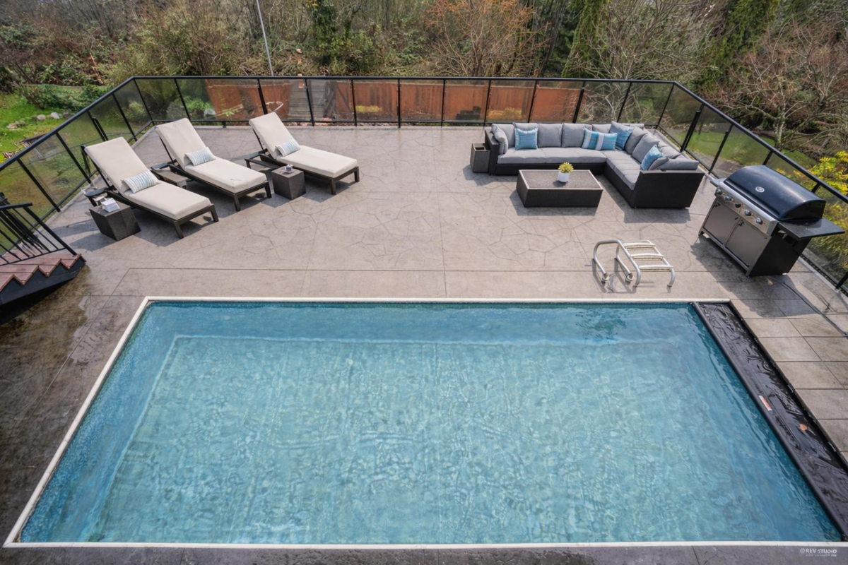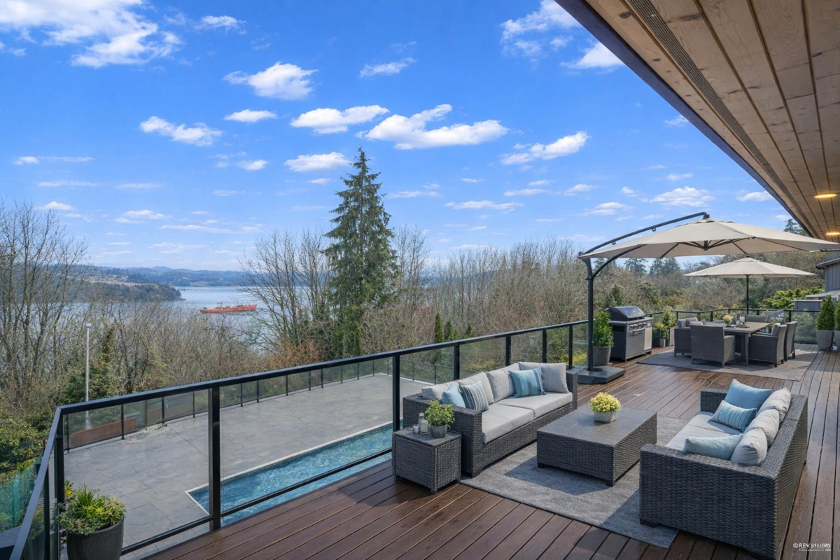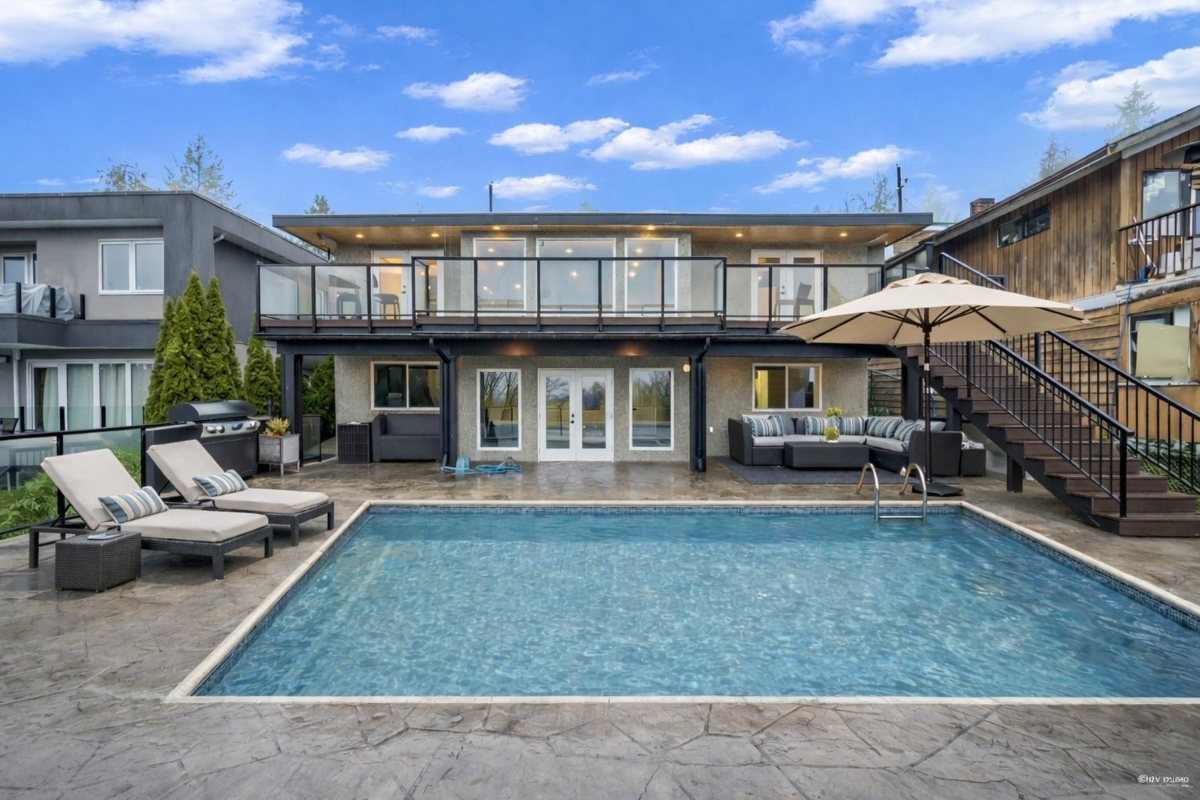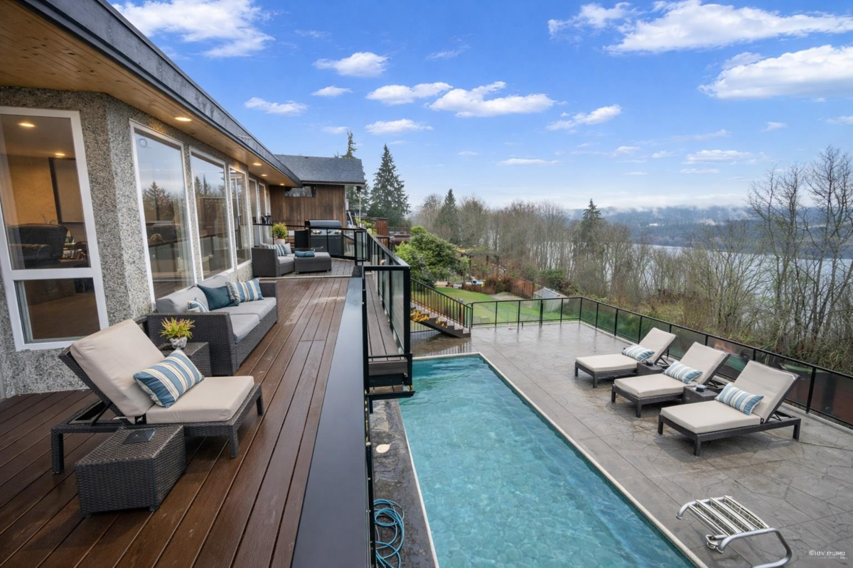 FANTASTIC PANORAMIC VIEWS of Burrard Inlet and the North Shore Mountains. Rare waterfront-view home offering resort-style living with a beautiful in-ground pool and an expansive 1,687 SQFT patio. Extensively updated and substantially rebuilt, featuring an open-concept kitchen with high-end finishes, stainless steel appliances, and radiant heating with 6 zones. The Trex-covered deck and French doors open to sunny outdoor entertainment areas. A quiet nearby trail, peaceful surroundings, and a garden with a kids’ play area offer a wonderful outdoor lifestyle, with spring blossoms, summer vegetables, autumn fruits, and picturesque winter scenery. The brand-new in-law suite below, plus large games/flex space, can also be used as a second rental suite. Showings by appointment only.