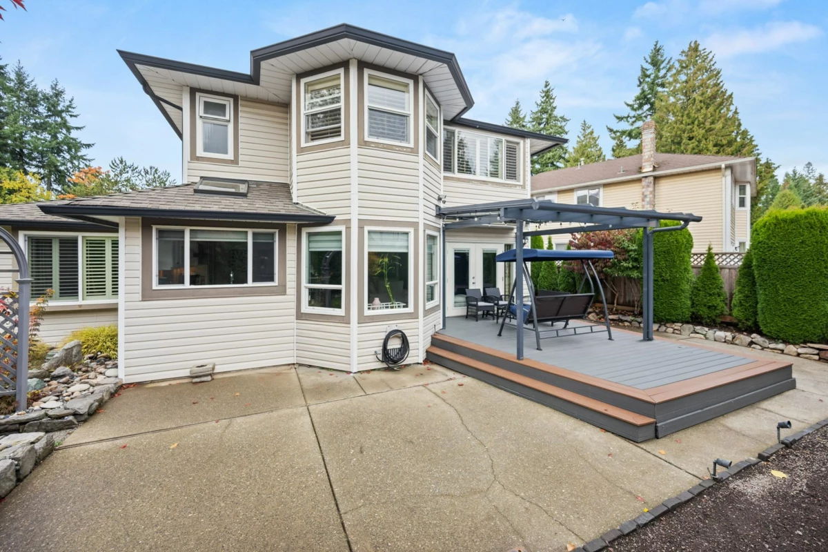 This beautifully maintained, 3 bed + den custom-built home in Panorama Ridge is a must-see! Nestled in a quiet cul-de-sac, the property offers a rare sense of peace & privacy. Thoughtful updates throughout create a bright calm atmosphere, while the open-concept layout is perfect for everyday living & entertaining. Enjoy views of a tranquil stream & watch birds from the sunlit, functional kitchen. The luxurious primary ensuite exudes spa-like comfort with a his-and-hers design, offering a daily retreat. Step outside to a west-facing backyard featuring a stunning glass and wood pergola, ideal for relaxing or gathering with friends. Move-in ready & ideally located near transit, major routes, shopping, restaurants, & all essential amenities, yet tucked away in a family friendly neighborhood.