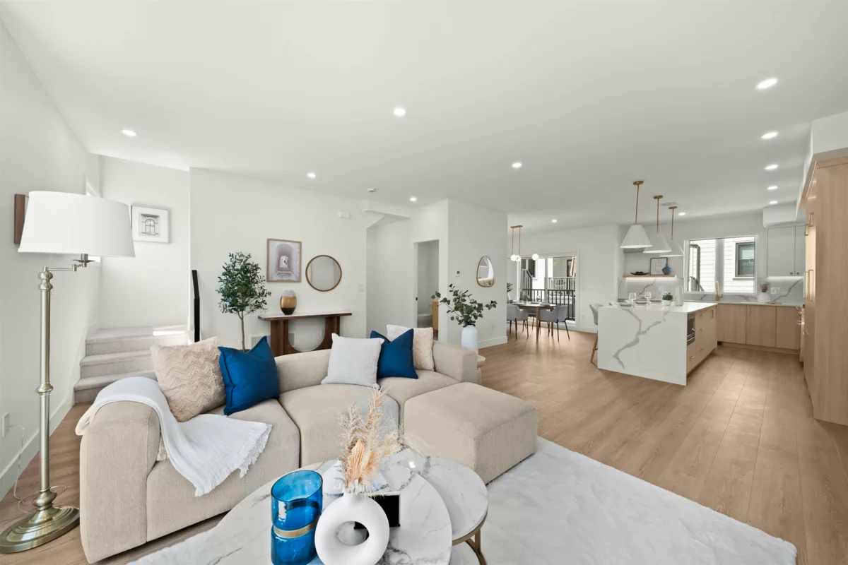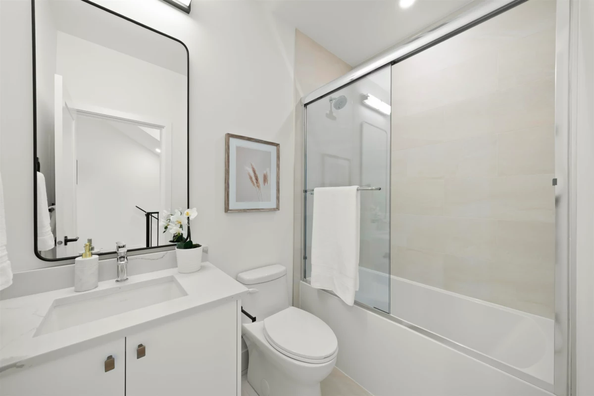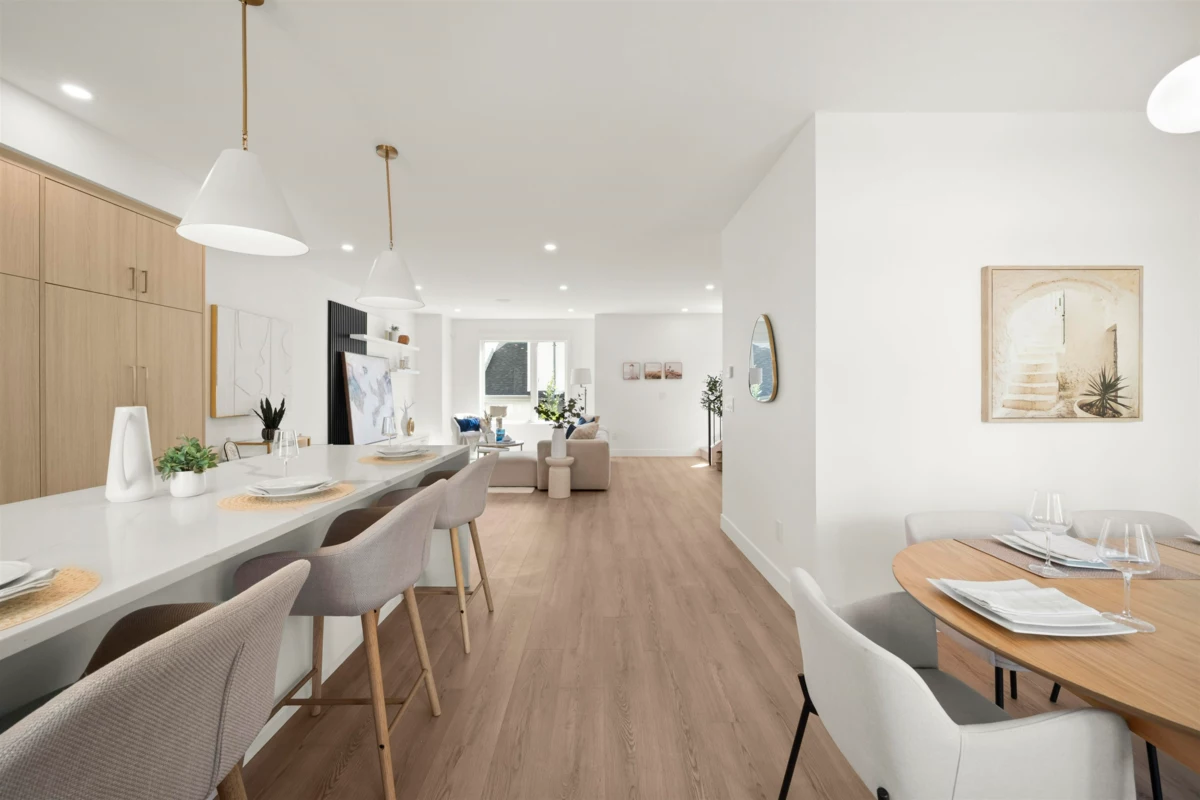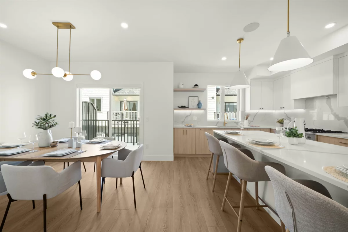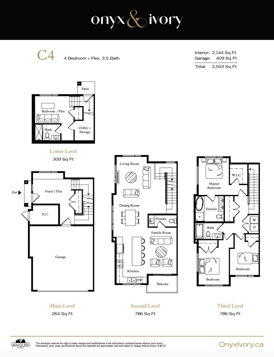 Onyx & Ivory: Set in a prestigious neighbourhood, surrounded by greenery. High-end finishes incl: European appliances, gas stove, large island w/ waterfall, quartz counters/backsplash, LED pot lights, designer light fixtures & e-poxy in garage. Spacious 4 bed + flex (C4 plan) w/ all of the bells & whistles of a detached home! Dbl garage, low strata fees. Bedrm + bath in bsmt, w/ a flex/office space above. Open kitchen/living/dining & powder room on main level w/ balcony & bbq gas outlet. Primary bedrm w/ WIC & ensuite w/ duel vanities. 2 more good sized bedrms + bath & laundry upstairs. Wide-plank laminate up & down, forced air, central A/C, & millwork incl. MOVE IN READY - 5% deposit only! Photos are of E2 Plan. #60 is in the 'Onyx' colour scheme. SHOW HOME OPEN SAT-THURS 12-5.