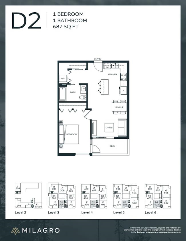 Welcome to Milagro! A boutique six-story residence in the heart of Downtown Squamish. This thoughtfully designed 1 bedroom + flex PENTHOUSE condo offers a spacious primary bedroom, versatile flex space perfect for a home office or guest area & an open-concept kitchen, dining & living room. Enjoy wide plank laminate flooring, premium stainless steel appliances, and large windows that fill the space with natural light. Step onto your private balcony to take in sweeping views of the surrounding mountains and vibrant downtown. Oversized storage lockers on most floors make room for all your adventure gear. With urban conveniences and world-class recreation at your doorstep—this is an exceptional opportunity to get into prime Squamish Real Estate!