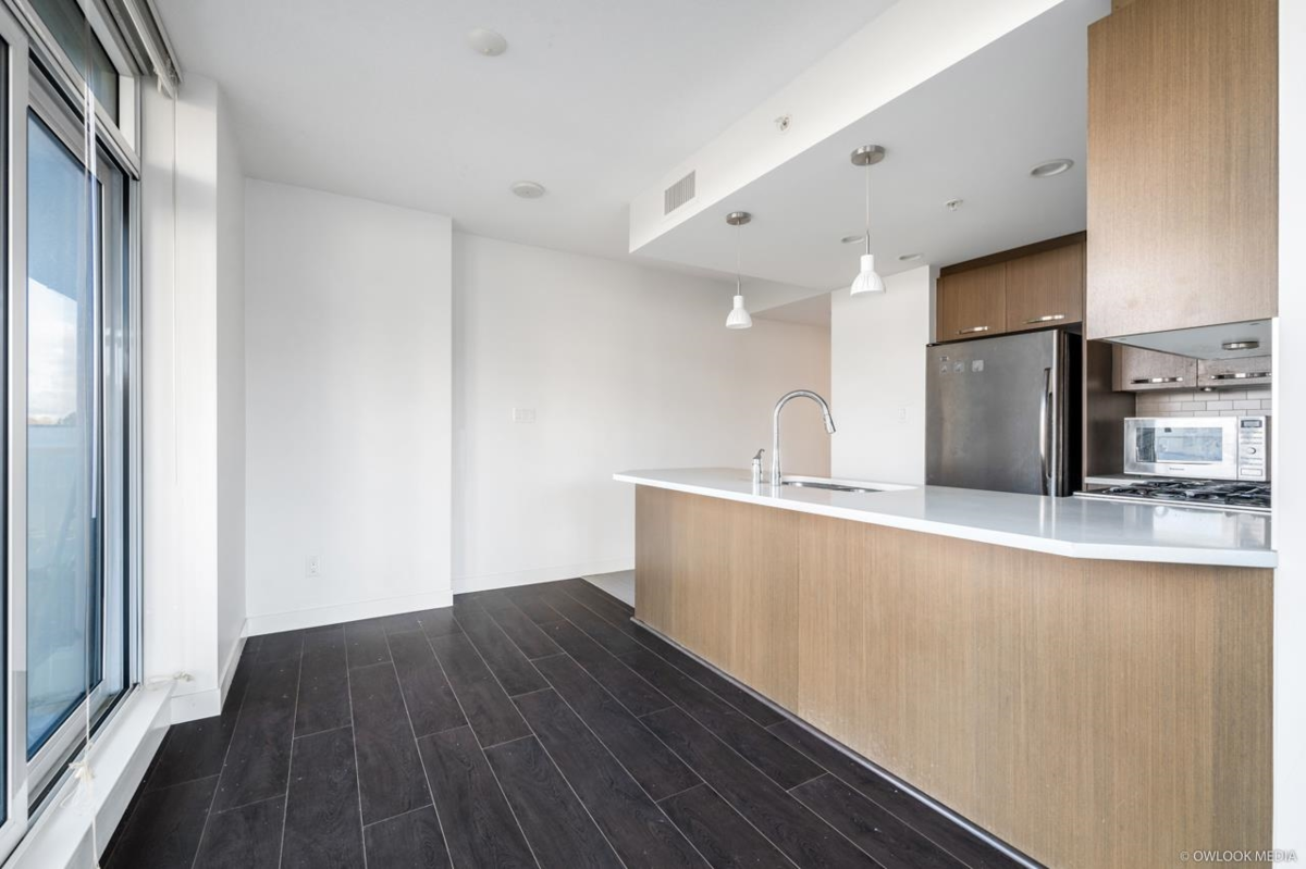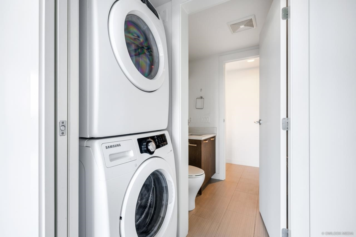 1 BR corner unit. Great investment unit to be rented out. Central air conditioning, low emission windows & includes fridge, dishwasher, fan/microwave & W/D . More stronger pre-stressed concrete construction and project features over 21,000 SF on lush courtyard. Solid 3 cm thick solid engineered quartz countertops with polished edges, under-mount double bowl sink and single gooseneck faucet with full out vegetable tray. Modern wood veneer cabinets with brushed nickel pulls. Fitness facility with steam room & use of lounge & meeting room & kitchen for your social gatherings. Use of storage locker. Low density 2 tower project with central location close to Richmond Centre and Canada Line Station.