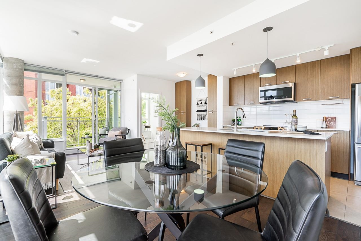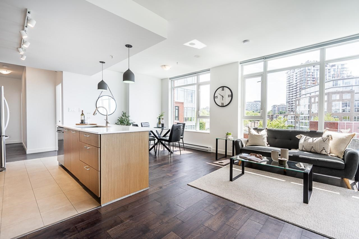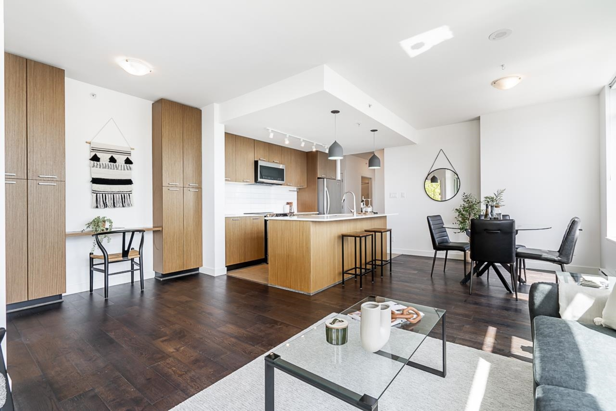 Welcome home to this BRIGHT & SPACIOUS 2 bed / 2 bath + den + flex in vibrant Mount Pleasant! The perfect floor plan w/ extra-large living & dining, floor-to-ceiling windows, engineered wood flooring & a sun-drenched balcony. Open chef's kitchen w/ S/S appliances, quartz counters/backsplash & modern cabinetry. Large primary bedroom w/ walk-in-closet & SPA-LIKE ensuite w/ deep soaker tub. Oversized den w/ window, perfect for work-from-home & custom built-ins in living room for extra workspace. SOCIAL has incredible amenities w/ a ROOFTOP TERRACE w/gas BBQ, exercise centre, party room & bike storage. STEPS to the future Skytrain station, Michelin-Star restaurants, breweries, Guelph Park & MP community centre. TWO parking EV Ready + storage locker & bike locker.