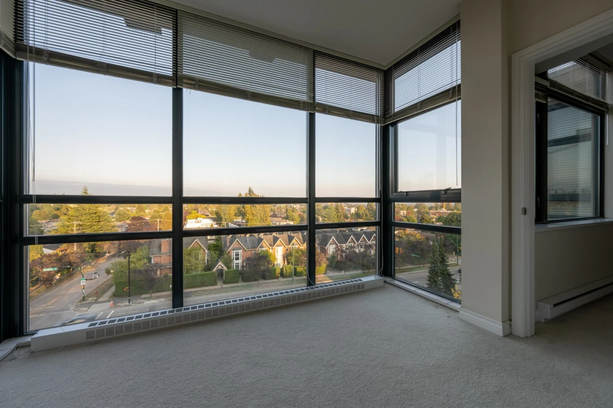 Bright east-facing home with panoramic views to Mount Baker. Generous layout with gas fireplace, galley kitchen, in-suite laundry, and enclosed balcony for sunroom/den/office. Original owner, very clean and well kept. Solid concrete building with attentive strata and caretaker. Amenities include resident courtyard, common room, secure bike storage, visitor parking (2 passes for this unit), and car-wash station. One parking and one locker included. Steps to Oakridge, QE Park, library, and Canada Line with quick access downtown and airport. A quiet, well-managed community with many long-term residents. OPEN HOUSE: Sat. Nov 1st 4pm-5pm.