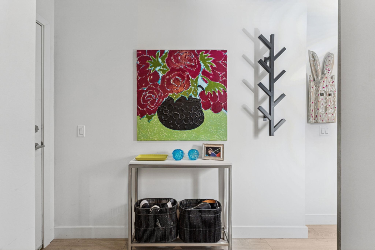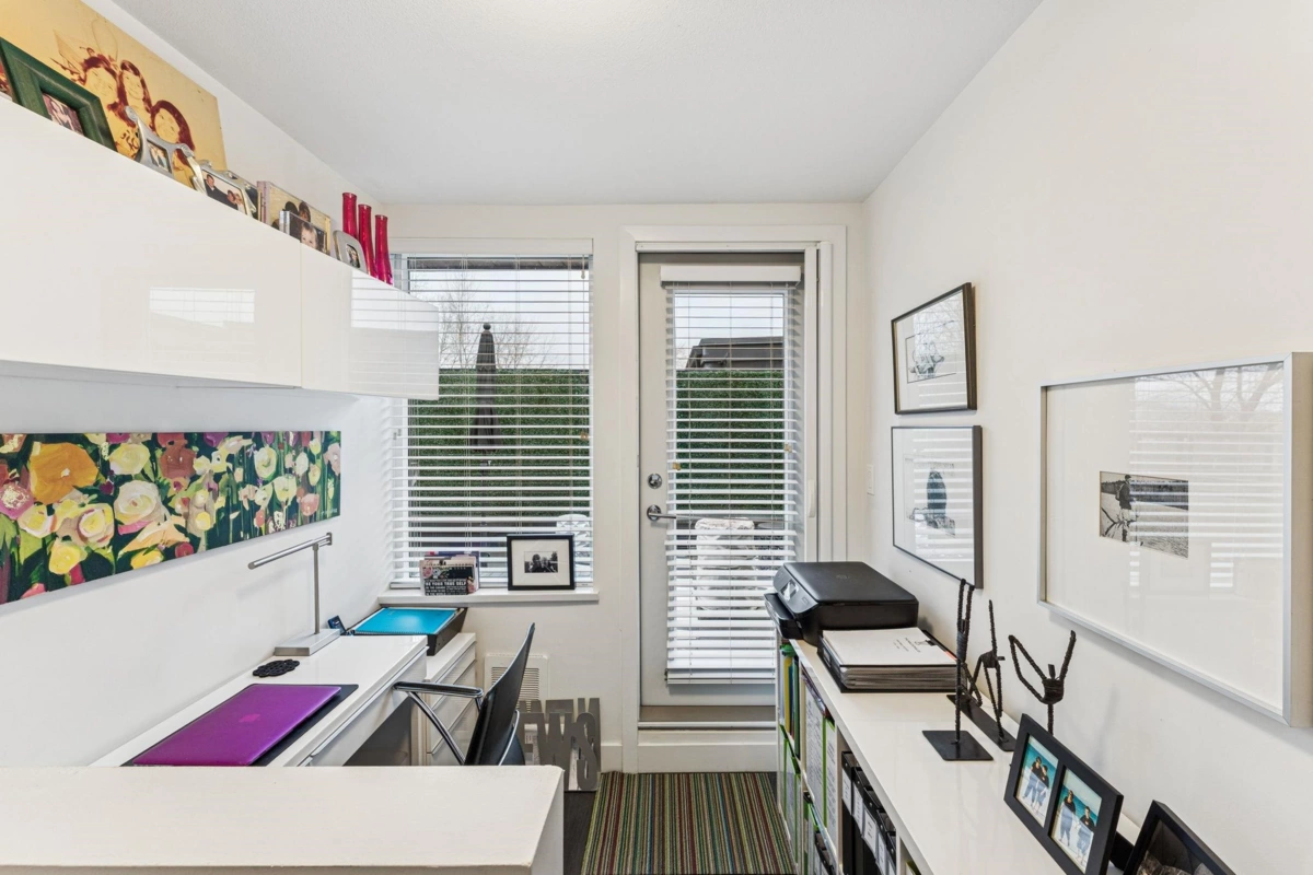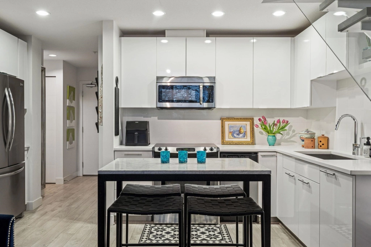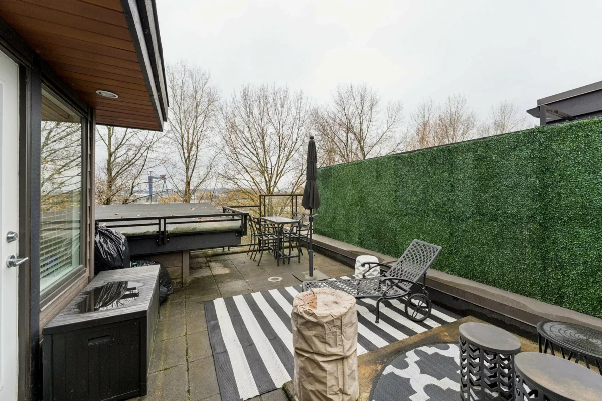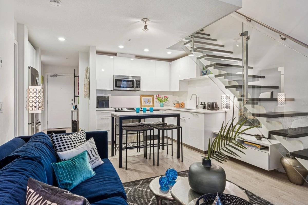 Perched on the top floor of The Shore by Adera, this South-West-facing one bedroom + den is filled with light, vaulted ceilings, and beautiful city, water, and mountain views. Outdoor living is a true highlight, with a private rooftop patio and an oversized main-floor balcony overlooking Mosquito Creek. Surrounded by greenery, the setting feels calm and restorative, with birdsong and the occasional eagle adding to the natural backdrop. Inside, the home offers a sleek yet inviting modern interior with white cabinetry, stainless steel appliances, and a thoughtfully designed, highly functional floor plan. This LEED-certified, pet-friendly building includes a yoga room, fitness centre, and meeting space, all just steps from the SeaBus, waterfront trails, cafés, restaurants, and the ocean.