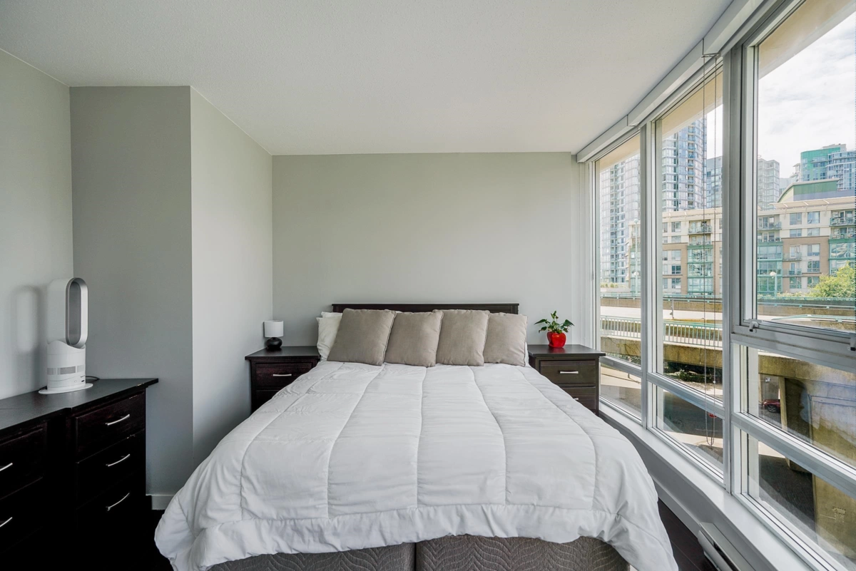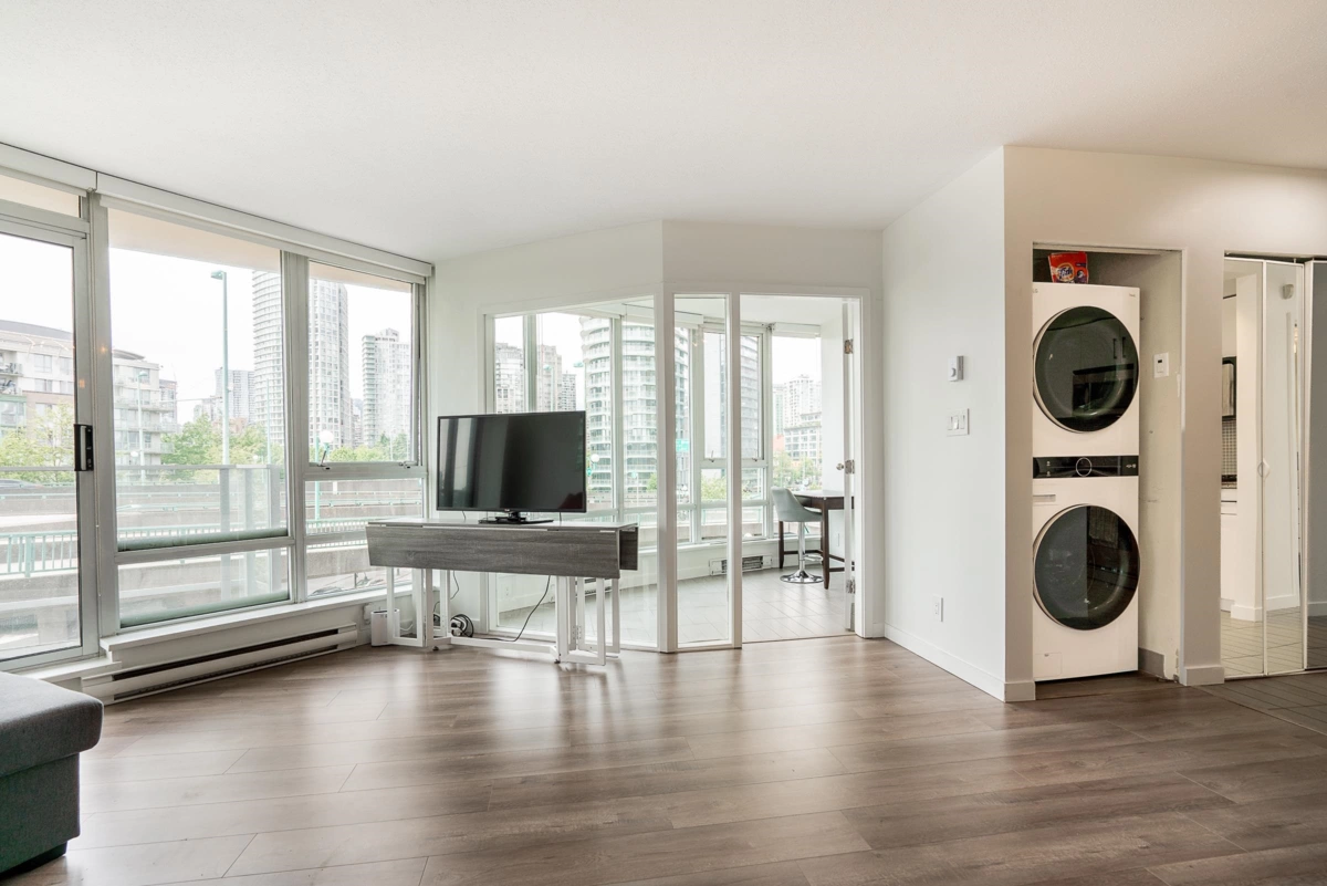 Coopers Pointe by CONCORD PACIFIC. This bright & spacious 1 Bed + Den end unit offers 730 sqft of thoughtfully designed living space. The kitchen features refinished cabinetry, granite countertops, stainless steel appliances, & gas cooktop. Recent updates include brand-new flooring, fresh paint, new washer/dryer & a beautifully updated 4-piece bathroom w/ marble countertops. Generous primary bedroom comfortably fits a king-size bed, while a bonus pantry provides valuable extra storage. Enjoy world-class amenities: concierge service, clubhouse, indoor pool, sauna/steam room, hot tub, bowling alley, 2 gyms, party rooms, theatre & more. Perfectly located on a quiet corner, just steps to the Seawall, parks, PARQ Casino, Urban Fare & Yaletown’s top restaurants. Pets welcome! Private EV Charger!