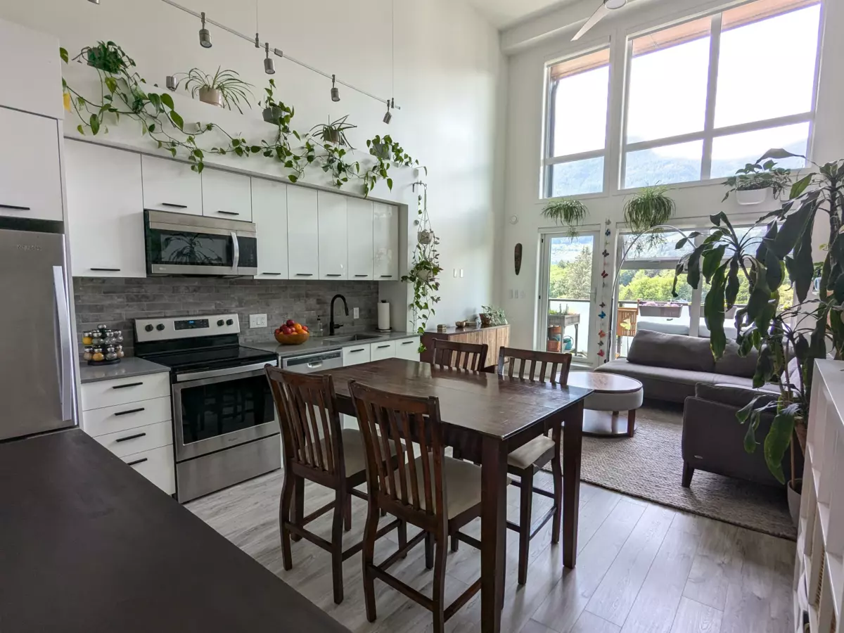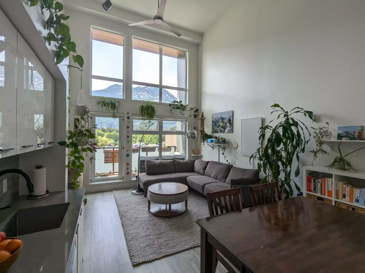 UNIQUE PENTHOUSE LOFT- the perfect Squamish condo, this two-story top-floor home, nestled in the heart of downtown, offers modern living and spectacular views. Two bed and den/office over 1000SQFT, 17ft ceilings, massive windows and ample storage. This newer build is bathed in natural light, floor-to-ceiling windows ensure a bright and serene atmosphere. Enjoy the tranquility of living on the top floor with a daily backdrop of amazing views; from spectacular sunsets to moody West Coast mornings. Ideally located just removed from the busier core streets, moments from outdoor recreation, restaurants, amenities, Howe Sound and the Estuary. Squamish is on the up, a blend of small-town charm with adventure, 45 mins from Vancouver and Whistler. Come take a look to experience this home in person!