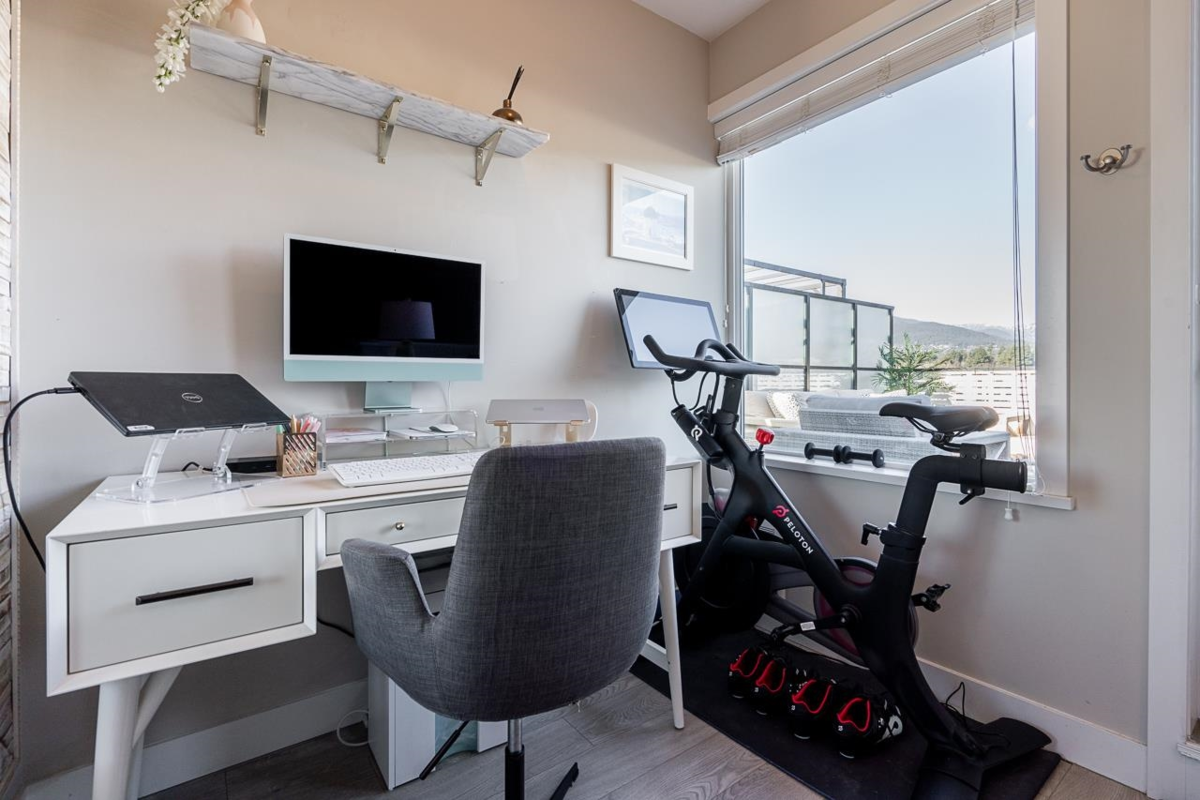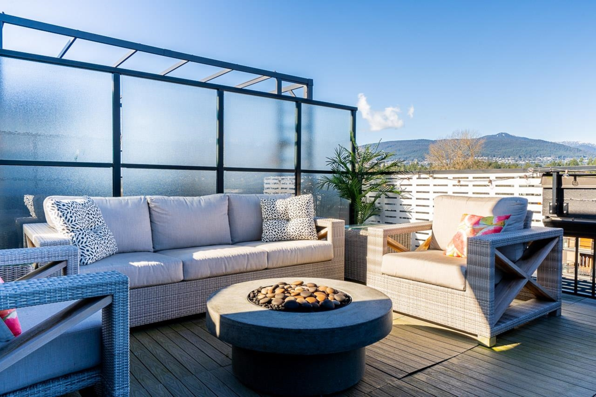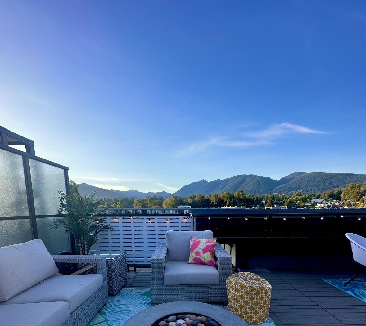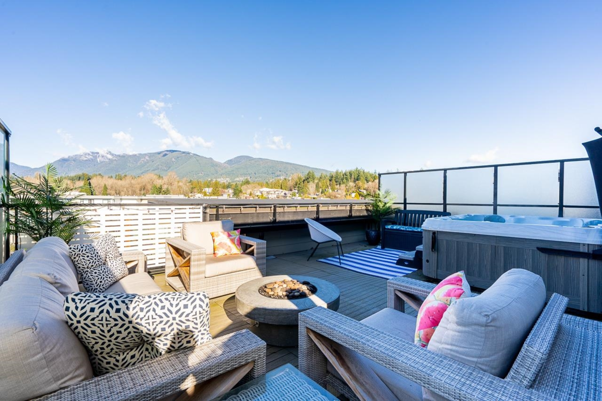 2-level penthouse featuring incredible rooftop patio complete with a lounge area and a hot tub! Astonishing, unobstructed views of the North Shore Mountains from both levels. 1 bed + office, 1 bath, 755 sq.ft., + 2 outdoor spaces. Inside, ALL NEW SS Samsung kitchen appliances, light fixtures, custom screen doors to both patios and Smart home technology (lights + thermostat). Incredible location near Lower Lonsdale and just 2 blocks to the water. TURN KEY OPTION - PURCHASE PRICE CAN INCLUDE furniture, art, furnishings, hot tub, peloton, etc.! ASSUMABLE MORTGAGE AT 3.02% UNTIL AUGUST 2026!! Absolutely tremendous opportunity in award wining LEED certified building 'The Shore' by Adera. 1 Parking and BBQ's + Pets (2) allowed! OH Sat March 16, 2-4PM
