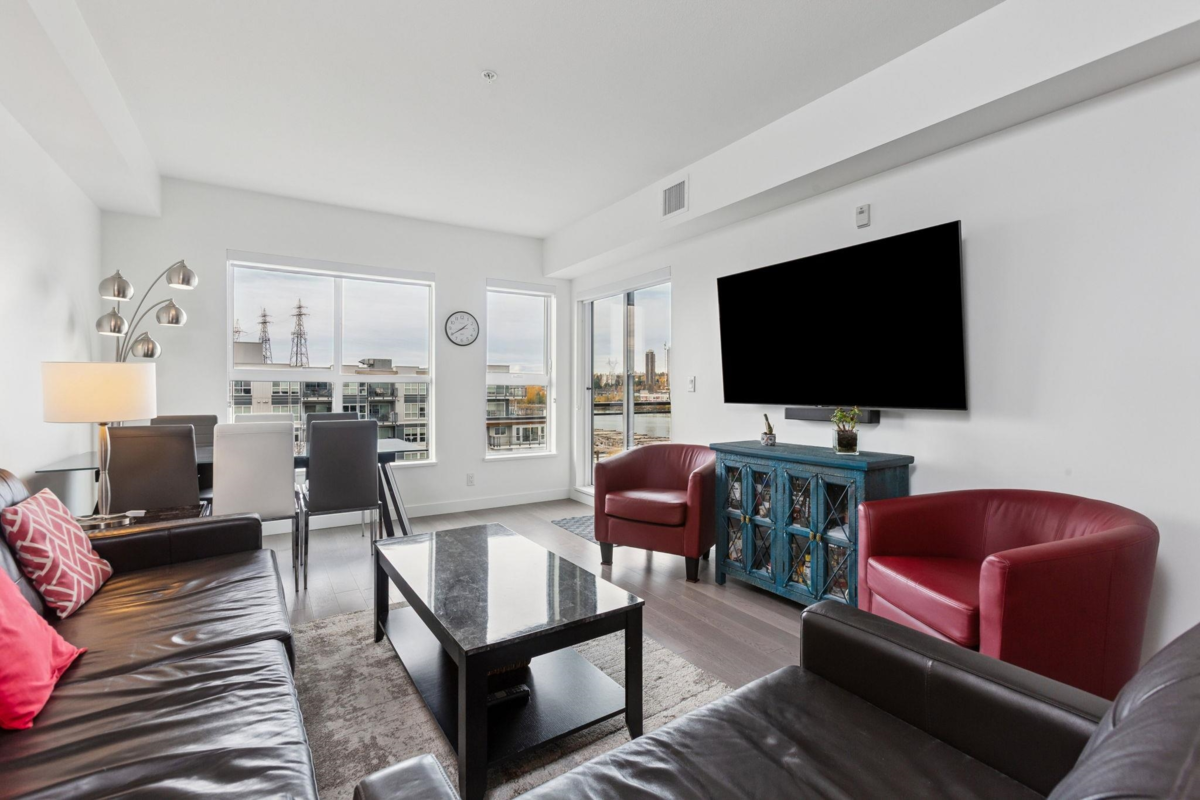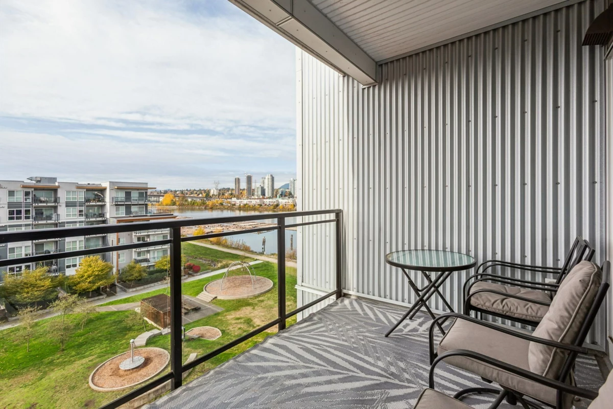 Welcome to this penthouse level 2 bed & den(or 3rd bed), 2 bath west facing home offering breathtaking views of Fraser River, Mtns. & City Skyline. Enjoy vibrant sunsets from your 2 private balconies or relax in the open concept living & dining area w/ large windows that fill the space with natural light. Den area features custom built-ins, providing extra storage & functionality. Modern kitchen w/ premium finishes, spacious separated bedrooms, primary w/ ensuite & well designed layout create the perfect blend of style & comfort. Amenities include an indoor pool, hot tub, fitness centre & social party room. This master planned community has over 5 acres of parkland & dyke trails. Just steps to the Bridgeport SkyTrain, Costco, YVR Airport & quick access into Vancouver. Don't miss out!