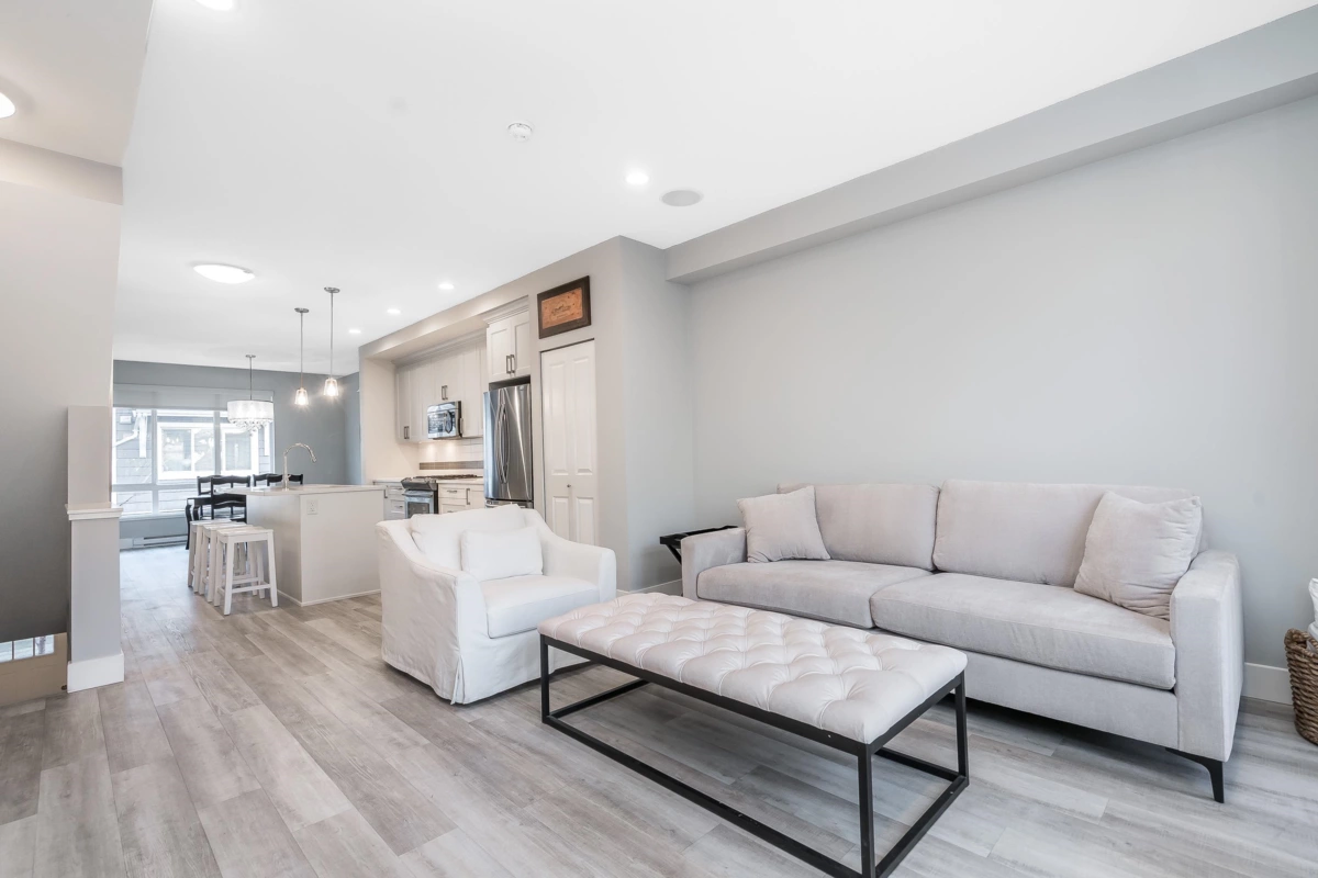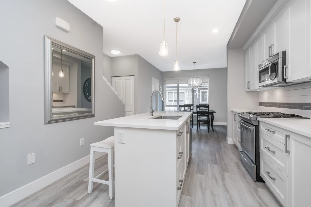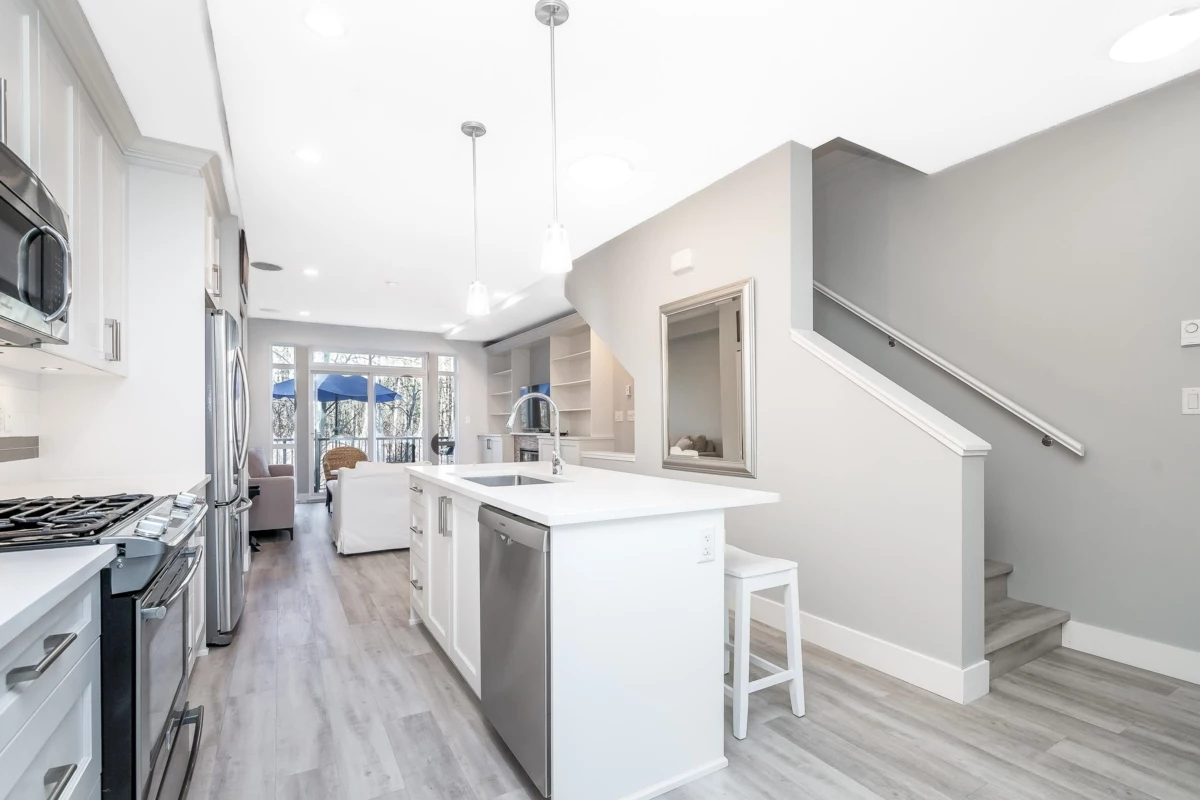 WOW — and I mean WOW! This beautifully maintained 3-bedroom home shows like a model with neutral décor allowing the Buyer to introduce their own personal colour pallet. Enjoy newer luxury vinyl wide plank flooring, a bright kitchen with white cabinetry, quartz countertops, a premium 4-burner gas range and a large sit-up island plus separate dining area. The living room and balcony overlook a peaceful greenbelt—perfect for BBQs or just relaxing and enjoying the peace and tranquility of it all. Upstairs: a primary suite with spa-like 5 piece ensuite, two additional good-sized bedrooms, and laundry with new appliances. Fully fenced backyard with artificial turf. Just minutes to top-rated schools, transit & the Grandview shops. What a find! Call now to arrange a viewing of your new home!