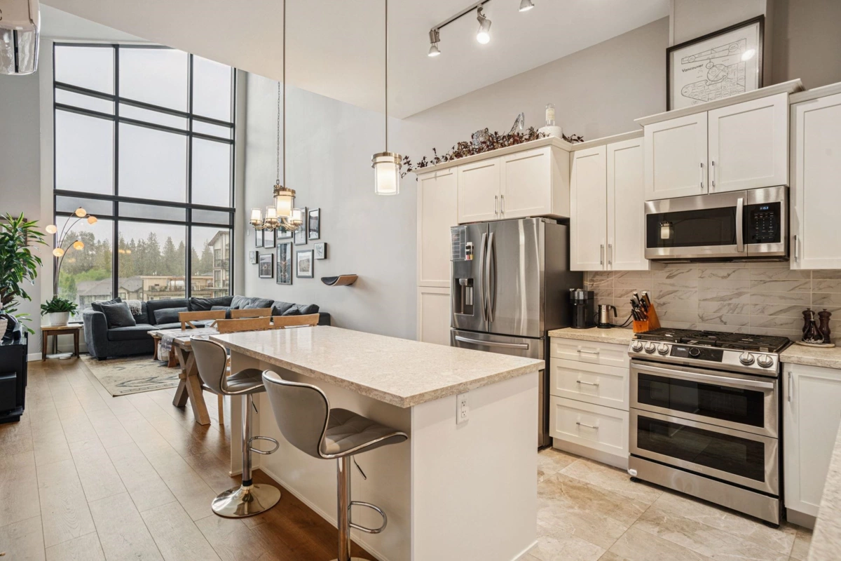 EXTREMELY RARE SPACIOUS CORNER 3 BEDROOM AND SOLARIUM PENTHOUSE WOTH SOARING 20 FOOT CEILINGS AT YORKSON PARK! This unique home features a large kitchen with shaker cabinetry, sleek stainless steel appliances and spacious island, flowing on durable laminate flooring into the dining and living rooms with soaring windows inviting quiet inner courtyard views. 3 sizeable bedrooms and retractable glass solarium with gas hookup are perfect for growing families and downsizers alike. This home is equipped with an energy efficient heat pump (air-conditioning & heat) and spa bathrooms with stone counters and beautiful tiles. Conveniently located across from Carvolth Park & Ride and close to shopping and Highway 1 access. Includes 2 parking stalls and 1 storage locker. *OPEN HOUSE: AUG 23 & 24 2-4PM*