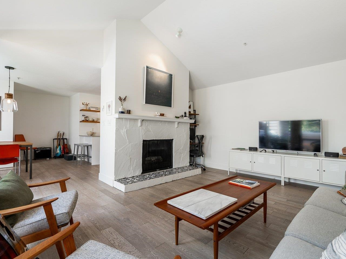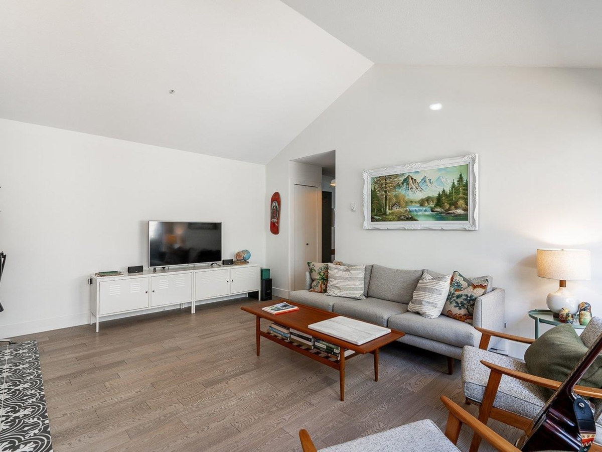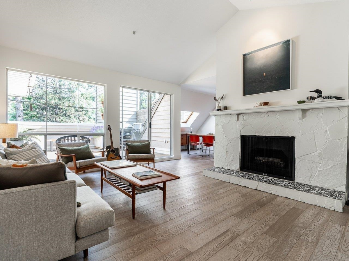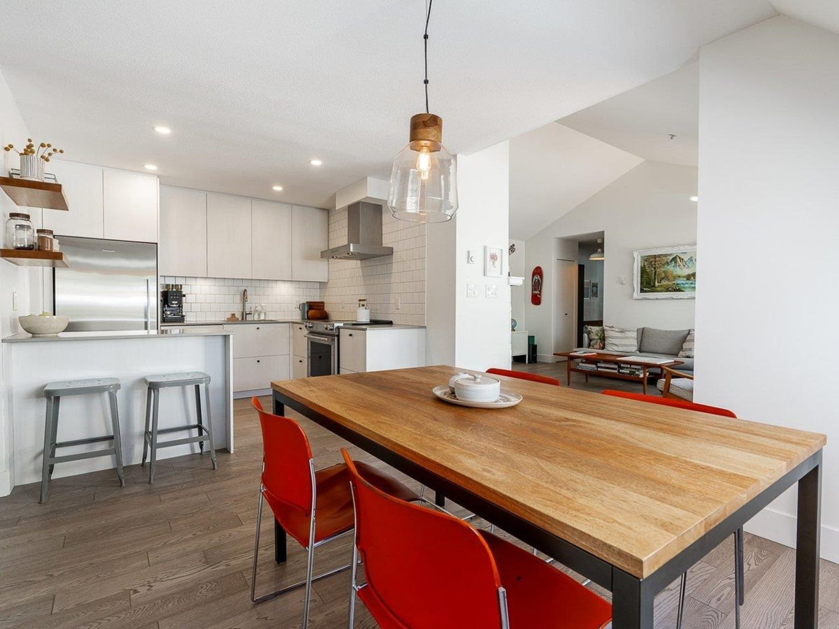 Rarely available, meticulously renovated, PENTHOUSE offering the perfect blend of modern luxury and serene tranquility. Step inside this LARGE 1 Bdrm(possible 2Bdrm) to a sense of space, openness & natural light. Open-concept layout w/ VAULTED ceilings ensures a seamless flow while the spacious & cozy living area is ideal for both entertaining or enjoying quiet nights in. HW flooring throughout adds a touch of elegance & durability. Enjoy the chef’s kitchen, w/ Caesarstone countertops, modern cabinetry, and high-end S/S appliances as well as the tranquil and private 163sqft entertainment deck, a true extension of the living space, and stunning bathroom. Proactive, pet-friendly, strata w/ 1 parking(EV hook-up ready) & 1 locker. Steps to shopping & recreation of Mt. Seymour. A MUST SEE!