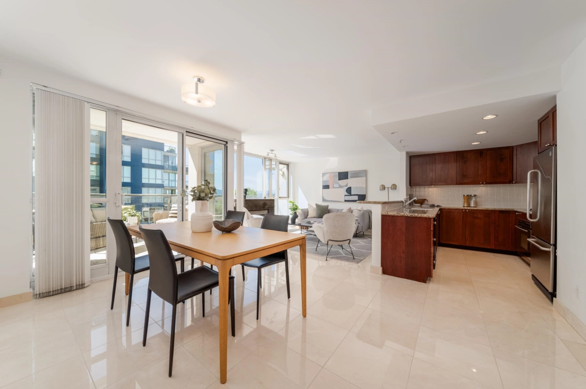Welcome to the Modena of Portico built by NAT BOSA. This generous 2 bed, 2 bath home is sure to impress. First, you're met with marble-clad radiant heated flooring, custom hallway cabinetry, generous pantry, linen closet, built-in bar plus surround sound. The living & dining are expansive w/ an abundance of light leading to the NW facing terrace, with retractable awning, capturing views of the water & NS MTNS. Chef approved kitchen with granite counters, German 5 burner gas cook top & wall oven, huge fridge & maple cabinetry. Primary accommodates a King bed, walk-in closet & sumptuous en-suite w/radiant heated floors.This highly desirable building features EV Parking, gym, jacuzzi, steam, sauna, work shop, bike room, visitor parking & live-in caretaker. 2 pets, 2 parking & X-large locker.