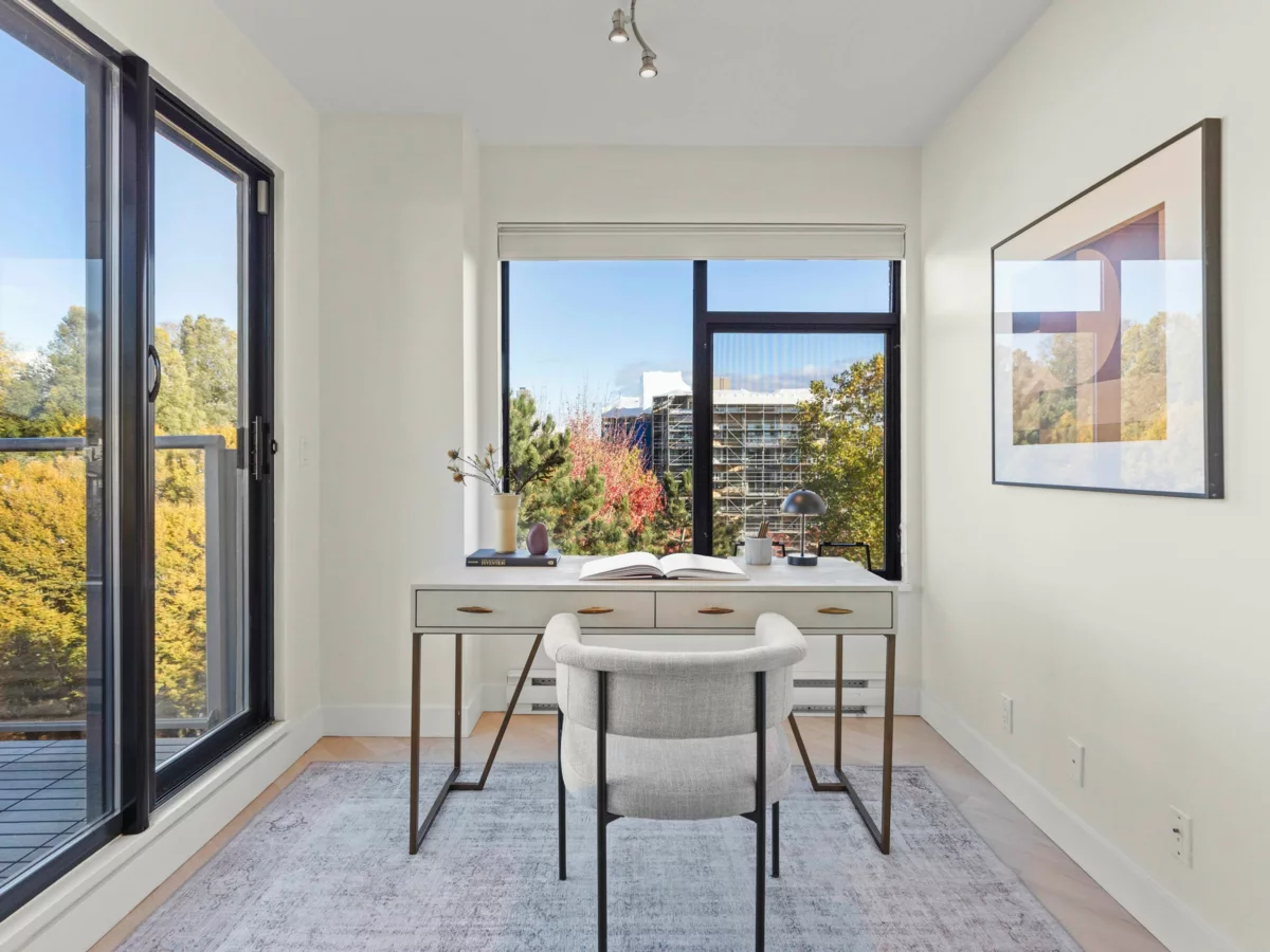 Unbeatable location in Arbutus Walk! This bright 2-bed/2-bath + den, 996 sq. ft. corner home at Solo is in excellent condition with stylish upgrades. Recently refinished maple floors, a dual-fuel stainless oven, Miele dishwasher, and LG refrigerator enhance the spacious open-plan kitchen and living areas. Large windows fill the home with natural light and showcase peaceful park views with mountain tops beyond. The primary suite features a walk-in closet and 3-pc ensuite; the second bedroom is generous in size. Enjoy excellent room separation, insuite storage, a large balcony, 2 parking stalls with EV charger, bike storage, gym, and amenity room. All just steps to parks, shops, schools, transit, and the Kits Farmer’s Market.