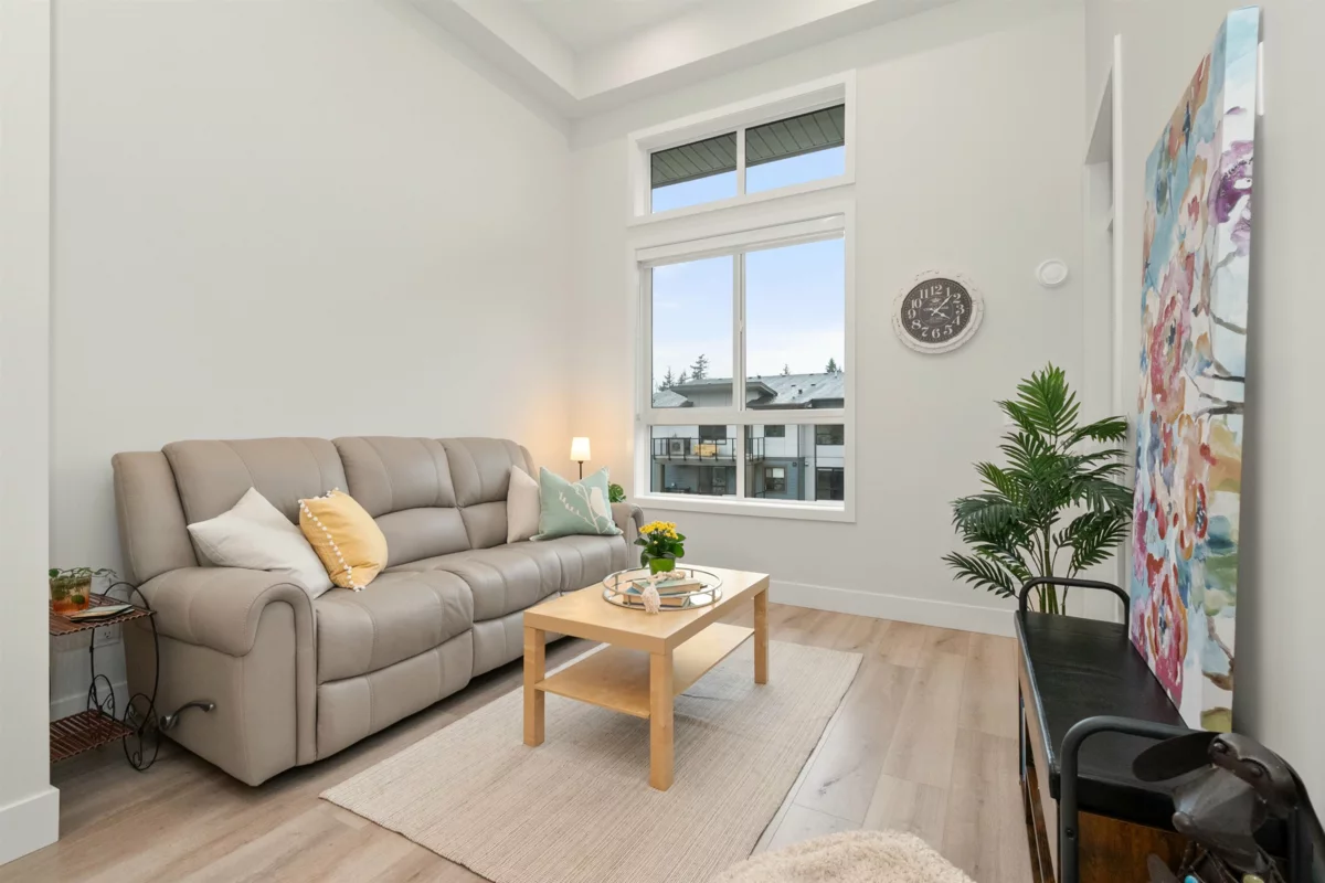 Like new with NO GST! GARRISON CROSSING PENTHOUSE one-bed + den (or 2nd bdrm) condo in the highly sought-after York Residences! This modern & airy home features soaring ceilings, abundant natural light, in-suite laundry, SS appliances, quartz counters, & 3 A/C heat pump units for year-round comfort in the Liv Rm, Bdrm, & den. Spacious covered balcony with breathtaking mountain views. Secure underground parking and storage locker. Steps from vibrant shops, restaurants, and essential services, & a short stroll to schools & university and Vedder River Trail, this location offers the very best of lifestyle and walkability. Whether you're a first-time buyer, downsizer, or savvy investor, this home is an incredible chance to experience everything this thriving community has to offer!