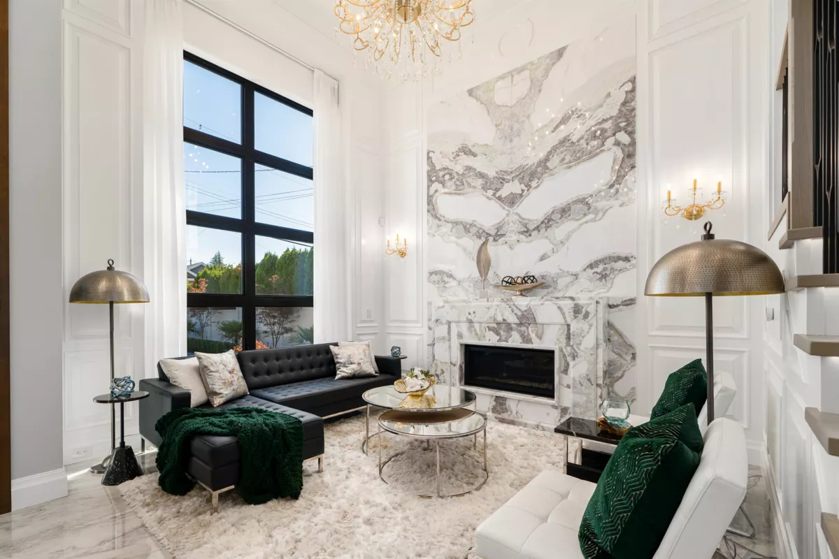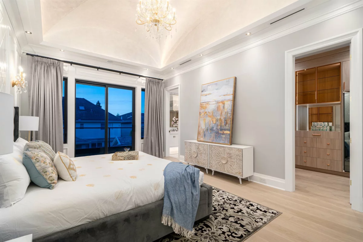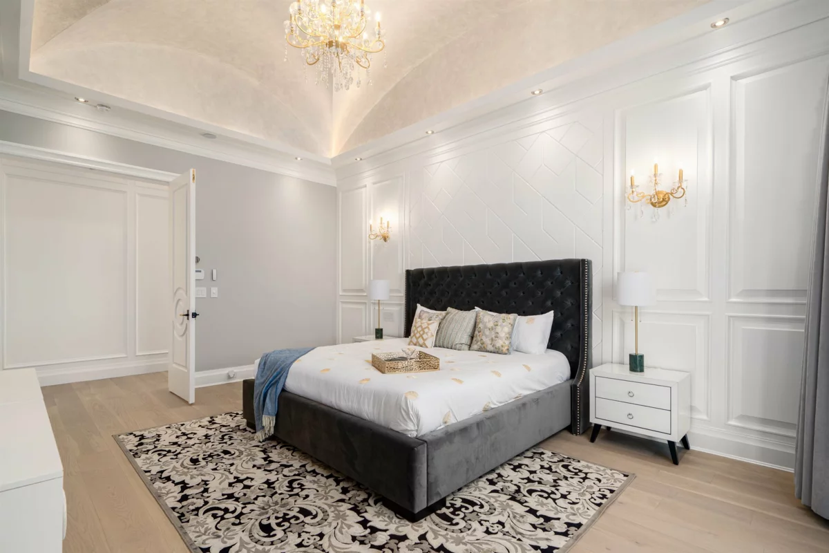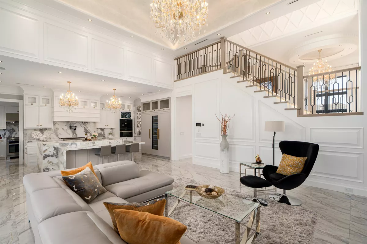 Elegant and luxurious custom home in prestigious Granville area! North–South facing with a grand foyer featuring a stunning circular ceiling design and artistic wall accents. Italian marble flooring throughout, adorned with dazzling chandeliers. Spacious family room boasts a soaring vaulted ceiling, custom marble wall panel, and a warm fireplace. Gourmet kitchen with European marble countertops, top–tier Miele appliances, and premium cabinetry. Two master bedrooms, one with an expansive sundeck; all four upstairs bedrooms include walk-in closets. Legal suite below. Smart home system with motorized curtains, A/C, HRV, Hikvision intercom. Enjoy a fully equipped media room with wet bar, plus a private sauna. A true masterpiece for the discerning buyer!