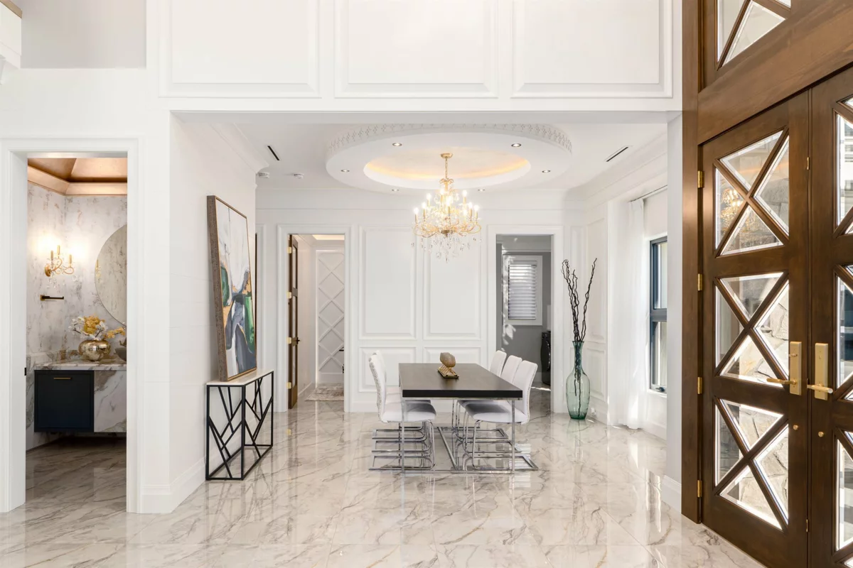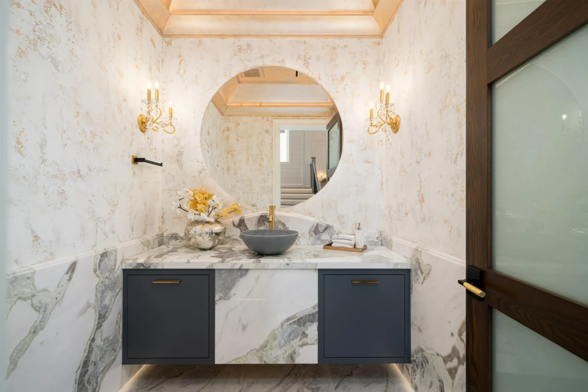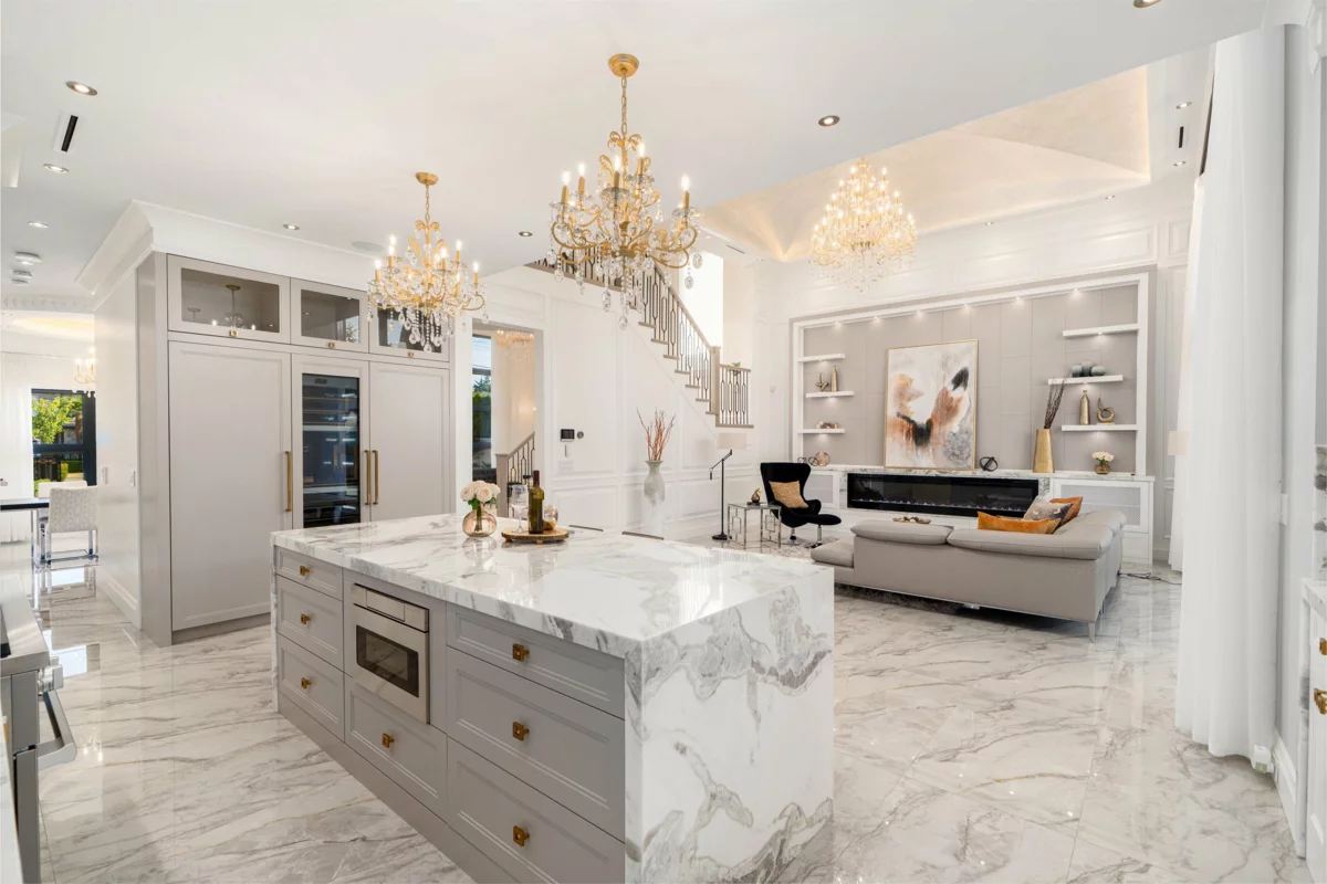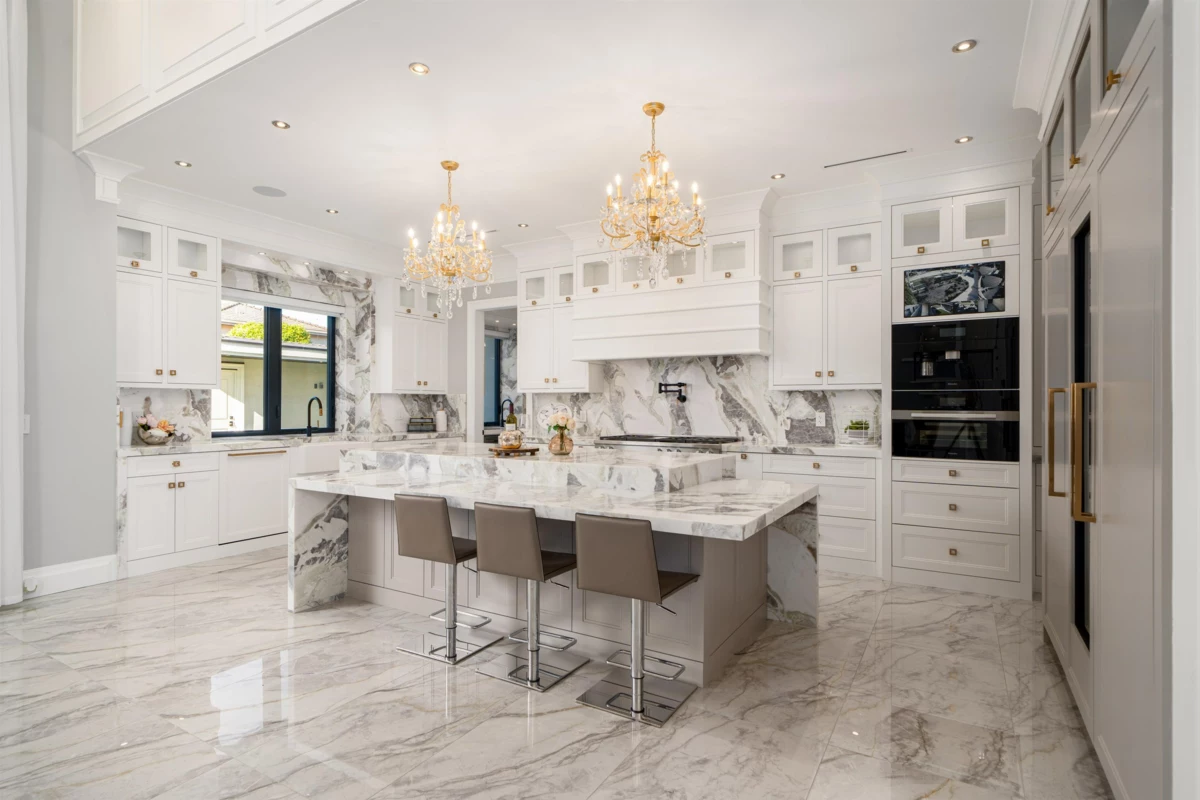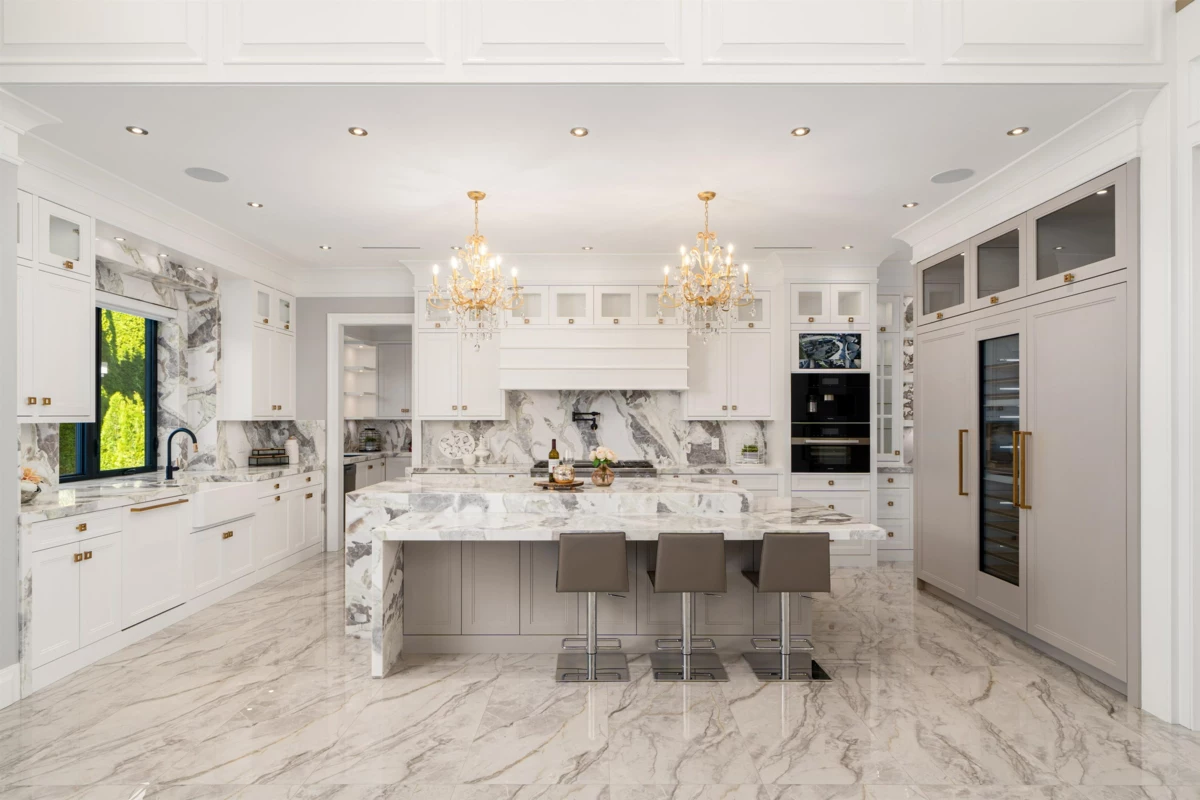 Elegant and luxurious custom home in prestigious Granville area! North–South facing with a grand foyer featuring a stunning circular ceiling design and artistic wall accents. Italian marble flooring throughout, adorned with dazzling chandeliers. Spacious family room boasts a soaring vaulted ceiling, custom marble wall panel, and a warm fireplace. Gourmet kitchen with European marble countertops, top–tier Miele appliances, and premium cabinetry. Two master bedrooms, one with an expansive sundeck; all four upstairs bedrooms include walk-in closets. Legal suite below. Smart home system with motorized curtains, A/C, HRV, Hikvision intercom. Enjoy a fully equipped media room with wet bar, plus a private sauna. A true masterpiece for the discerning buyer!