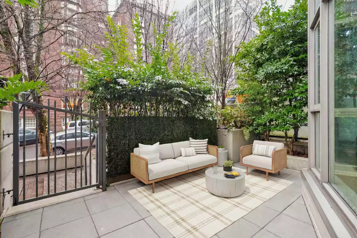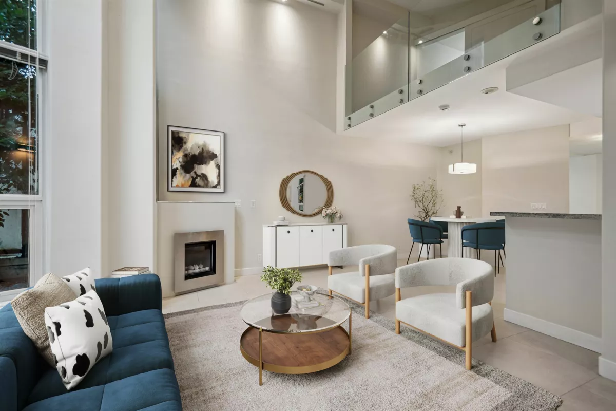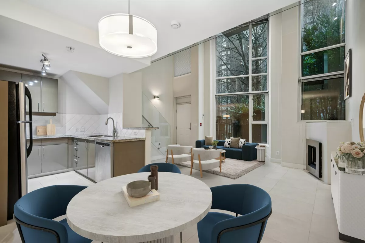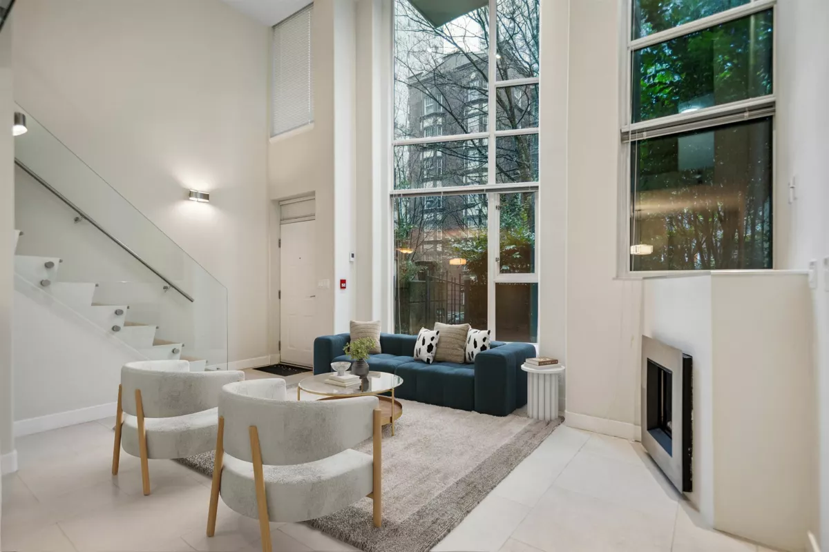 Discover elevated living at Classico in this oversized 1 Bed + 2 Bath loft-style townhouse, offering impressive scale and modern elegance across two thoughtfully designed levels. Contemporary finishes enhance an airy open-concept layout, highlighted by soaring 17-ft ceilings and an abundance of natural light throughout. The main level features a versatile den ideal for a home office, while the upper level offers a spacious flex area perfect for a lounge or workspace. Enjoy seamless walk-out living to a generous, sun-filled gated terrace on a quiet tree-lined street. Complete with 1 parking stall + 1 storage locker, amazing same-floor amenities including fitness facilities and a pool. Perfectly situated in the heart of Coal Harbour, just steps to the seawall, parks, shopping & restaurants.