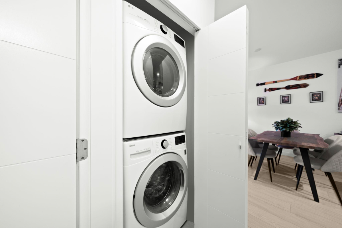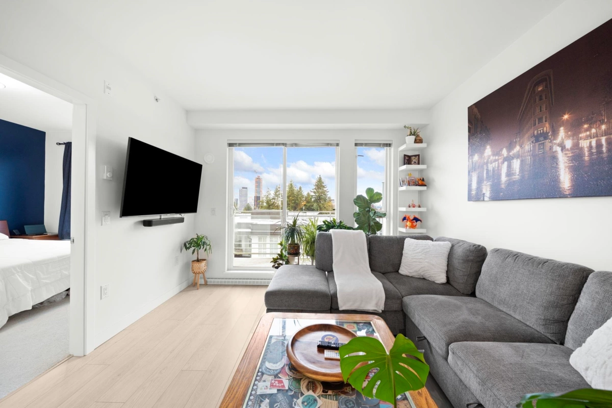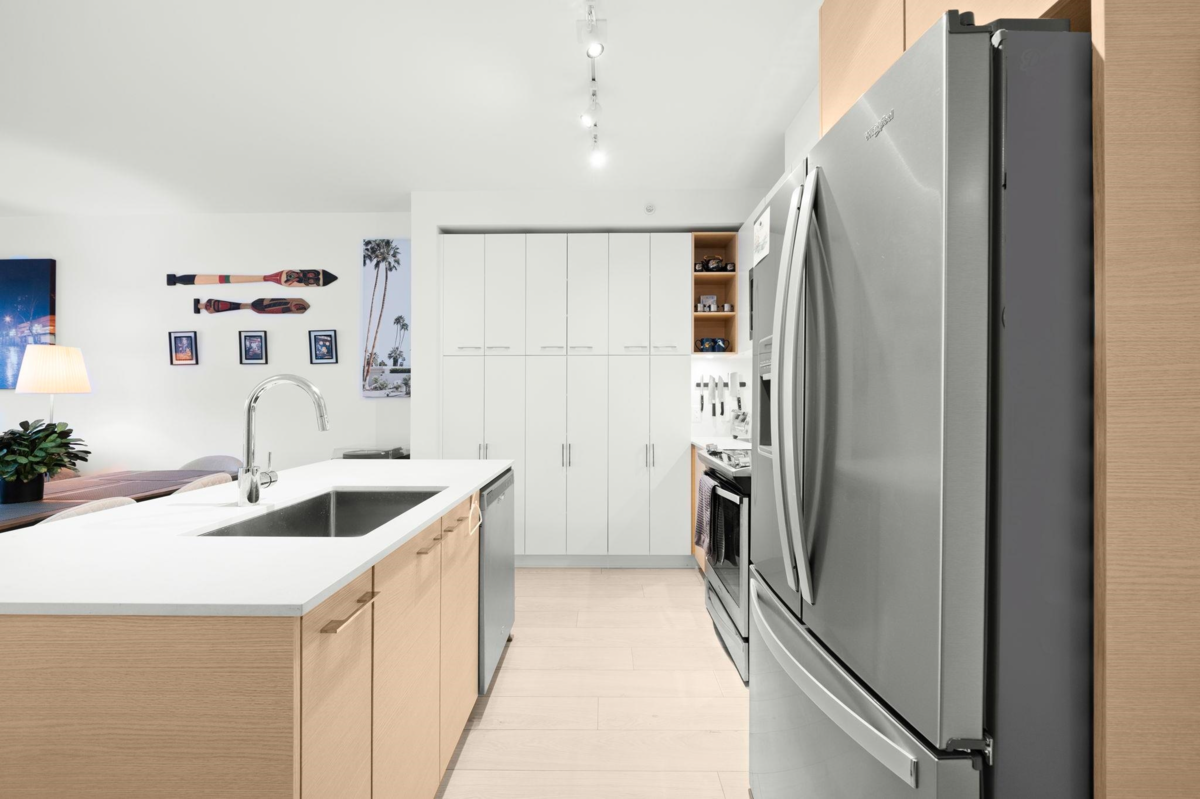 Upscale 1-bedroom + den, 1-bath penthouse condo in the heart of City Centre. This beautifully maintained home by Porte Homes features floor-to-ceiling windows that flood the space with natural light and showcase a bright, open layout. The modern kitchen is perfect for everyday living and entertaining, offering stainless steel Whirlpool appliances, sleek cabinetry, quartz countertops, and a convenient breakfast bar. Enjoy hosting in the sun-filled living area or step outside to the generous balcony to take in breathtaking city and mountain views. The bedroom is airy and comfortable with ample closet space, while the spacious den easily adapts to your lifestyle. Includes 1 parking stall and storage locker. Building amenities include a gym, yoga studio, social lounge, outdoor terrace, and gar