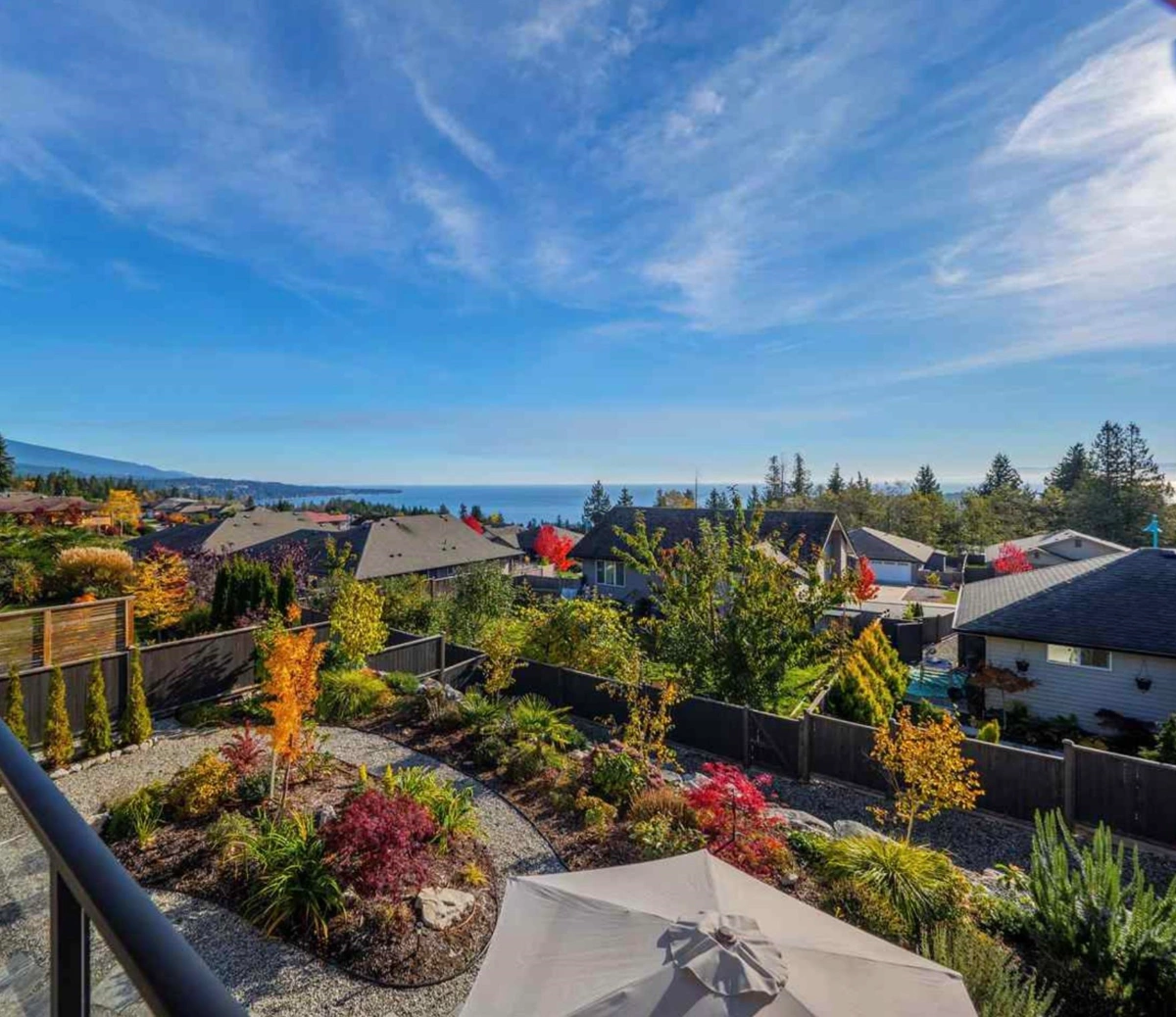 Huge ocean view from this lovely 4-bedroom home in upper West Sechelt, boasting level-entry main floor living with a full walk-out basement (easily suited). Featuring vaulted ceilings, an open-plan layout, a spacious kitchen with granite counters and an oversized island perfect for entertaining. The wide plank flooring and gas fireplaces in both the living and family rooms create a warm, inviting atmosphere. Enjoy breathtaking panoramic views from Davis Bay to the Trail Islands from your oversized sundeck, primary bedroom, family rooms and kitchen. Highlights include a gorgeous mature landscaped yard with irrigation, new heat pump & A/C on the main floor, a retractable awning for indoor-outdoor living. This meticulously cared for home is located just moments from the amenities of Sechelt.