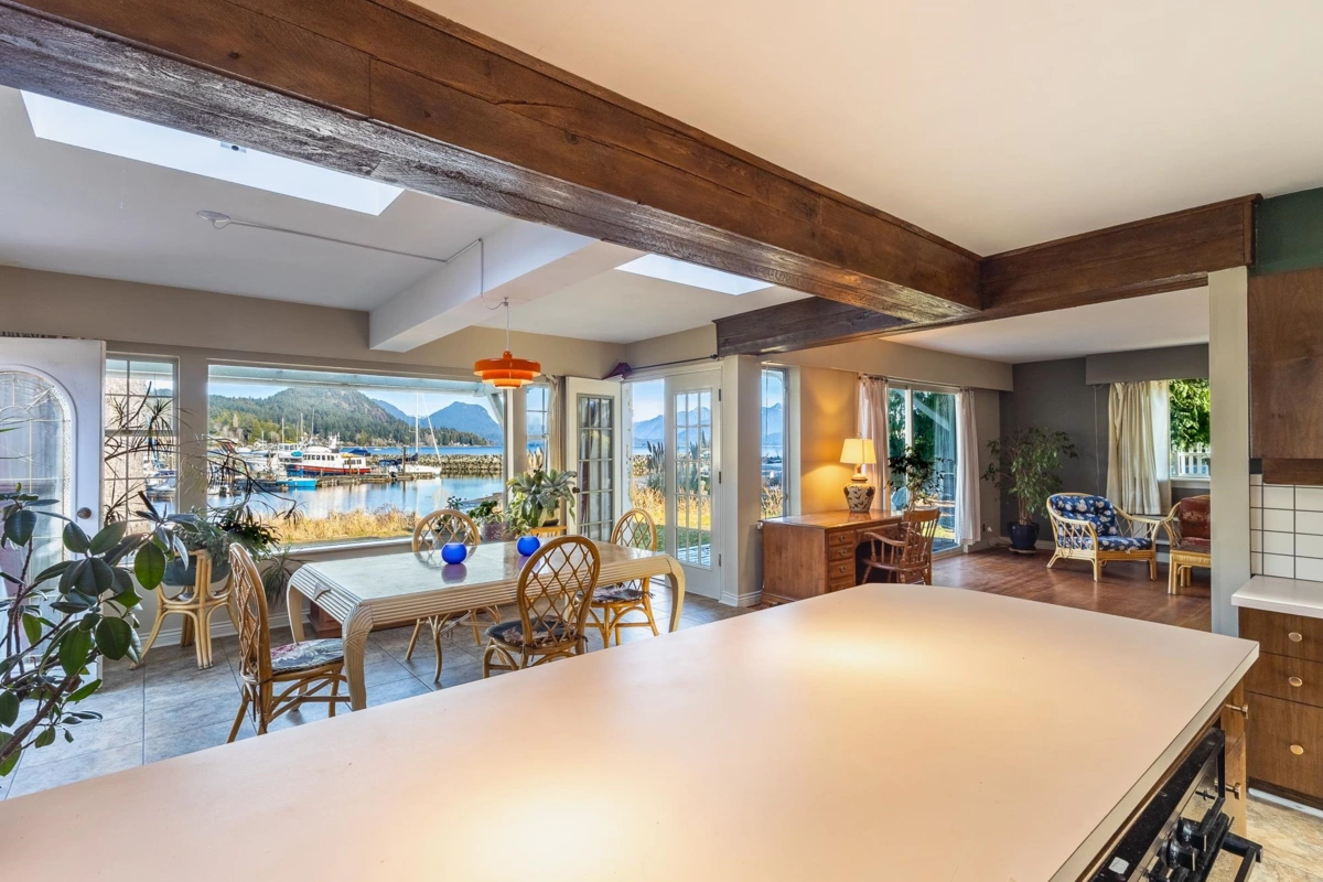 Rare low-bank waterfront home with multiplex development opportunity in the heart of Gibsons. This expansive corner lot and home fronts directly onto the Gibsons Marina, offering stunning ocean, island, and coastal views. New zoning allows for up to six Small-Scale Multi-Unit Housing (SSMUH) dwellings, up to two waterfront residences, a multi-unit project, or a combination of these. Just steps to Lower Gibsons, the public wharf, restaurants, shops, and the Gibsons Public Market—everything is easily walkable. The existing 1,400 sq ft, four-bedroom home features a wood-burning fireplace, generous living and dining areas, and a waterside deck. Well maintained and offering excellent holding value, this is one of the most versatile and desirable waterfront parcels in Gibsons.